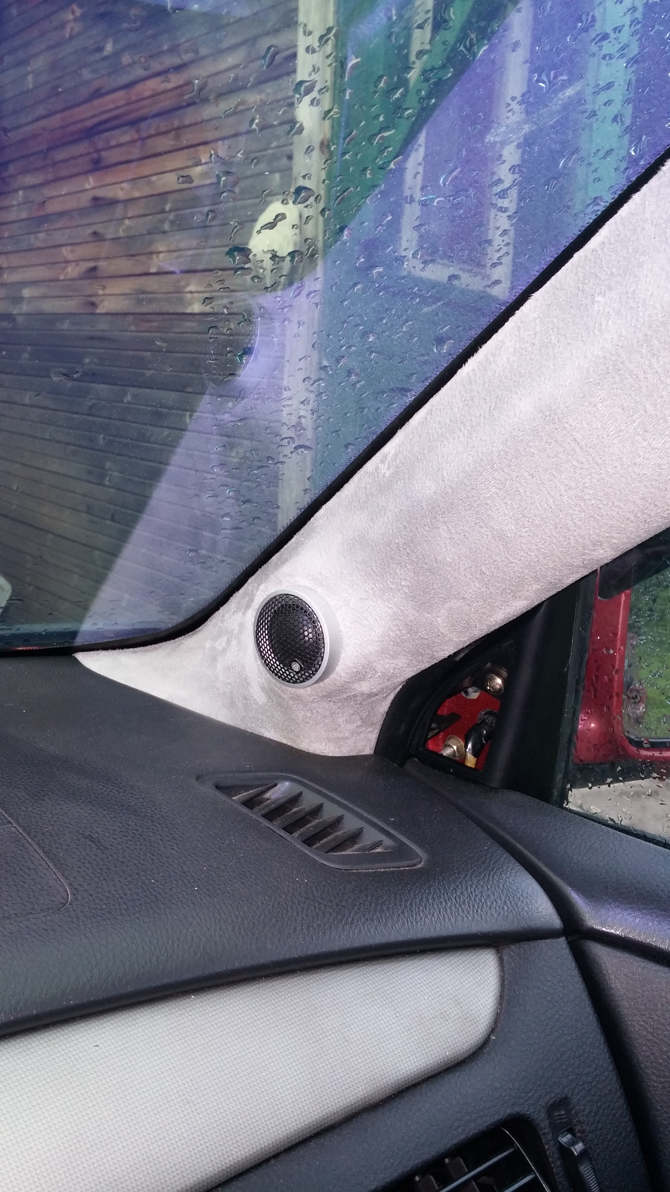 Подробно не делал, там все просто, делаем кольца под нужный размер динамика, ширину взял чтоб вышли из обшивки. Дальше накидываем обшивку делаем центральное отверстие, и вырезаем по диаметру колец отверстие в обшивке. Ну и всё дальше смола и как можно меньше шпакли точнее шпакля только на финишное выравнивание, под покраску. Я когда первый раз всё собрал было много шпакли и мало смолы в итоге на середине громкости стекловолокно треснуло)). Пришлось переделывать, вообще я добился что на полной громкости посторонних вибраций в обшивке нет, а на штатном крепеже на середине громкости весь пластик ходуном ходил. Вот есть одна фотка с кольцами это так сказать макет.