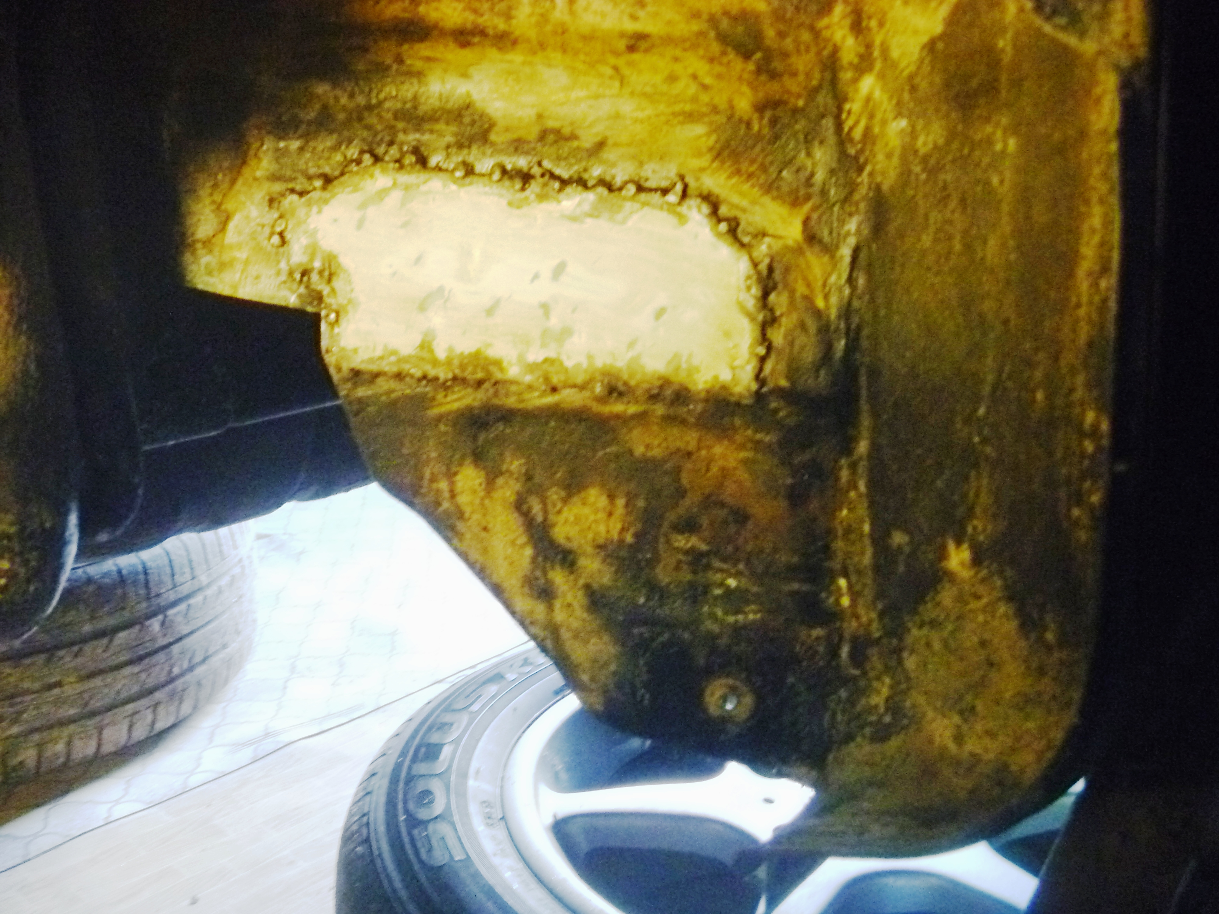 Про гниль передних арок уже писано на форумах . Проблемы в задних арках открылись случайно , когда захотел подновить заводской антикор . С правой стороны было заметное вспучивание и отслоение покрытия . Убирая гниль , проковылял дырку в багажник. Слева , на первых взгляд , было всё красиво , кроме тоненькой трещины антикора на месте нахлёста металл. брызговика на стенку багажника . Чуть ковырнул и там пришлось местному рукодельнику Иванычу накладку прихватывать . Хорошо хоть , до сквозной коррозии в багажник дело не дошло , вовремя пресёк . И ещё неприличные виды . Последний - это пол багажника над выходной банкой глушителя . Про нейтрализатор , грунт , антикор время в этом посте отнимать не буду . |