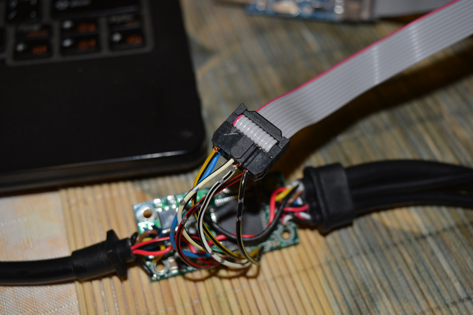 Далее подсоединяем все это к ноутбуку. Питание на контроллер никакое дополнительно подавать не нужно - одно подается с программатора прямиком на процессор (5вольт).