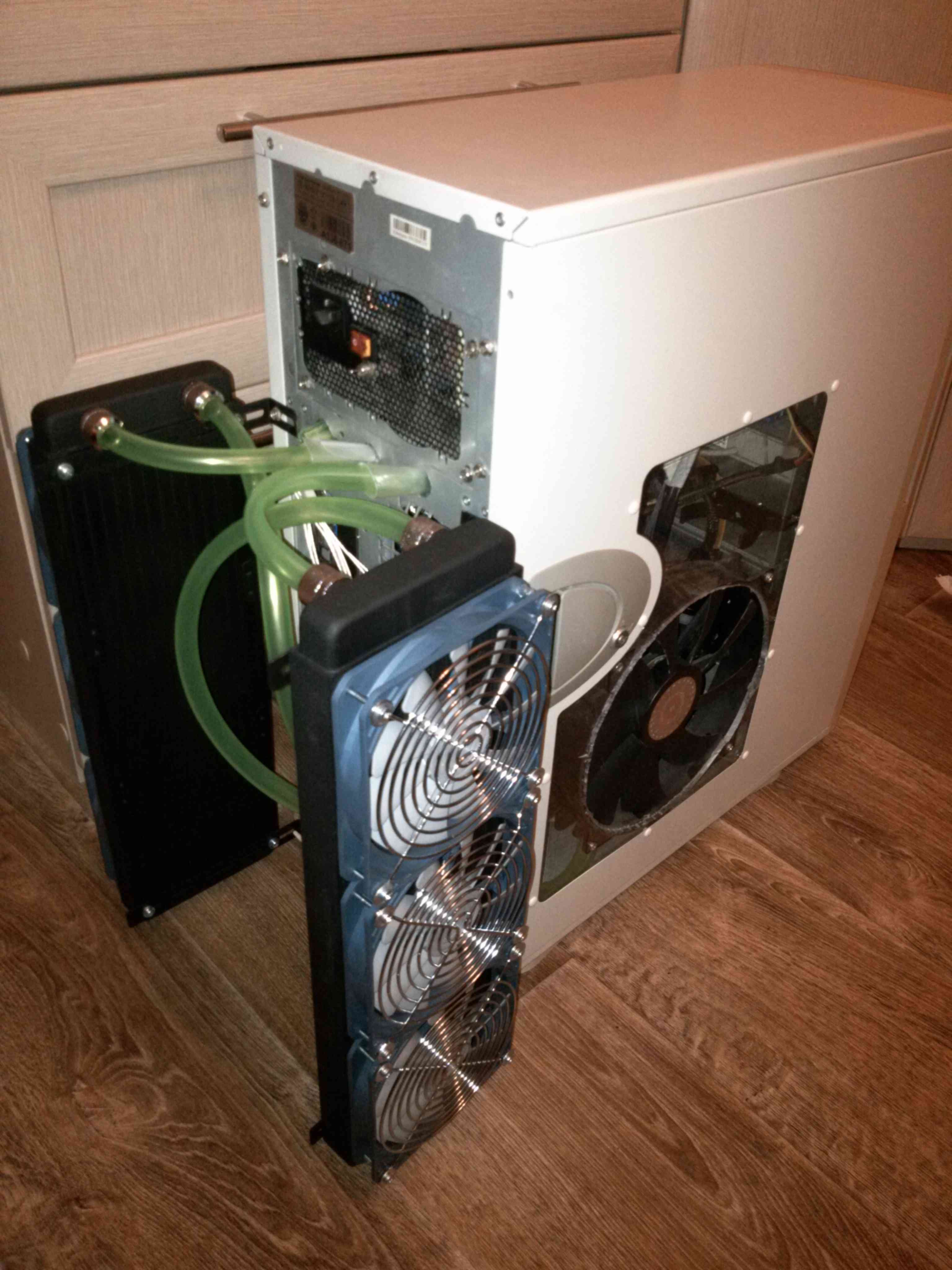 Вентиляторов стояло 5 шт. 80*80*25. На проце 90*90*25 с тепловыми трубками. Корпус использую Chiftec. Первая замена была - 1 вентилятор 200*200 в боковую стенку. Второй 120*120 в корзину дисков. (все 80*80 убрал) Стало тихо. Но процессор Core i5 2500 в пике показывал 70-72 градуса. Видеокарта Asus GTX760 в пике 80-82 градуса. (на видюхе 2 куллера 70*70 в стоке) При этом шум поднимался от куллеров проца и видюхи (выходили на 70-100% оборотов). Решил понизить общую температуру путем установки водяного охлаждения. Купил 2 радиатора R360. Позволяет установить 3 куллера 120*120. Общий теплоотвод 300вт с одного радиатора. Один на видюху и один на процессор. Крепеж к ПК придумал через кронштейны. Вентиляторы 120*120*20 с PWM управлением 4pin купил 7 шт. |