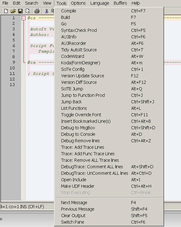 1. В ранее созданной папке, нажимаем на пустое место и тыкаем правой кнопкой мыши. 2. В меню выбираем Создать и из выпадающего списка выбираем AutoIT V3 Script (ну или что то похожее) 3. Новый файл называем Script_1 (имена используем с латинскими буквами, пробелы заменяем нижним подчеркиванием) (расширение файлов скриптового языка AutoIT . au3) 4. Если в первом уроки все делали по инструкции то просто открываем, кликнув два раза мышкой, если нет то правой кнопкой мыши и из меню выбираем Edit Script 5. Открывается редактор и видим примерно такую картину. 6. Что мы видим - сверху в окне редактора - меню File / Edit / Search и т.д. (повторяет меню обычного текстового редактора, за исключением пары пунктов, об этом чуть позже.) - слева цыфирки от 1 до 13 - это строки кода, вещь нужная и полезная. - В основном окне где мы пишим зеленые букавки, это коментарий. Коментарий вещь полезная и нужная (мы можем оставлять пометки, например после написанной строчки кода или в заголовки с описанием скрипта) Коментарии бывают двух видов: ; точка с запятой, все что далее после нее в приделах одной строки! это и есть коментарий (в редакторе зеленый цвет шрифта) #cs и #ce - это зарезервированные слова, все что между ними коментарий, первой идет надпись #cs потом #ce (обычно применяют для закоментирования большого числа строк) Коментарий обычно используют, для того что бы оставить подсказку в коде или временно не выполнять часть кода. 7. Текст коментария чуть отредактируем (я буду показывать то что должно получится.) Код #cs ---------------------------------------------------------------------------- Script Name: Мой первый скрипт #ce ---------------------------------------------------------------------------- ; Script Start - Add your code below here 8. Открываем пункт меню Tools - для запуска на выполнения скрипта , есть пункт меню GO (мы не будим использовать меню для этого просто запоминаем что необходимо использовать клавишу F5 ) - Если необходимо прирвать скрипт то есть пункт меню Stop Executing (пользуем горячии коавиши - Ctrl + Break) 9. Не забываем что горячии клавиши будут работать только в том случаи если окно редактора активно!!! тоесть сперва мы тыкаем в редактор потом уже пробуем нажимать!! 10. Нажимаем F5 11. В нижней части появляется окно дэбагера (там мы видим иныу по тому как отработал скрипт) 12. Рассмотрим последнию строку Код >Exit code: 0 Time: 0.670 Exit code: 0 - значит что ошибок выполнения нет. Time: 0.670 - время выполнения скрипта. 13. Не забываем что то что закоментировано, компилятор пропускае, в итоге для компилятора мы запускаем пустой файл. ДЗ На выхи не задаю, не зверь же (IMG:style_emoticons/default/smile.gif) )) |