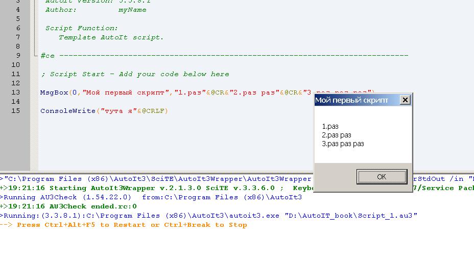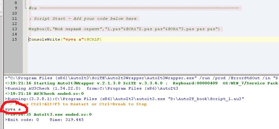 Кол-во скачиваний: 4077. Сново запускаем наш скрипт на компиляцию с параметрами. в поле с иконками, справа, тыкаем на кнопку и выбираем иконку. все остальное по умолчанию. - и нажимаем снизу слева кнопку, Компил скрипт - появляется небольшое окошка, после того как доходит до 100% все вобщем готово (на быстрых ПК можно не заметить (IMG:style_emoticons/default/smile.gif) )) ) - рядом с нашим скриптом появится исполняемый файл с тем же именем но с расширением .exe (вот мы и скомпилировали) - при запуске Script_1.exe мы увидим наше окно, но не увидим надписи "тута я", исправляем.... 8. Открываем снова наш скрипт, и меняем строки местами. получаем Код ConsoleWrite("тута я"&@CRLF) MsgBox(0,"Мой первый скрипт","1.раз"&@CR&"2.раз раз"&@CR&"3.раз раз раз") 9. Сохранили и снова заходим в компилятор с опциями. - как видим путь до нашей иконки сохранен и теперь нам ненадо сново ее выбирать (в скрипте сверху все прописано само) - все оставляем так же, но 4ртый пункт о котором говарил ранее - выбираем. - компилируем и запускаем видим примерно следующее как видно появилось черное окно, в нем наша надпись, что мы передаем в поток но кодировка у меня кривая. пока скрипт работает оно не закроется. Если мы не поменяли строки местами в скрипте, то появилось бы окно MSBox, в окне будит пусто, потом мы тыкаем OK следущая наша команда в поток отпраялет текст и скрипт сразу завершится, то есть мы нечего неуспеем увидить. P.S. Кирилица в консоли может не отображаться по многим причинам, так что пользуем латиницу. Если у вас на компе отображает нормально, то это не значит что на другом все будит ОК. P.S2 При работе скрипта, в треи (рядом с часами панелька, где значки маленькие) будит значек скрипта, необходимо его убрать. Для этого первой строкой в скрипте будим всегда писать #NoTrayIcon -------------------------- ДЗ------------------------------------- - Открываем Азбуку - Вторая вкладка Указатели (типа поиск) - находим и изучаем ConsoleWrite Sleep - на первой вкладке Содержание находим раздел - Указатель макро, там 4 подраздела - изучаем все, пробуем пользовать. ------------ ЗАДАЧА изобразить так же! ![]() номер версии и год это не текст, а системные переменные!!! |