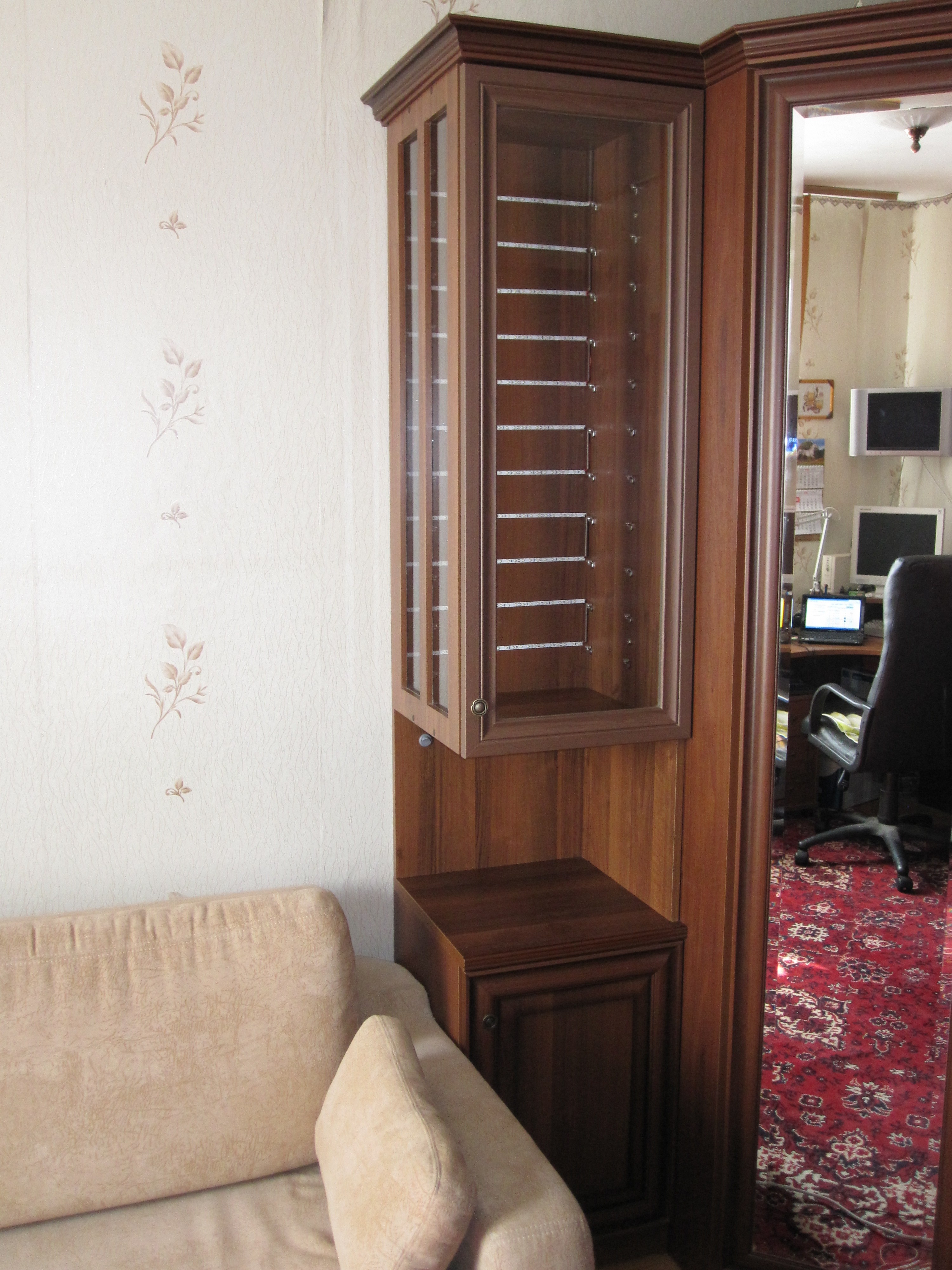 Я являюсь жертвой одного увлечения – коллекционирование масштабных моделей автомобилей. (IMG:style_emoticons/default/dh.gif) А для них всегда нужно место. Лучше спец. стеллаж с защитой от пыли. У меня они стояли крайне безобразно Это все равно, что оставить машину во дворе на недельку-другую под проводом, на котором постоянно сидят птицы. (IMG:style_emoticons/default/48ea048c0f07.gif) Но мысль о создании гаража для моего «автопарка» не давала покоя. И однажды я воскликнул «Эврика!» (IMG:style_emoticons/default/j2.gif) - родилась идея. Итак. Имеется угловой шкаф и прикроватная тумбочка. Задача: сделать надстройку на тумбу, но так, чтобы «как тут и было». Излазил кучу форумов мебельщиков и накачавшись информацией начал воплощать задуманное. Самое сложное было найти ДСП, чтоб в цвет. Искал месяц, но нашел. Заказал «распиловку» по моим размерам и довольный поехал в сторону дома. Фрезером в боковой стенке выбрал отверстия под смотровые окна и откромковал. Затем заказал стекла для полок и боковой стенки, купил фурнитуру (эксцентриковые стяжки, конфирматы и всякую мелочевку, а также все для подсветки). Присадку всех отверстий сделал собственноручно. (IMG:style_emoticons/default/co.gif) И вот уже «вытанцовывается» Конструкция притянута эксцентриками к тумбочке и межсекционными стяжками к шкафу. Стекла для полок имеют прозрачную кромку. Получил полезный побочный эффект от подсветки – этакое интимное освещение заливает всю комнату. Над тумбочкой появился ночной светильник Дальше начались поиски конторы, которая сделает фасад по индивидуальным размерам из профиля нужного сечения и цвета, и чтобы все было в наличии (мытарства длились 2 месяца, но опять-таки успешно). И вот наконец-то навесил заветную дверцу, завершил композицию карнизом (благо остатки имелись) Кажется задача «шоб как тут и було» выполнена. (IMG:style_emoticons/default/sun_bespectacled.gif) Елочка, зажгись! (IMG:style_emoticons/default/ny3.gif) В целях ограничения доступа пыли: Стекла в боковой стенке вклеены на 2-х сторонний скотч и законтрены держателями для зеркал снизу и сверху. А проем по периметру проклеен мебельным шлегелем. Долгожданный переезд автопарка в гараж (IMG:style_emoticons/default/yahoo.gif) : Все очищены от слоя пыли И расставлены на полки Чуть-чуть крупным планом Спасибо всем за внимание и отдельная благодарность деду, который с малолетства растил мне руки нужной стороной из правильного места Ваш JF. (IMG:style_emoticons/default/rolleyes.gif) |