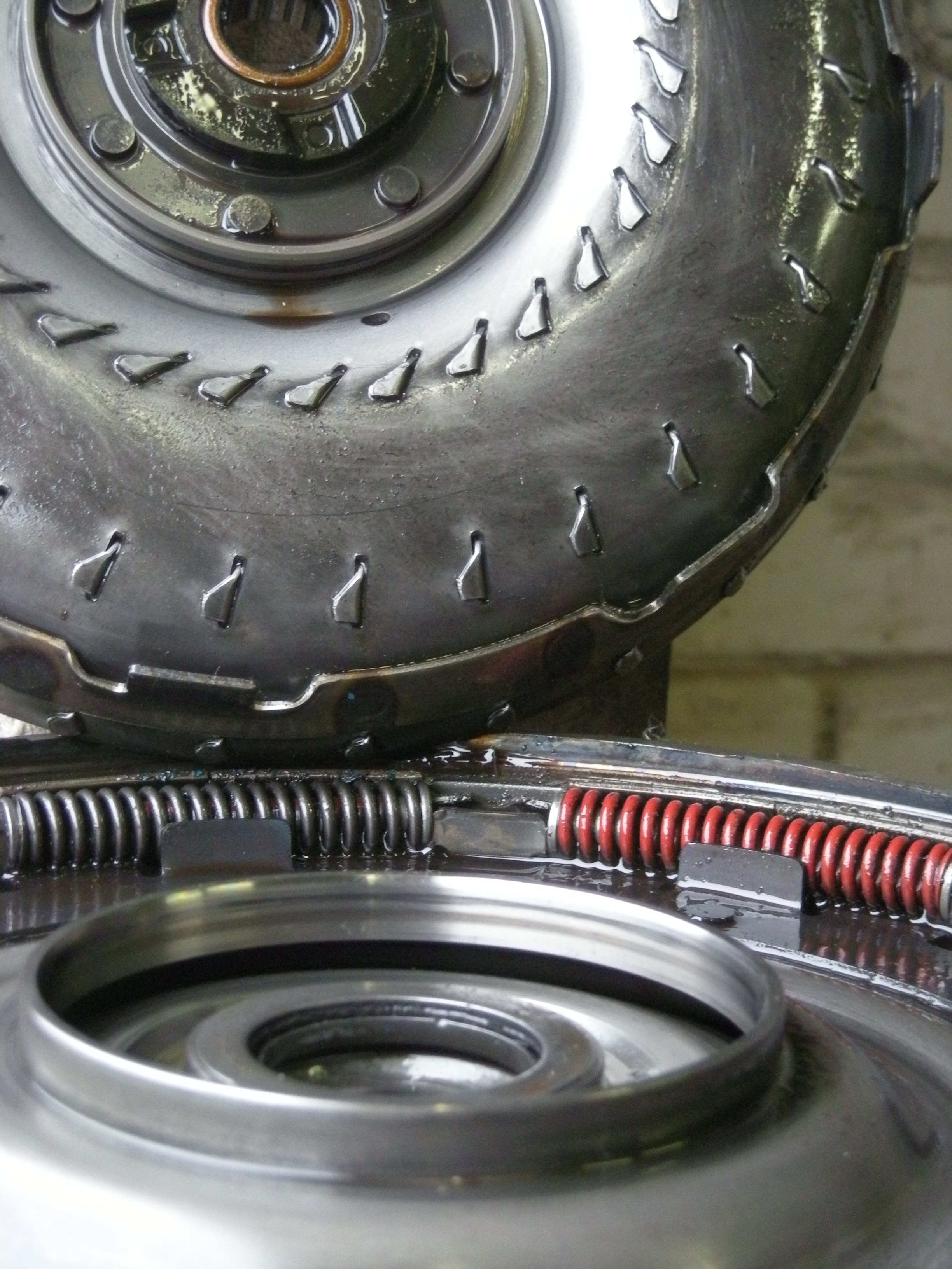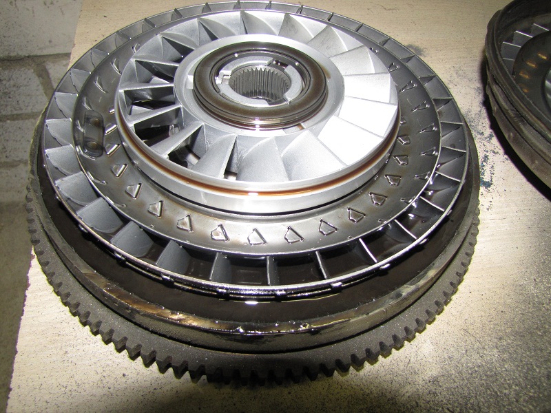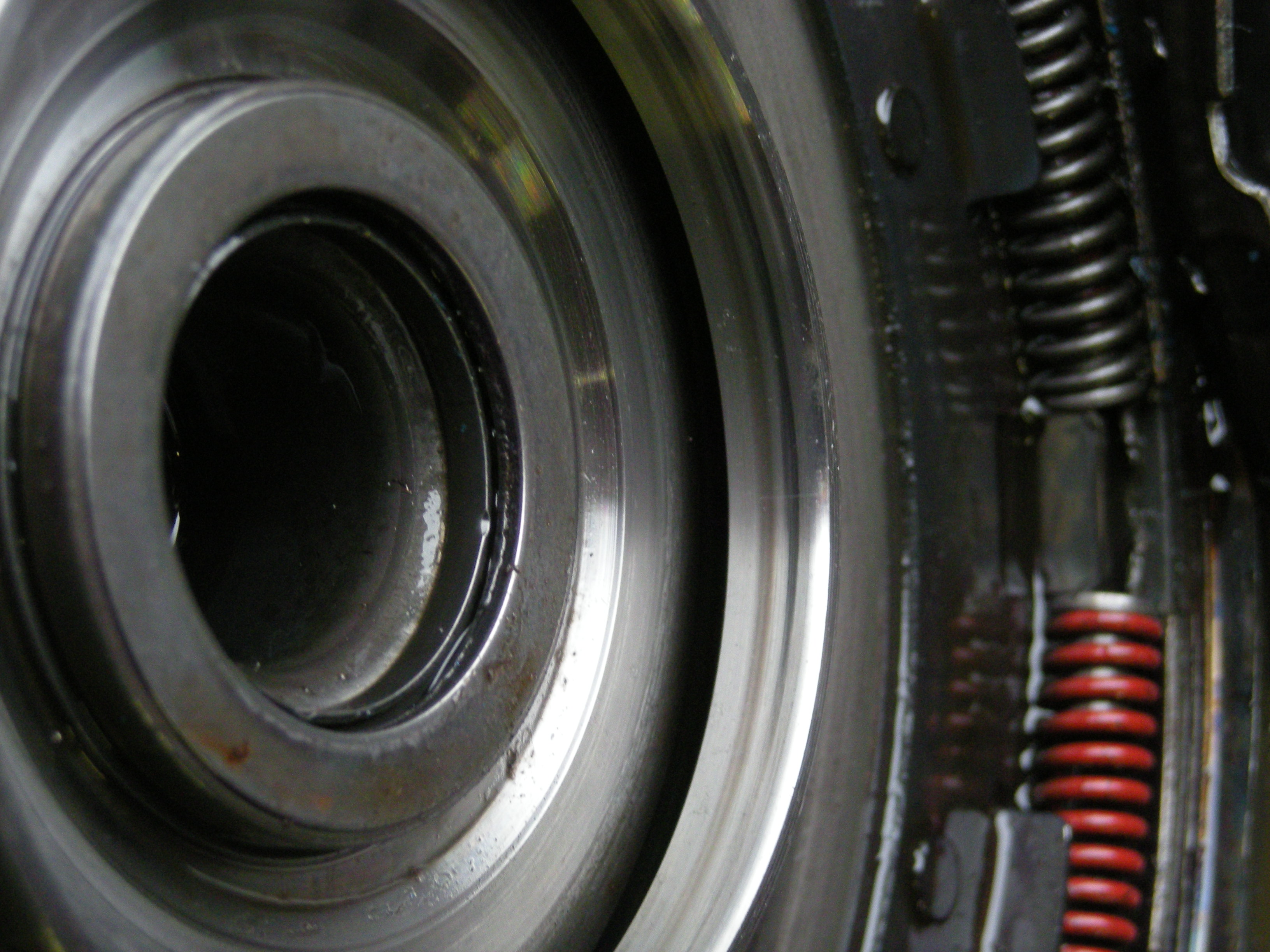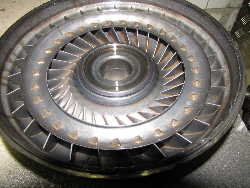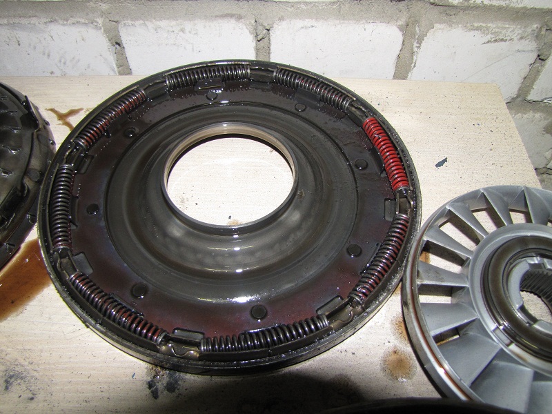 Когда срабатывает соленоид отвечающий за блокировку ГТ , давление в нем поднимаеться и через отверстия в турбинном колесе АТФ загоняеться между ним и диском с фрикционом. Снаружи сальником диска служит сама фрикционная накладка.Диск сдвигаеться по турбинному колесу и прижимаеться к внутренней поверхности ГТ. Пружины на диске выполняют функцию пружин на диске сцкпления в МКПП и жестко свазаны с турбинным колесом. Внутренняя поверхность поршня с фрикционной накладкой. Манжета и отверстие для подвода АТФ в турбинном колесе Наглядно видно как все собираеться. |