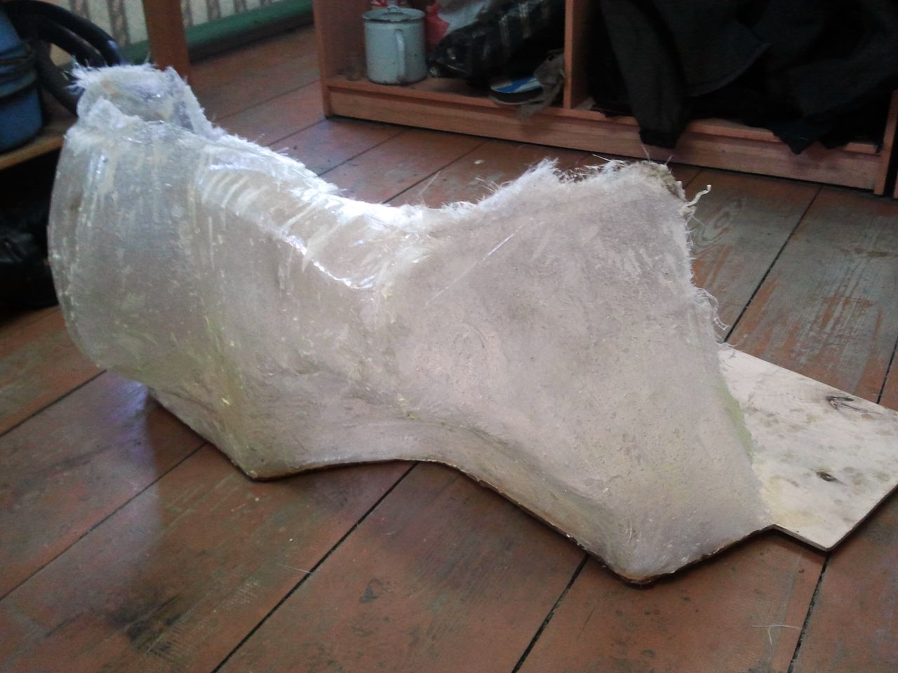 Купил у знакомого полиэфирную смолу 3л и отвердитель 30 г. (концентрация готового 1к1000 - разводить порциями по 100-200 мл., отвердитель вносить шприцем) и стекломат 0,6 кг. = 600 рублев. Снял обшивку, обклеил ее малярным скочем, вырезал по форме пол из фанеры и прикрепил к нему обшивку. Затем нарезал стекломат кусками 20х20 см и понеслось. Кисточку в руки - заляпал все "по мокрому" в три слоя (как объяснил мне парень продавший мне материалы). Подождал 24 часа. Отвердело. Отделил обшивку (отделялась очень хорошо). Получил вот такую конструкцию. Кстати очень прочная вещь. Как будет время продолжу работу. Мне нужно сделать корпус ЗЯ 35л. +-2 л. |