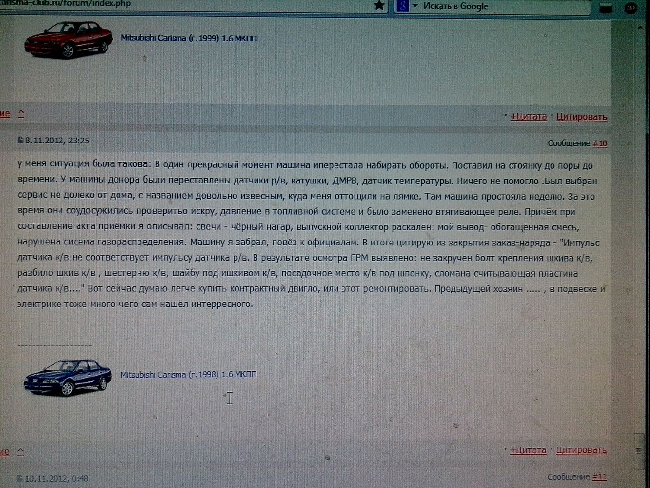 Ездил на диагностику к Меку с проблемой двигателя (на холостых колбасит мотор, стреляет в глушитель, долго заводится или не спервого раза а раза со второго с третьего, динамика разгона не изменилась) началось все буквально с недели две назад. Ремень менялся два года назад (30к км на нем прошел) притензий к ремню нет. Диагностика показала проблемы с ГРМ (во впуске кстати давление показывает 42кПа), метка выставлена не правильно. Выставили по положению поршня в ВМТ, потаму-что по меткам не ровно стоит, изменений нет. Загнали на подъемник разбираться с ГРМ, сняли ремень ГРМ и тоже обнаружили что шестерня приводного ремня ГРМ имеет люфт примерно 1-1,5мм. Принесли со склада новую шестерню, она имеет такой-же люфт!!! Т.е. там мне сказали что это выработался коленвал =((( хотя видимых следов износа я не увидел, все как новое. Решили выйти из положения, подложив между шестерней и валом пластинку удалив люфт. Все собрали и снова на диагностический пост, все тоже самое без изменений давление во впускном на моем авто не изменилось как и со всеми остальными проблемами. Отпустили меня с богом и приказали искать новый или б/у распредвал что-бы поискать причину, но это уже совсем другая история (трудности поиска запчастей на мотор 4G13). Буду скидывать голову и отдавать ее на дефектовку и ремонт если это будет необходимо. А вот и видео с люфтом шестерни Видео |