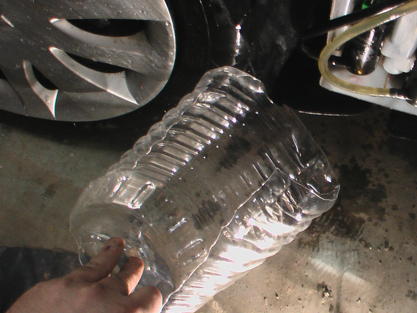 Через эту прорезь большое количество грязи попадает прямо на мотор-насосы омывателя и их проводку, что, учитывая совершенно дикий химический состав "коктейлей" "Лужкова" и "Матвиенко", не есть гуд. Как всегда, моем все перед работой. Для дополнительной защиты взял простую банку на 5 литров и слегка "приоформил" ее ножом. Не забудьте сделать в ней отверстия для слива воды. Затем одел ее на бачок и зажал под облицовку бампера. |