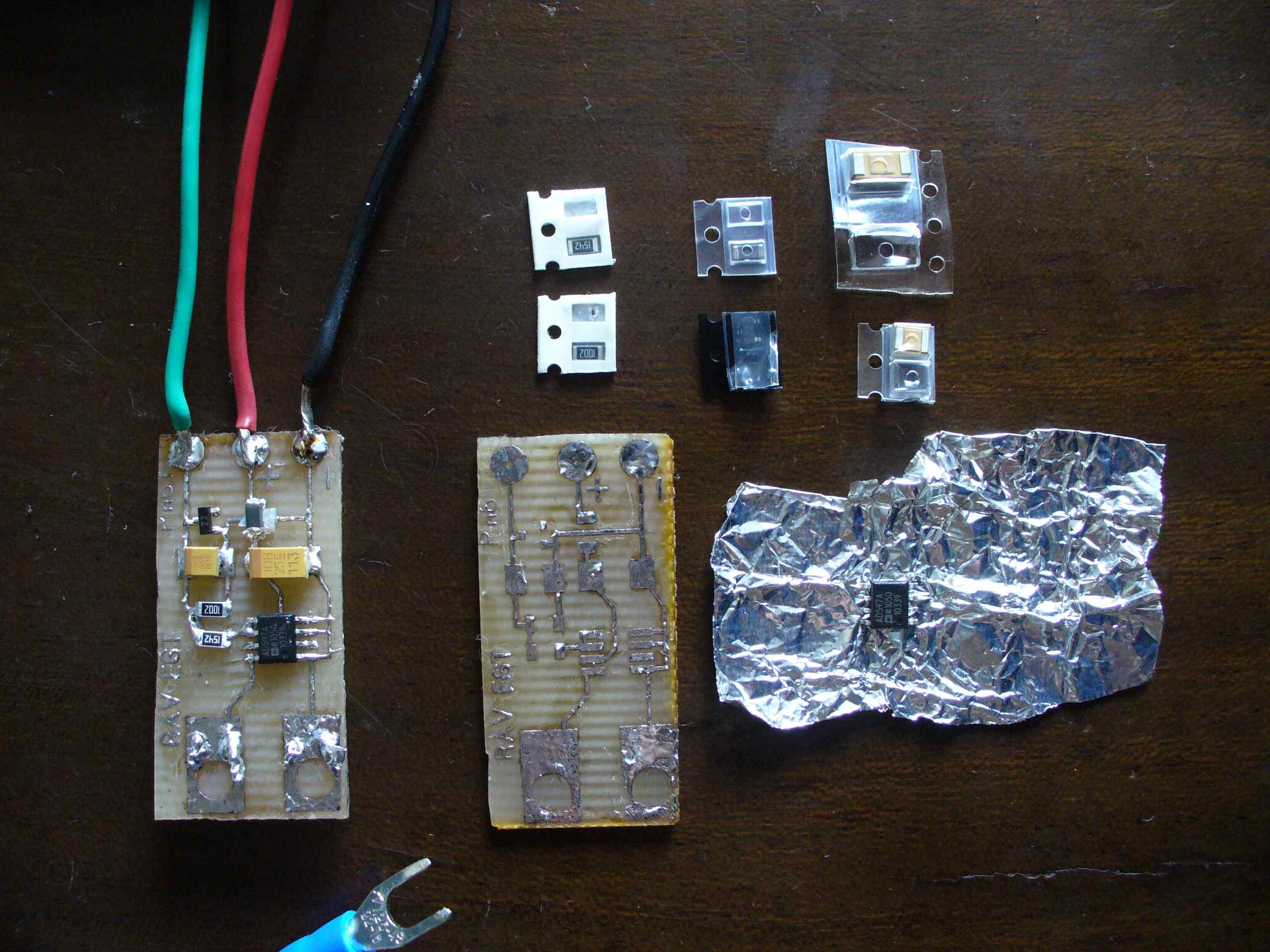 Кол-во скачиваний: 1092![]() Плату утюгом делал сам первый раз. Фотобумага Lomond глянцевая односторонняя плотность 160г/м кв. 25 листов. Пробовал распечатать на 3х принтерах. Всех лучше получилось на лазерном цветном Самсунге 1200*1200 (хороший жирный черный цвет). Распилил текстолит, почистил шкуркой нулевкой -что бы блестел, вырезал шаблон из бумаги, раскалил утюг по максимуму - прогладил. Одна получилось хорошо, вторая чуть чуть не прогладилсь (гладить до проступления сквозь бумагу жирных пятен равномерных). В холодной воде бумага пальцами скручивается легко. Тонер пристал хорошо!! Травил в хлорном железе 15-20 гр с водой 1:3 (будет около пол стакана) По времени заняло 4 часа. Исчезание пошло с краев к центру. Промыл, покрыл все спиртоканифолью и залудил все дорожки. Ну и за 10 мин. запаял. (провода взял от БП компьютерного старого -на концах его фишки хорошо втыкаются на пины в ECU) Детальки Сопротивления: 1002 - 10000 Ом 1542 - 15400 Ом Кондеры танталовые. 106 это номинал 10000000 пФ = 10 мкФ, 25Е - напруга 25 вольт. На втором маркировка 105 - то есть 1 мкФ, вольтаж тоже 25В Полоска с одной из сторон этих кондеров обозначает плюсовой вывод! Диод BZX84C5V1 - правый нижний пин не используем. Ферритовая бусина - BLM31PG601SN. Главная микруха AD597. Сразу говорю разводку платы и пайку делаю раз в пятилетку (IMG:style_emoticons/default/biggrin.gif) (сильно не пинать) Под ферритовой бусиной провел массу, когда уже паять стал подумал, а вдруг на бусину замкнет +на - . Во время пайки подложил малюсенький кусок целофана под бусину - перестраховался. Временно напаял концы термопары на платку (для проверки), потом просверлю и буду сажать на болтики. Саму платку залью в эпоксидку. Подключил + и - на ECU, сигнал на 61 пин. В EcuEdit на MUT39 формула x*4.902. поправил в файле Logdefs_Evo.xml При включении логгера заработал сразу же, показал комнатную +25. Потом зажигалкой догнал до +420. Дальше не стал -зажигалка перекалилась. (набирает температуру медленно, надеюсь на двигателе побыстрее будет) В live map еще не проверял но думаю работать будет так же хорошо. Осталось купить сверло и метчик для нарезки резьбы (засверлюсь и нарежусь сразу в коллектор без всяких наварок гаек). Дима напомни какая должна быть резьба ?? Дальше в приобретении и освоении LC-1. |