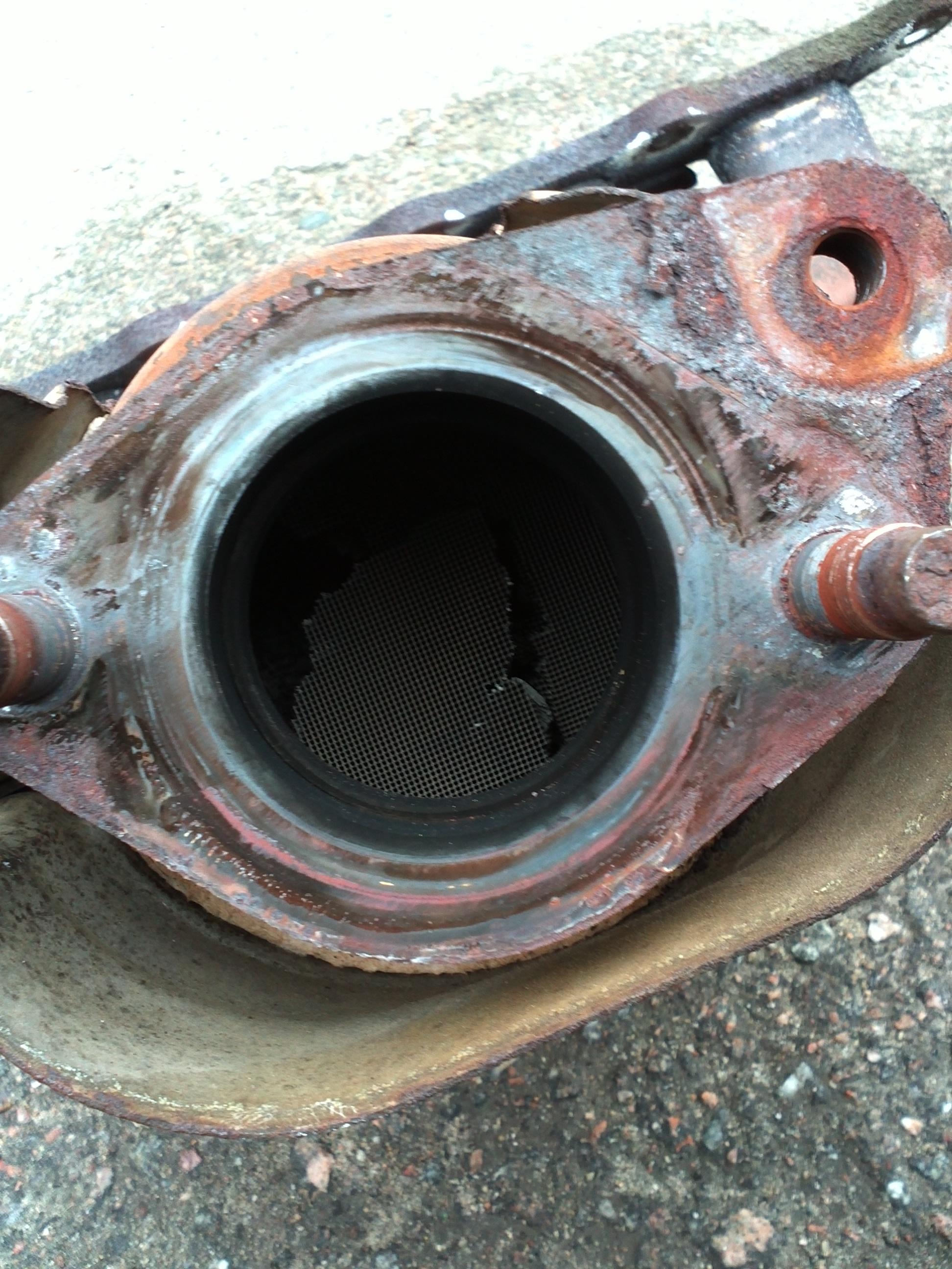 итак, начитавшись и посмотрев ошибку чека(плохой прогрев катализатора), решился на выбивание, сразу скажу, про то что снять все быстро и легко!! хрен там, 2,5 часа на снятие выпускного коллектора, все гайки прикипели, так же ржавчина, половина гаек не отвернулось, а вывернулись вместе со шпильками, ну короче я победил его, снял! (IMG:style_emoticons/default/co.gif) (IMG:style_emoticons/default/co.gif) смотрю во внутрь мать моя женщина, а там капец, на фото видно!!!! (IMG:style_emoticons/default/comando.gif) выбил кат, ушло 10 минут, прикрутил ообратно, скинул ошибку и о чудо авто поехало без затупов, правда через 90 км. вновь чек загорелся, но это поправило в слудующие выходные полезу с паяльником , либо найду сервис где программно отключат 2 ЛЗ., ну и готовлюсь к выбиванию второго ката, во дворе не удобно, надо на яму ехать!