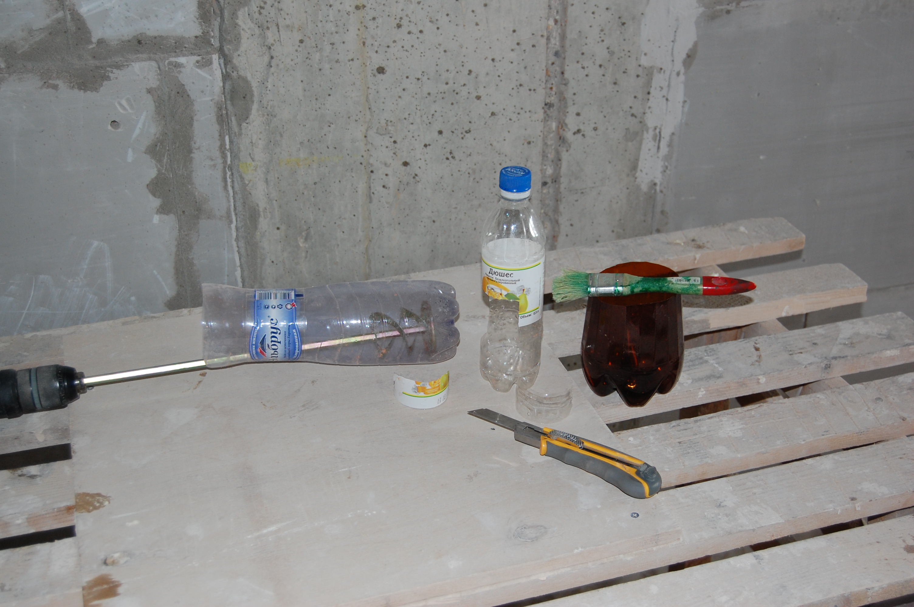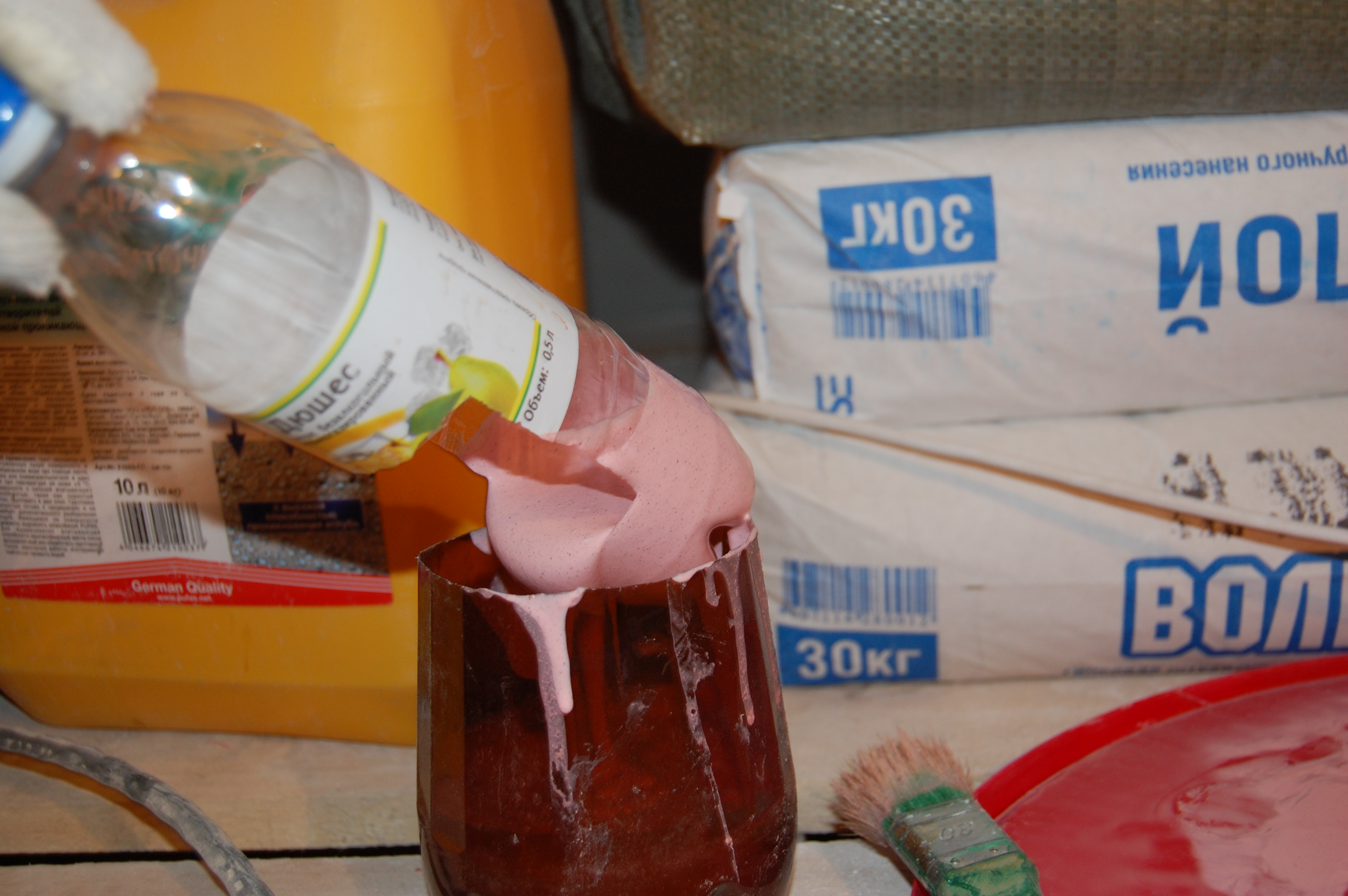 На вторую проблему - перпендикулярности стен решил забить. Ибо пришлось бы либо перекладывать стены возведённые застройщиком, либо сжирать место в квартире. Поэтому просто разметил линию возведения стен от межквартирной перегородки с помощью рулетки на полу и отвеса на потолке. Ну а далее по инструкции. По линии натягиваю разметочный шнур. По всему периметру будущей стены накатываю ( накатка производится с усилием снизу вверх, вниз валик просто скатываем ) валиком Бетонконтакт ( этот грунт у всех производителей имеет специально красноватый цвет, чтобы видно было качество нанесения ), предварительно подняв кварц со дна 20 литрового ведра мелким ( чтобы не выплёскивался ) миксером. Чтобы не плескать Бетонконтакт из 20 литрового ведра в лоток, потом облизывая стенки ведра, сделал себе следующее черпало: |