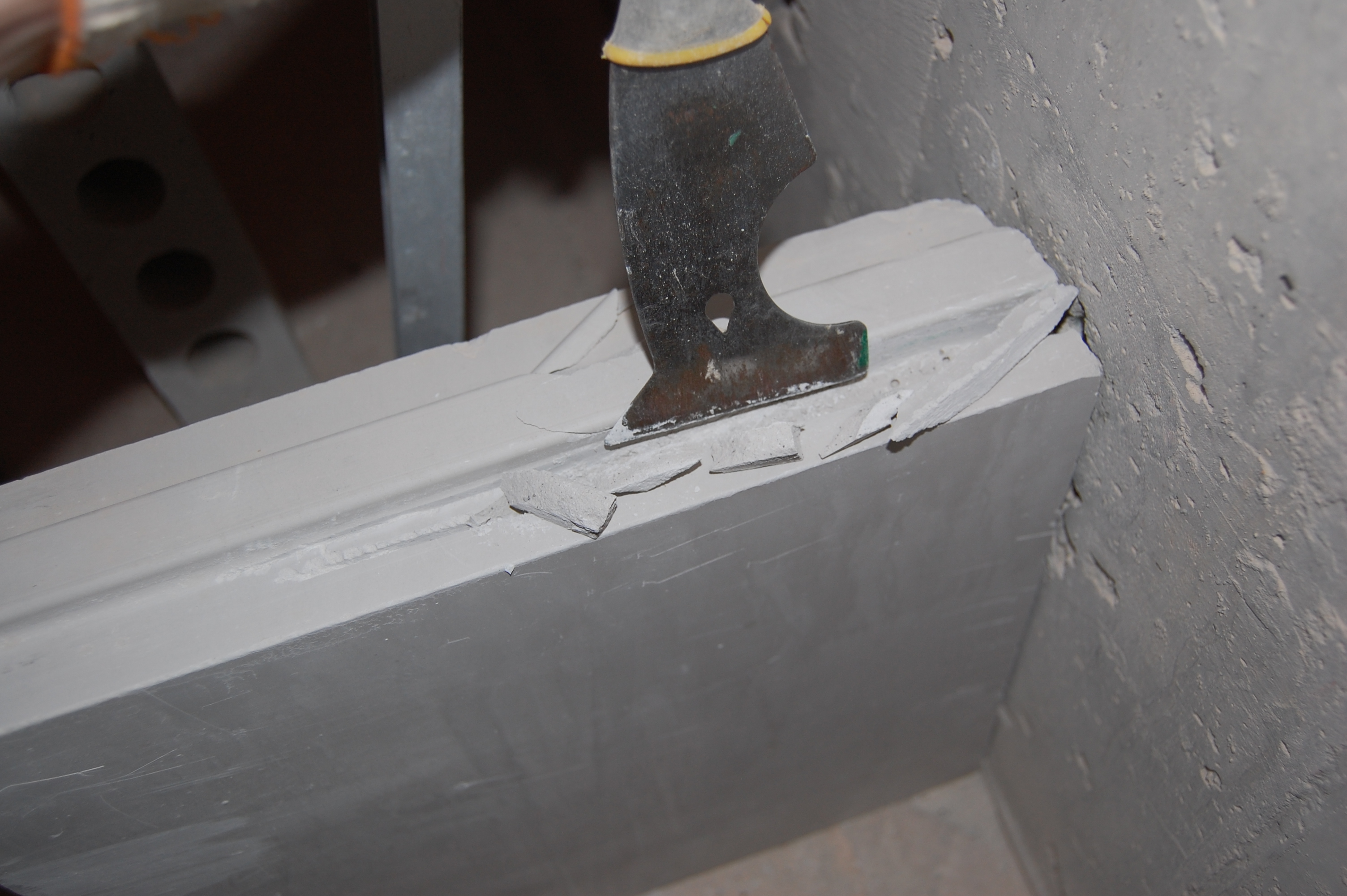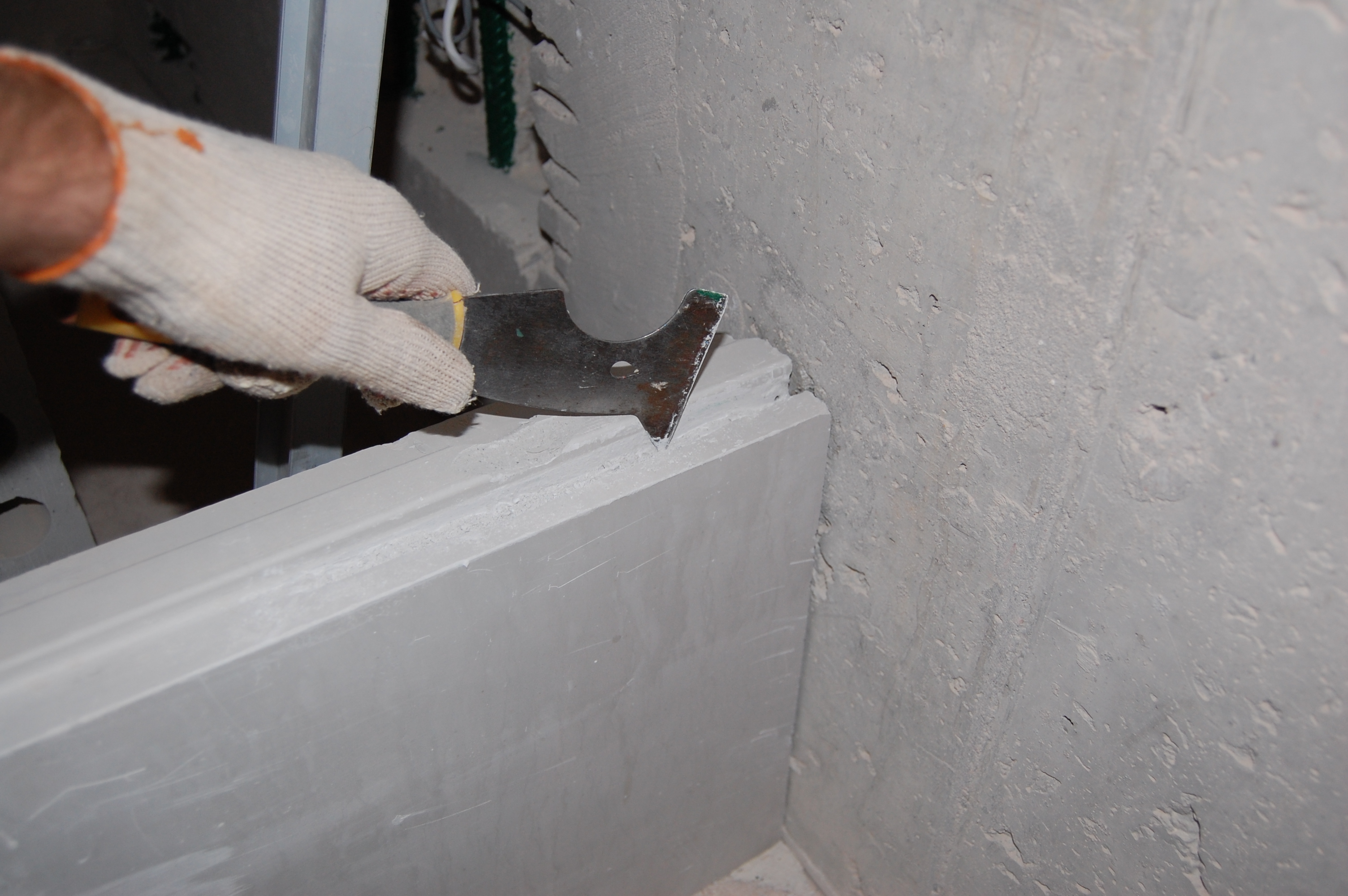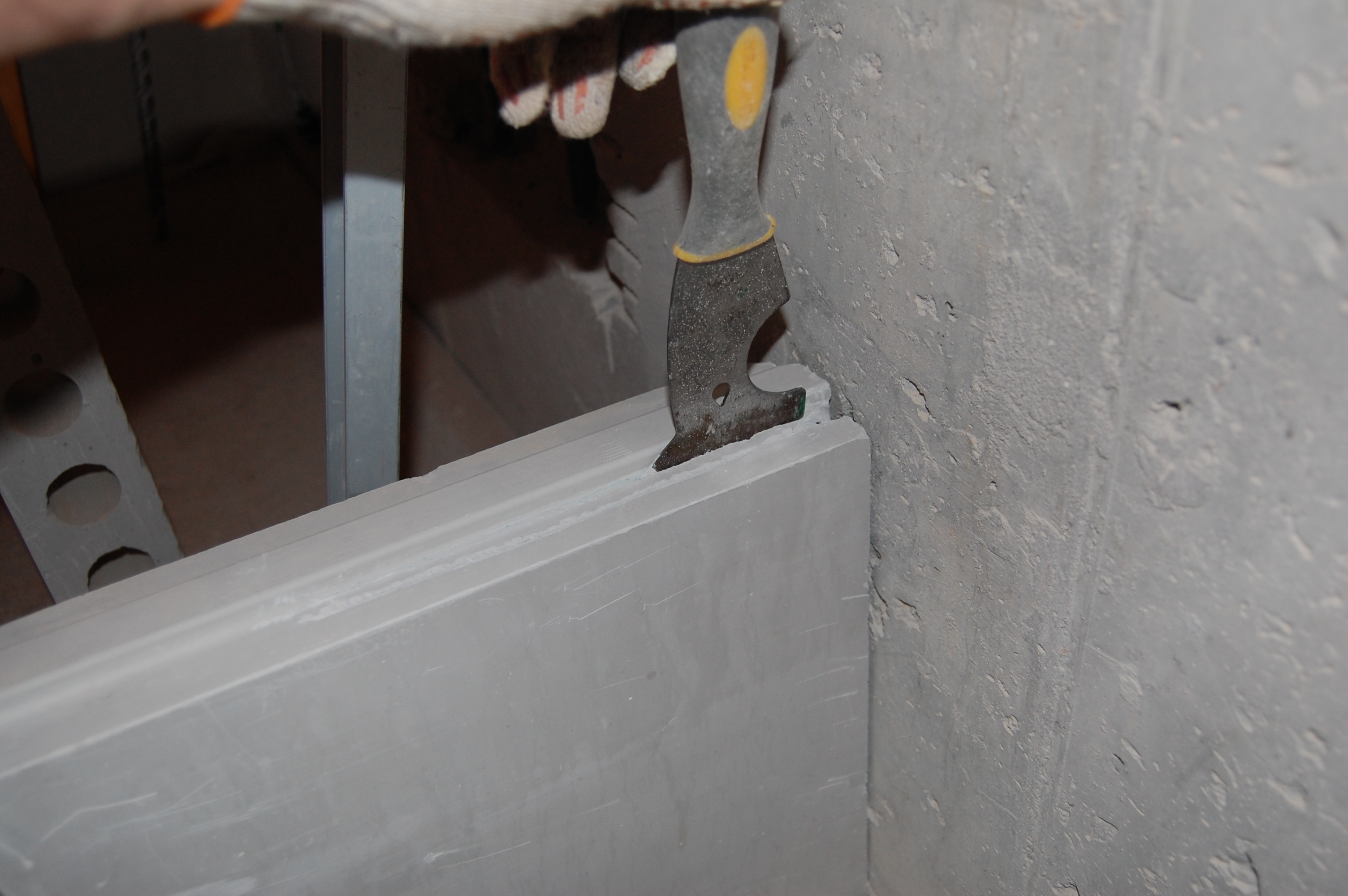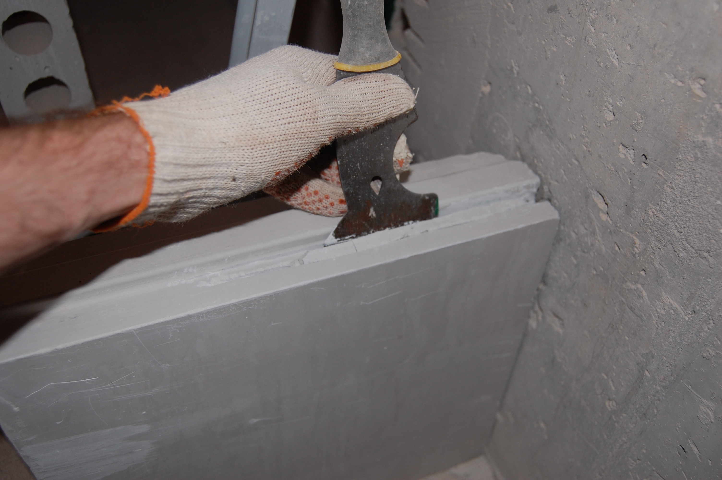 Режем в блоке могилку для арматуры, чтобы арматура полностью в нём утонула. Наверно этот многофункциональный шпатель один из самых насилуемых мной инструментов (IMG:style_emoticons/default/biggrin.gif)