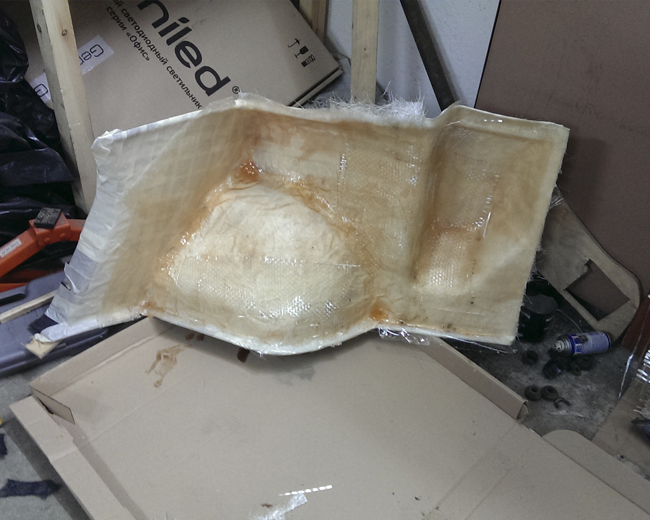 Выглядел он так Сразу прошу прощения, за не полный фото отчет, не всегда было удобно фотографировать все происходящее, а вторая пара рук периодически куда то пропадала) И тут начались танцы с бубном... хочу так или этак... но интернет полон решений и было решено делать из стекловолокна по контуру обшивки багажника. Список того что понадобилось: Скотч малярный - 2 рулона Скотч обычный широкий - 1 рулон Стекловолокно/стекломат - 2 кв.м. Баксидка - 1 кг (1 л.) Фанера - кусок размером 750*750 мм Мастика битумно-резиновая - 0,5 кг. Синтепон - 2 м. Карпет - 1,5 кв.м Балон с клеем - 1 шт. Ну после того как посчитал примерный объем (чтобы хоть чуть чуть попадать под "башку") определил какой глубины должен быть сам коробок. И приступил к лепке стеловолоконного основания: Снимаем обшивку, я решил "извратиться" над правой стороной: Сняли, отлично (IMG:style_emoticons/default/biggrin.gif) Теперь все это обильно заклеиваем малярным скотчем. Насколько обильно? На сколько только скотча хватит! Нам никак нельзя испортить покрытие обшивки в моем случае 3-4 слоя хватило. Выглядит это примерно так: Далее, нам понадобиться обычный скотч. (от него баксидка отлипает куда лучше). Им я проклеивал только края, дабы было проще подцепиться, чтобы проще снять форму задней стенки. После того как все заклеено скотчем, можно приступать к оклейке стеклотканью: Оклеили и забыли на ночь... Следующий день и следующий этап. На этом этапе снимаем нашу форму, от основания. Сняли, обрезали до нужных нам размеров (длина) а так же подровняли стороны (края). Додумыя форму вырезаем из фанеры лицевую сторону - постоянно примеряясь с формой. Сделав лицевую, вырезаем так же основание (пол) и верх (потолок) короба. Соединяем, подрезаем и получаем: Оклеиваем все стыки стекловолокном, пропитываем стыки баксидкой. Опять оставляем на ночь. Вернувшись получаем: Фотографий по зачистки поверхности наждачной бумагой, промазки внутренней стороны битумно-резиновой мастикой к сожалению нет. БРМ (битумно-резиновая мастика) - скажу пару слов, в чем прелесть? При высыхании и застывании становится как единый резиновый слой, ложилось в толщину 2-3 мм, в несколько слоев. Желательно как можно лучше промазать стыки и примыкания фанеры со стекловокном. БРМ высыхает в течении 24-48 часов, как гласит производитель. Но на практике высохло за ночь ( ЧУДО!!!! (IMG:style_emoticons/default/biggrin.gif) b: ) Далее все снаружи оклеивается карпетом и укладываем внутрь синтепон. P.S. Для чего синтепон? Честно говоря, никогда не укладывал его в короб, но без него звучание было отвратительно. Собираем, ставим и проверяем: Если что не так не судите строго, я тут совсем не давно))) позже добавлю фото как все крепилось к кузову, чтобы эта "штука" не каталась по всему багажнику. Надеюсь что кому то чем-то поможет эта небольшая статья. |