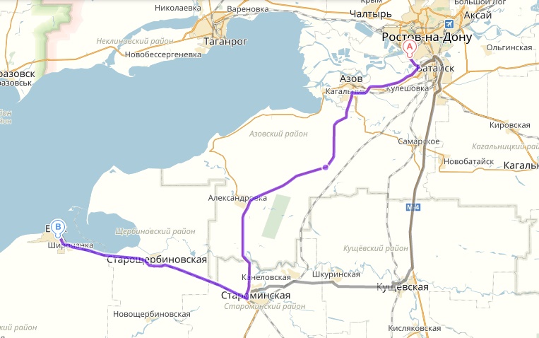 Друзья, может кто подскажет, какой дорогой лучше проехать от Ростова до Ейска? Яндекс предлагает два варианта, первый на 20 км покороче, его яндекс рисует самым быстрым, но судя по всему дорога может быть узкой и непонятного качества. Второй вариант частично по М4, на 20 км длиннее. Во втором варианте еще смущает проезд поста в Цукеровой Балке, ни разу там не был, но наслышан (IMG:style_emoticons/default/smile.gif) Прилагаю скрин, фиолетовым первый вариант отмечен, серым второй. Что выбрать, как лучше проехать? Через Азов не суйся! Дороги нет! Только направление... |