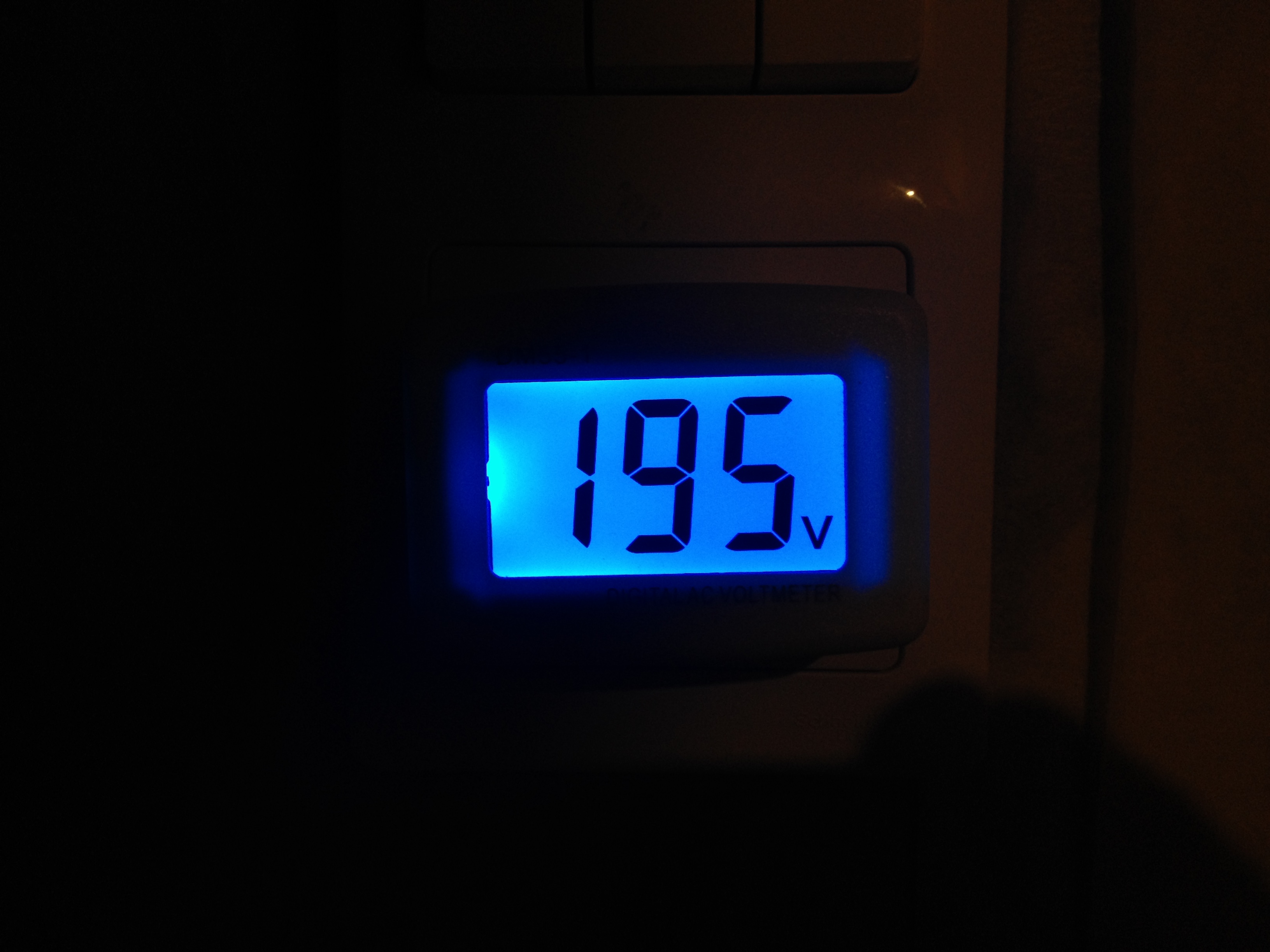 Увидел у наших желтолицых друзей такую фигню: Вольтметр Мне показалось это интересным, в доме проблемы с напряжением, особенно по вечерам. Расположил в розетке в коридоре (прошу не обращать внимание на предремонтное состояние вокруг выключателя) Заодно, ночью выполняет функцию ночника. Оказался достаточно точный Вот так по вечерам... В планах, после замены электрощитка, расположить его там, за прозрачной дверцей. |