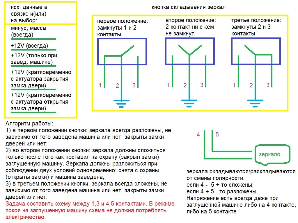 Друзья. Помогите составить схему для складывания зеркал на Киа Соренто. Хочу штатную кнопку двухпозиционную заменить на трехпозиционную чтоб реализовать функцию атоскладавания зеркал при постановке на охрану заглушенной машины и автораскладывания при соблюдении двух условий: завел машину и снял с охраны неважно в какой последовательности. Через 2 реле (одно обычное, перекидывает контакт, другое биполярное с двумя обмотками и двумя группами контактов) могу реализовать автоматическое складывание и раскладывание, но при этом не знаю как сохранить работоспособность кнопки "всегда сложено" и "всегда разложено". Может у кого есть мысли как это сделать? На картинке нарисовал исходные данные и что надо получить в результате.
