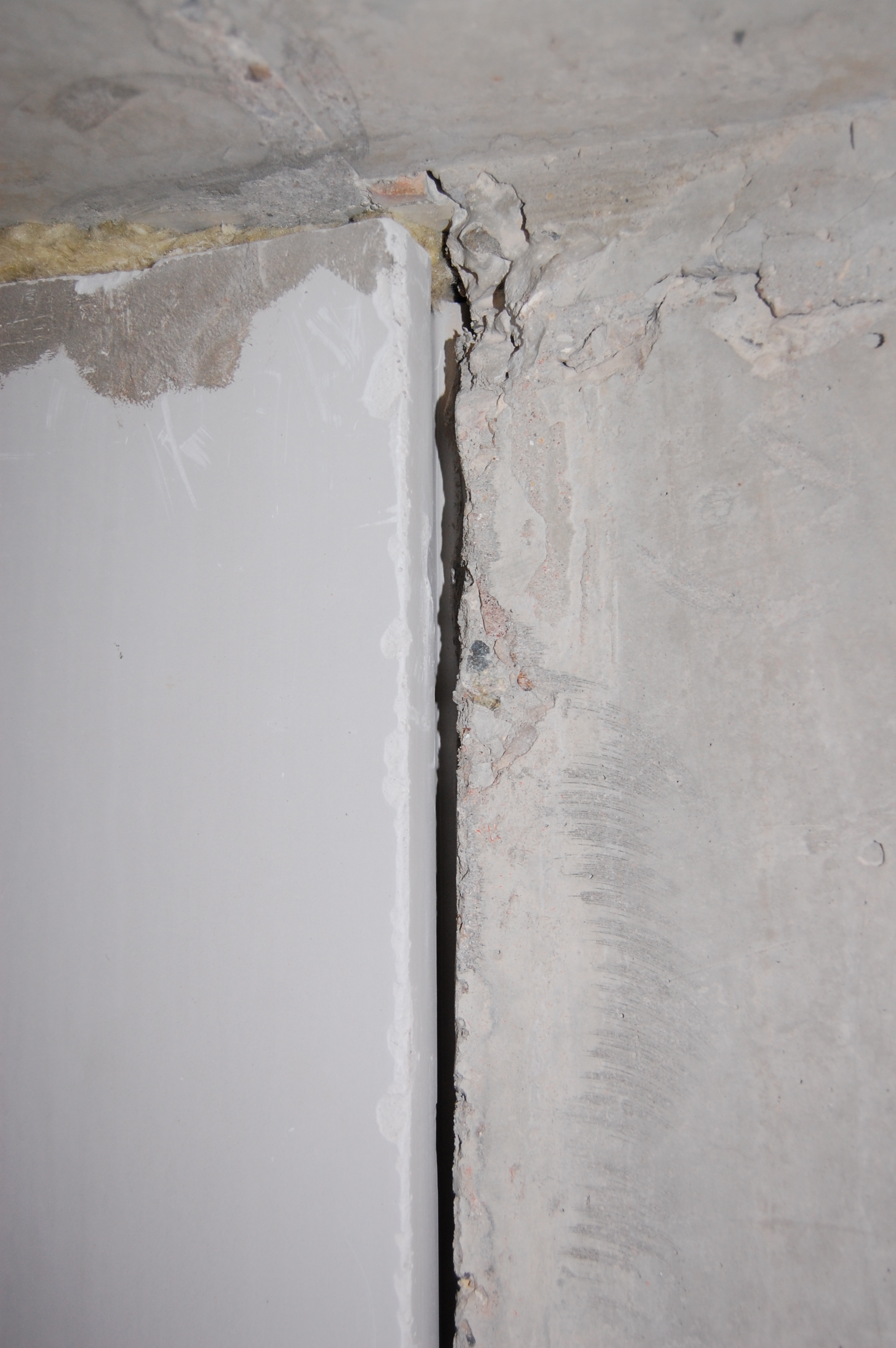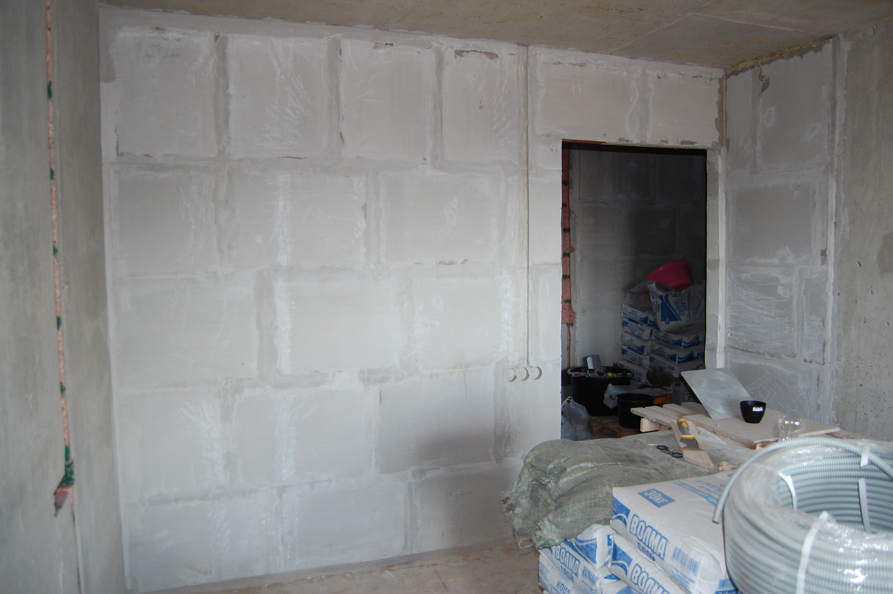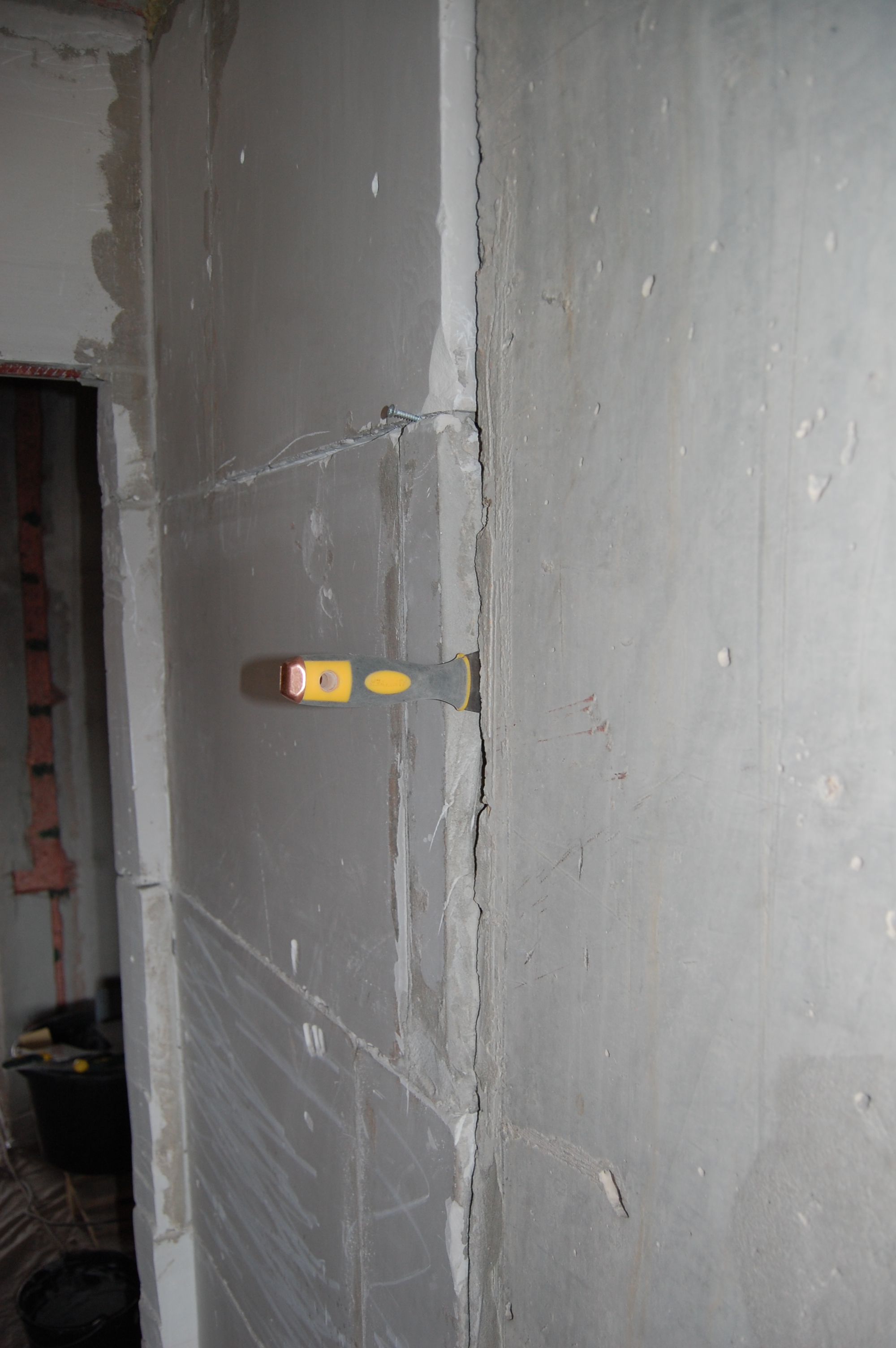Продолжение Подготовка стен для оштукатуривания Стены из пазогребневых гипсовых блоков (ПГБ) Со стен железобетонных переходим к гипсовым. К слову о переходе. У меня от застройщика он выглядел вот так Видно чего-то у застройщика не хватило. Совести наверное. Правда совсем бессовестным его не назовёшь, чтобы блоки не упали - палочкой распёрли А может он обо мне позаботился, чтобы не сильно напрягать - сложена она была не вертикально. Что с ней пришлось делать чуть-чуть позже. А вот пилон здесь вертикальный А вот так выглядел проём над входной дверью Вот так над межкомнатной Ну собственно и между самими ПГБ клея не положили. Просто щели к соседям |