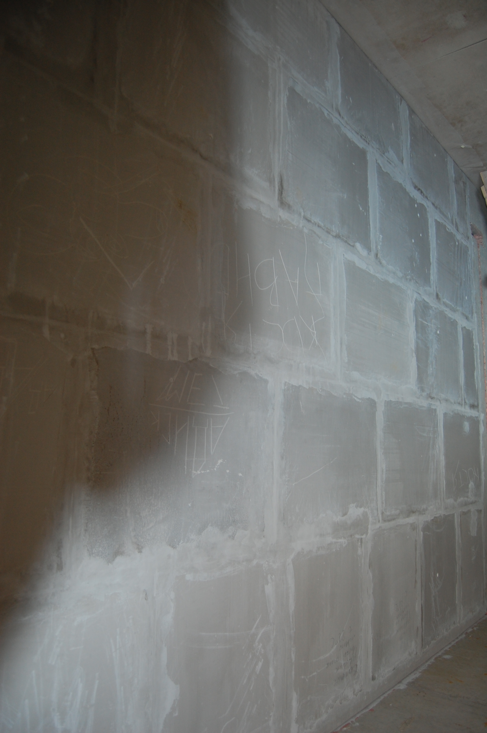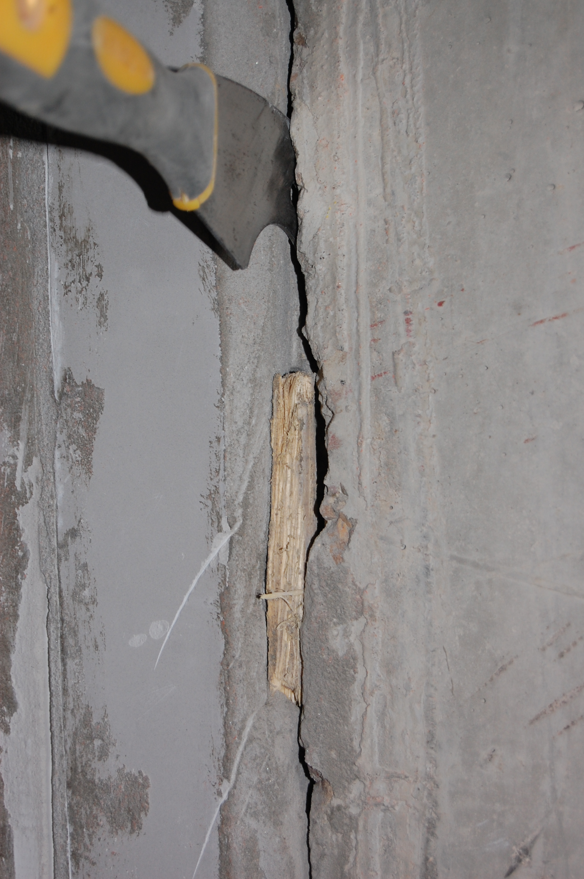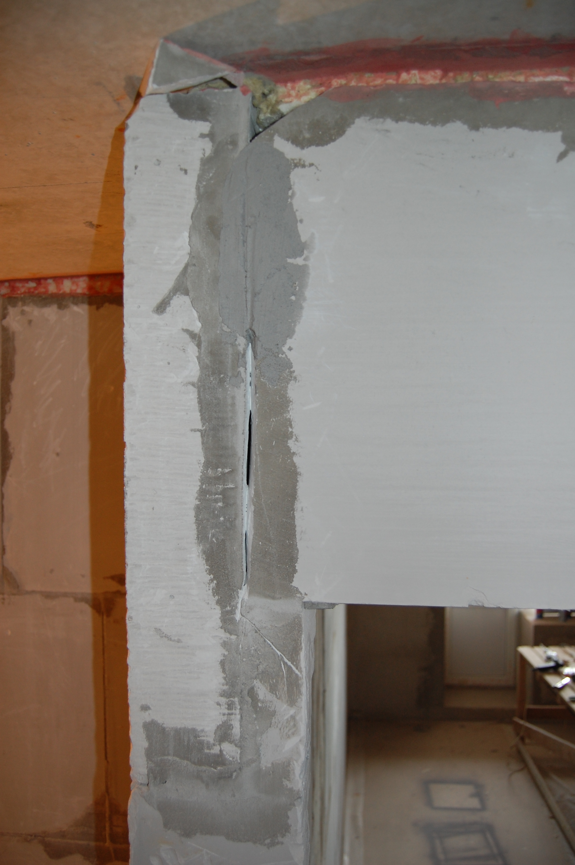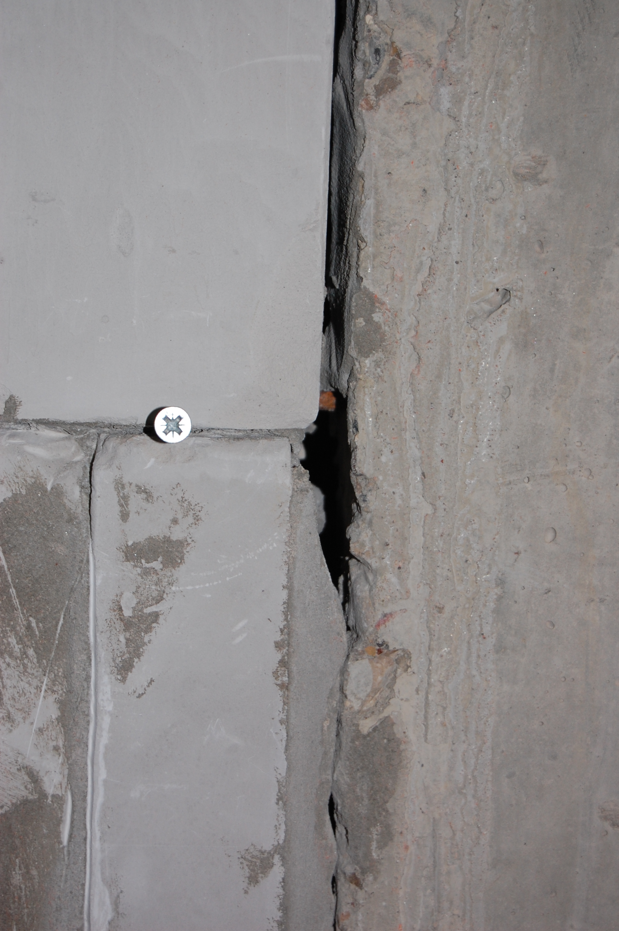 Продолжение Подготовка стен для оштукатуривания Стены из пазогребневых гипсовых блоков (ПГБ) Со стен железобетонных переходим к гипсовым. К слову о переходе. У меня от застройщика он выглядел вот так Видно чего-то у застройщика не хватило. Совести наверное. Правда совсем бессовестным его не назовёшь, чтобы блоки не упали - палочкой распёрли А может он обо мне позаботился, чтобы не сильно напрягать - сложена она была не вертикально. Что с ней пришлось делать чуть-чуть позже. А вот пилон здесь вертикальный А вот так выглядел проём над входной дверью Вот так над межкомнатной Ну собственно и между самими ПГБ клея не положили. Просто щели к соседям |