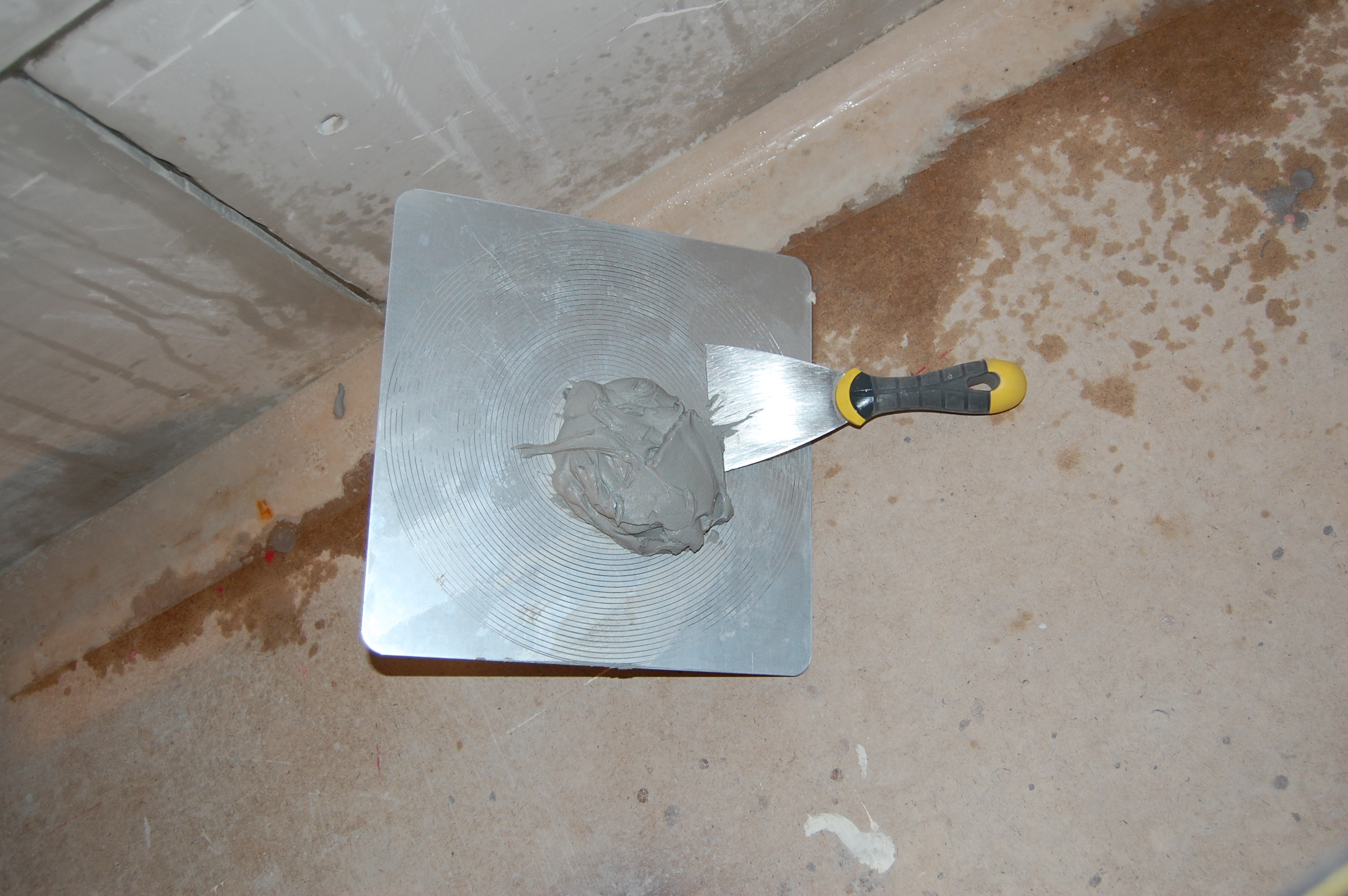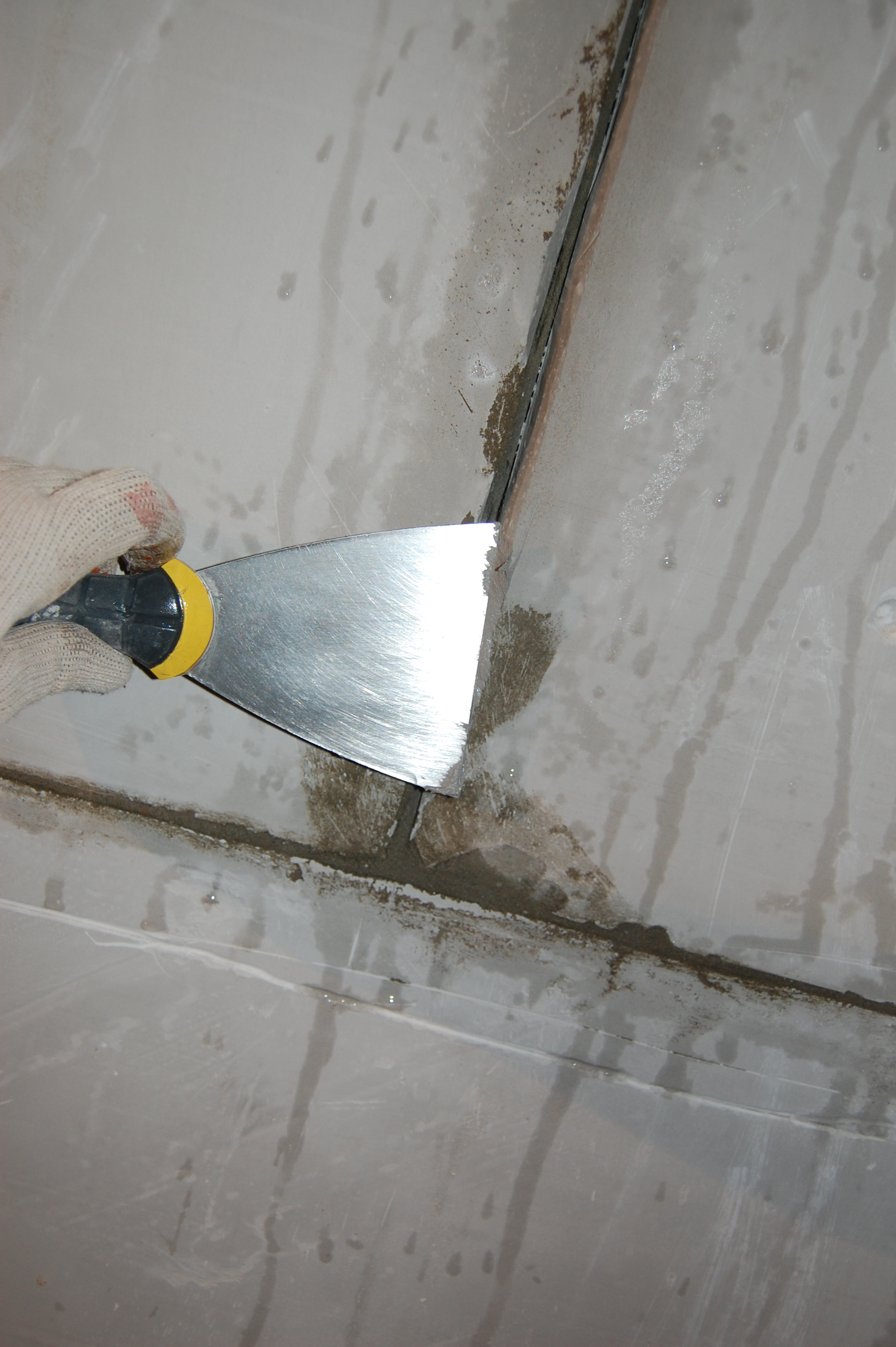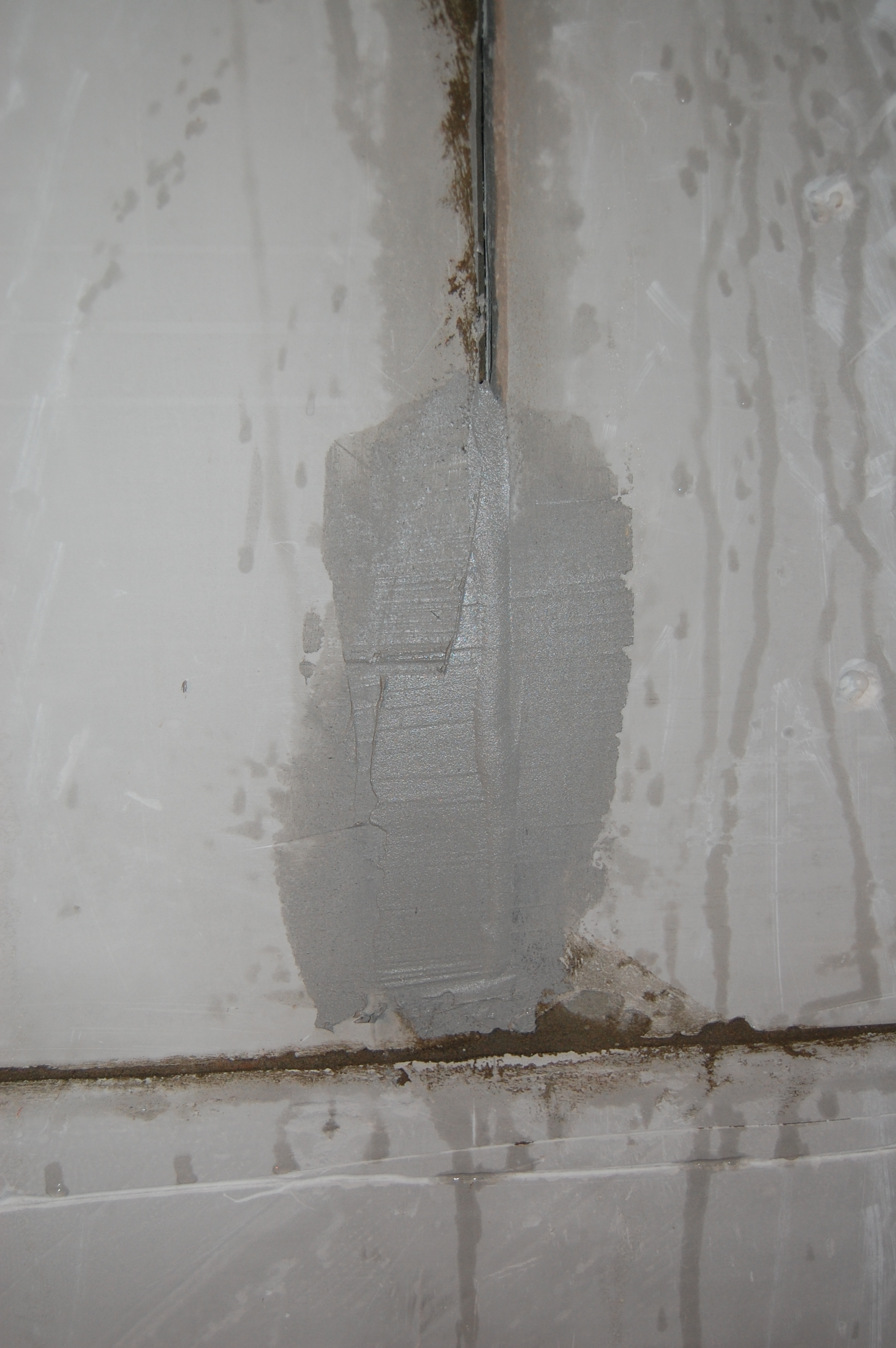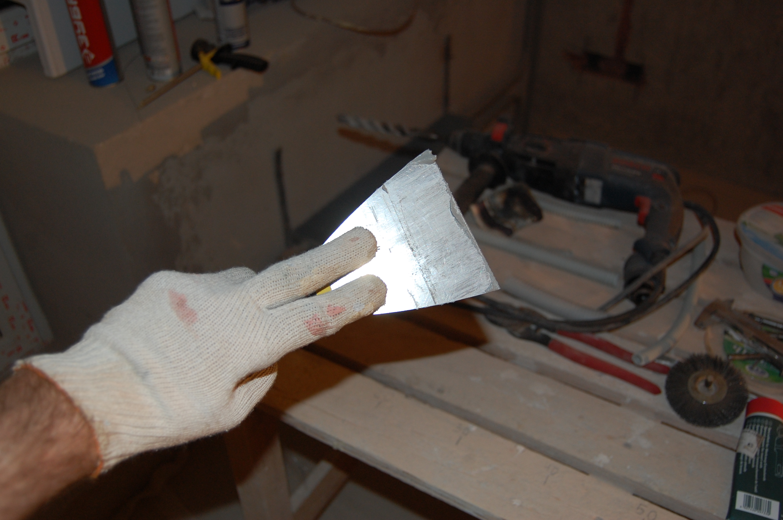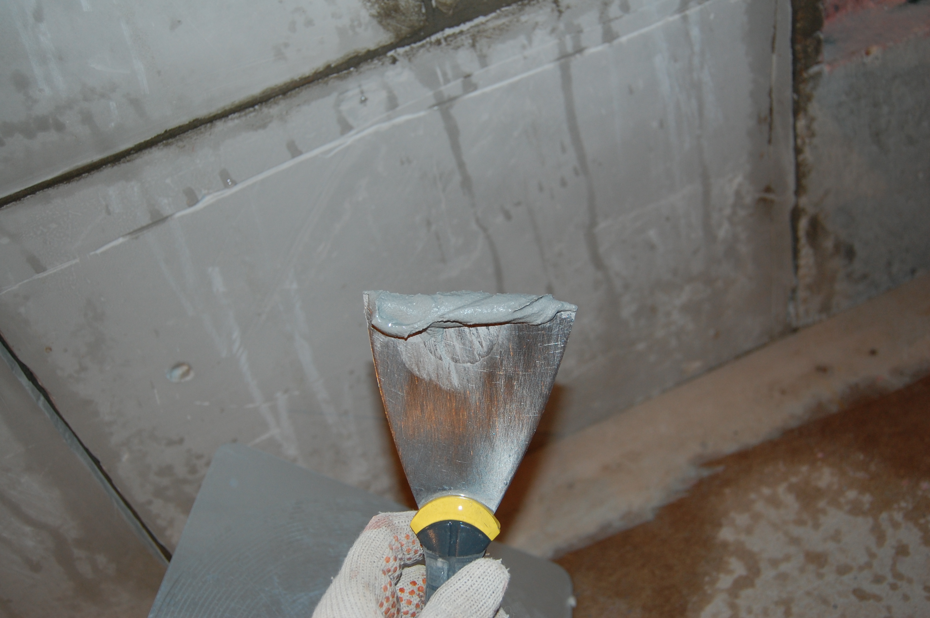 Стены из пазогребневых гипсовых блоков (ПГБ) Так как для заталкивания клея в щель необходимо прилагать значительное усилие, то шпатель берём вот таким образом иначе пальчик будет бо-бо Щели между блоками либо грунтуем, либо хотя бы сбрызгиваем Это необходимо для того, чтобы успеть протолкнуть смесь как можно глубже в щель, т.к. сухой ПГБ вытянет из клея воду практически мгновенно и клей застынет по самому краю щели, не связав блоки в монолит, который и будет препятствовать прохождению звуковых волн. Набираем шпателем небольшую порцию на край режущей кромки Вталкиваем смесь в щель до тех пор пока её оттуда не начнёт выпирать Должно получиться (IMG:style_emoticons/default/smile.gif) вот так В одной комнате мне стены полностью пришлось "проходить" так как блоки были соединены между собой небольшими шлепками |