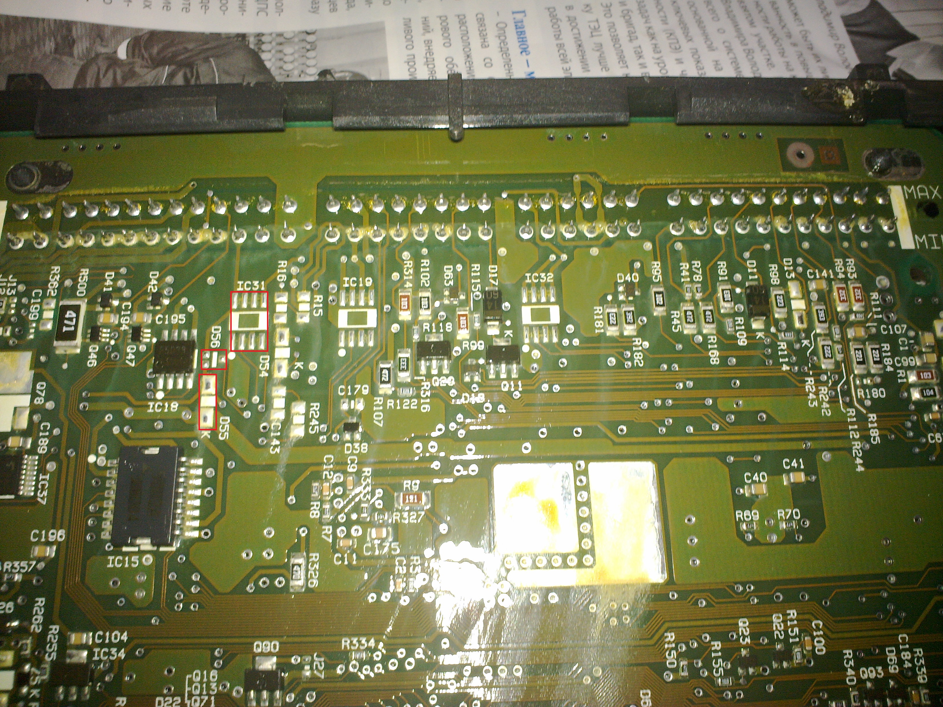 IC31 - F5033(аналог AUIPS2052G (IR)) D56 - нужен D55 - нужен Диоды, по всей вероятности, связаны с самодиагностикой цепей клапана Weste Gate, и, как довесок - Fuel Press Solenoid - D56 - сдвоенный диод с общим катодом ("центральный" пин), один анод соединен с 11 пином разъема, второй анод - с 3 пином разъема и анодом D55. Хотя, управляться WG, по идее, должен и без этих диодов. |