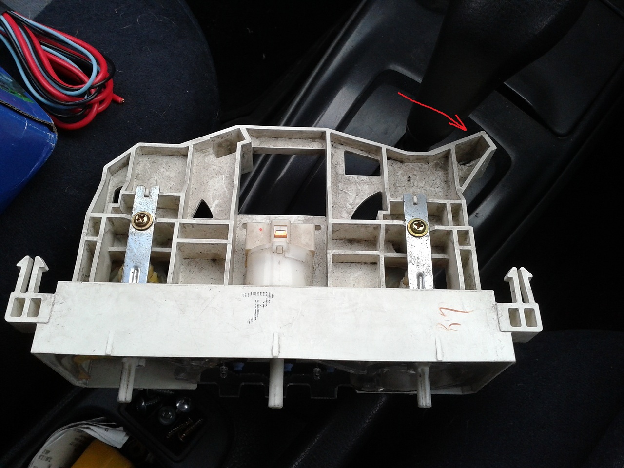 Вчера попробовал примерить корпус управления регуляторами кондиционера на место кармана ниже (для дальнейшей установки рамки 2DIN). Выяснилось, что выступающий угол корпуса (указан красной стрелкой)