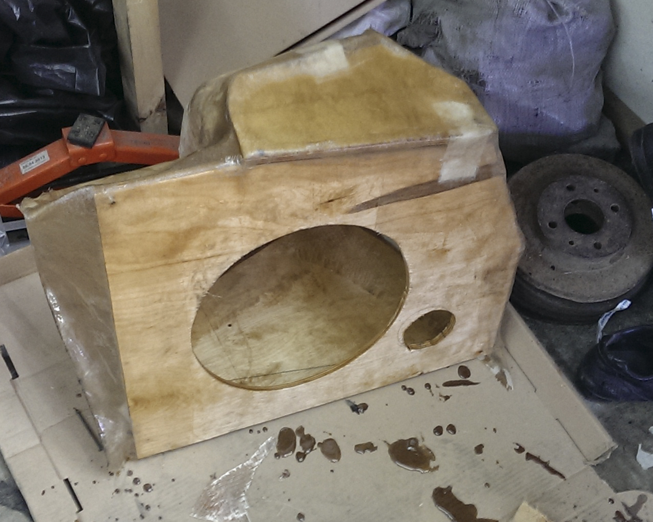 Выглядел он так Сразу прошу прощения, за не полный фото отчет, не всегда было удобно фотографировать все происходящее, а вторая пара рук периодически куда то пропадала) И тут начались танцы с бубном... хочу так или этак... но интернет полон решений и было решено делать из стекловолокна по контуру обшивки багажника. Список того что понадобилось: Скотч малярный - 2 рулона Скотч обычный широкий - 1 рулон Стекловолокно/стекломат - 2 кв.м. Баксидка - 1 кг (1 л.) Фанера - кусок размером 750*750 мм Мастика битумно-резиновая - 0,5 кг. Синтепон - 2 м. Карпет - 1,5 кв.м Балон с клеем - 1 шт. Ну после того как посчитал примерный объем (чтобы хоть чуть чуть попадать под "башку") определил какой глубины должен быть сам коробок. И приступил к лепке стеловолоконного основания: Снимаем обшивку, я решил "извратиться" над правой стороной: Сняли, отлично (IMG:style_emoticons/default/biggrin.gif) Теперь все это обильно заклеиваем малярным скотчем. Насколько обильно? На сколько только скотча хватит! Нам никак нельзя испортить покрытие обшивки в моем случае 3-4 слоя хватило. Выглядит это примерно так: Далее, нам понадобиться обычный скотч. (от него баксидка отлипает куда лучше). Им я проклеивал только края, дабы было проще подцепиться, чтобы проще снять форму задней стенки. После того как все заклеено скотчем, можно приступать к оклейке стеклотканью: Оклеили и забыли на ночь... Следующий день и следующий этап. На этом этапе снимаем нашу форму, от основания. Сняли, обрезали до нужных нам размеров (длина) а так же подровняли стороны (края). Додумыя форму вырезаем из фанеры лицевую сторону - постоянно примеряясь с формой. Сделав лицевую, вырезаем так же основание (пол) и верх (потолок) короба. Соединяем, подрезаем и получаем: Оклеиваем все стыки стекловолокном, пропитываем стыки баксидкой. Опять оставляем на ночь. Вернувшись получаем: Фотографий по зачистки поверхности наждачной бумагой, промазки внутренней стороны битумно-резиновой мастикой к сожалению нет. БРМ (битумно-резиновая мастика) - скажу пару слов, в чем прелесть? При высыхании и застывании становится как единый резиновый слой, ложилось в толщину 2-3 мм, в несколько слоев. Желательно как можно лучше промазать стыки и примыкания фанеры со стекловокном. БРМ высыхает в течении 24-48 часов, как гласит производитель. Но на практике высохло за ночь ( ЧУДО!!!! (IMG:style_emoticons/default/biggrin.gif) b: ) Далее все снаружи оклеивается карпетом и укладываем внутрь синтепон. P.S. Для чего синтепон? Честно говоря, никогда не укладывал его в короб, но без него звучание было отвратительно. Собираем, ставим и проверяем: Если что не так не судите строго, я тут совсем не давно))) позже добавлю фото как все крепилось к кузову, чтобы эта "штука" не каталась по всему багажнику. Надеюсь что кому то чем-то поможет эта небольшая статья. |