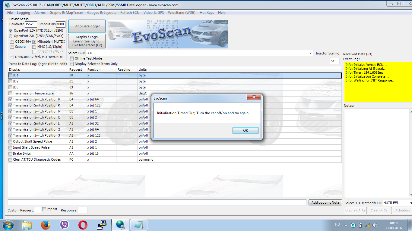 Благодарочка dmitrij_b! Человек очень вежливый, порядочный и пунктуален. Оплатив шнурок он его незамедлительно выслал почтой России и при этом упаковал на 5+ А теперь о приятном: - через всем известный нам ломаный EvoScan 2.7 было прочитаны ошибки на автомобиле Mitsubishi Diamante f46A (6g72 GDI) Так же прочитался блок абс (ошибок на тот момент не было, но чек абс иногда загорается. грешу на датчик один на правом переднем...теперь буду ловить ошибку что бы считать её) Данные АКПП не получилось считать с ошибкой что на скрине. Показания работы ДВС тоже залогировал, теперь буду смотреть и сравнивать показания. Ошибки мозга тоже показало.. The Following EFI MUTII Diagnostic Trouble Codes are valid for 1996 or Earlier Mitsubishi Vehicles ONLY!E685 Reading MUTII DTCs for EcuID:E685 Updated: 18:49:55 Diagnostic Codes:Oxygen Sensor (11) Intake air flow sensor (12) Intake temperature sensor (13) Engine coolant temperature sensor (21) Vehicle speed sensor (24) Так что предпологаю что мозгу каюк. Но в общем кабелем рад как моська с грелкой. Жалко EcuFlash чего то с диамантом не дружит |