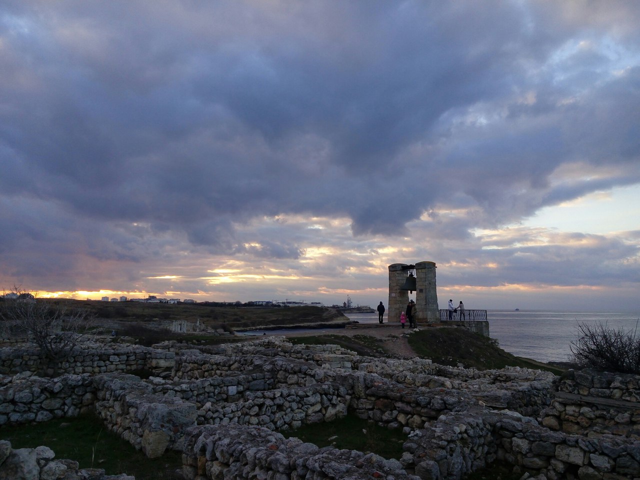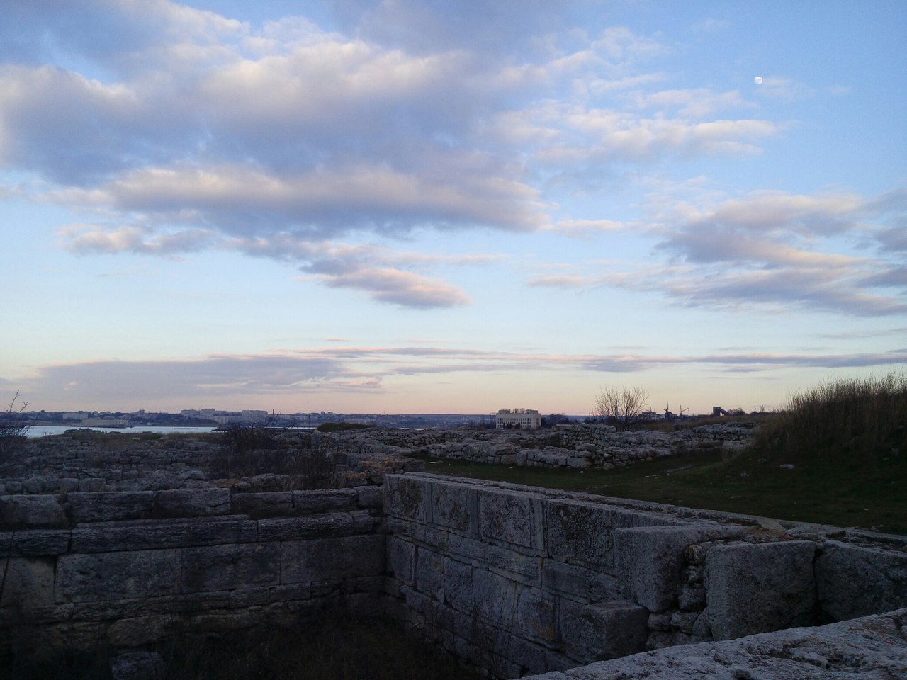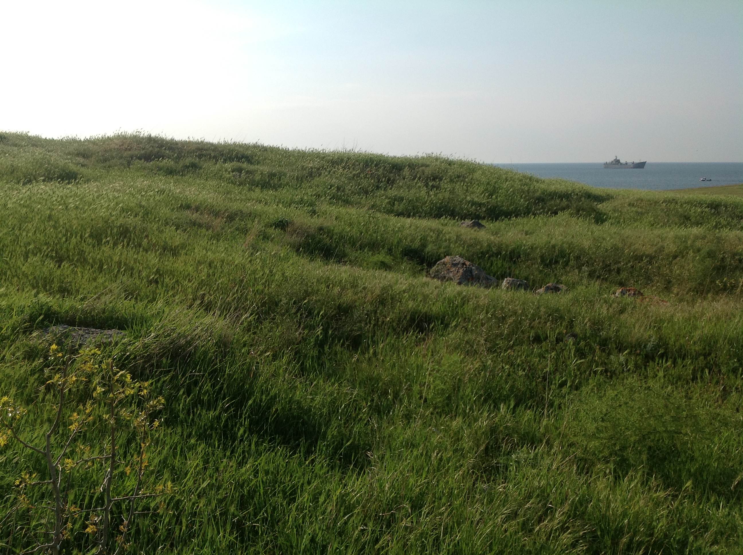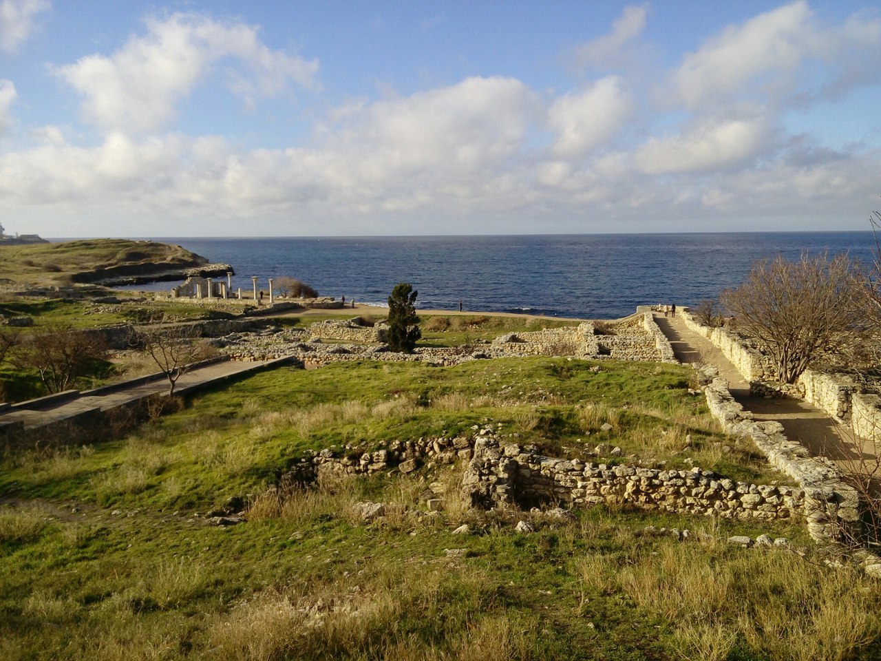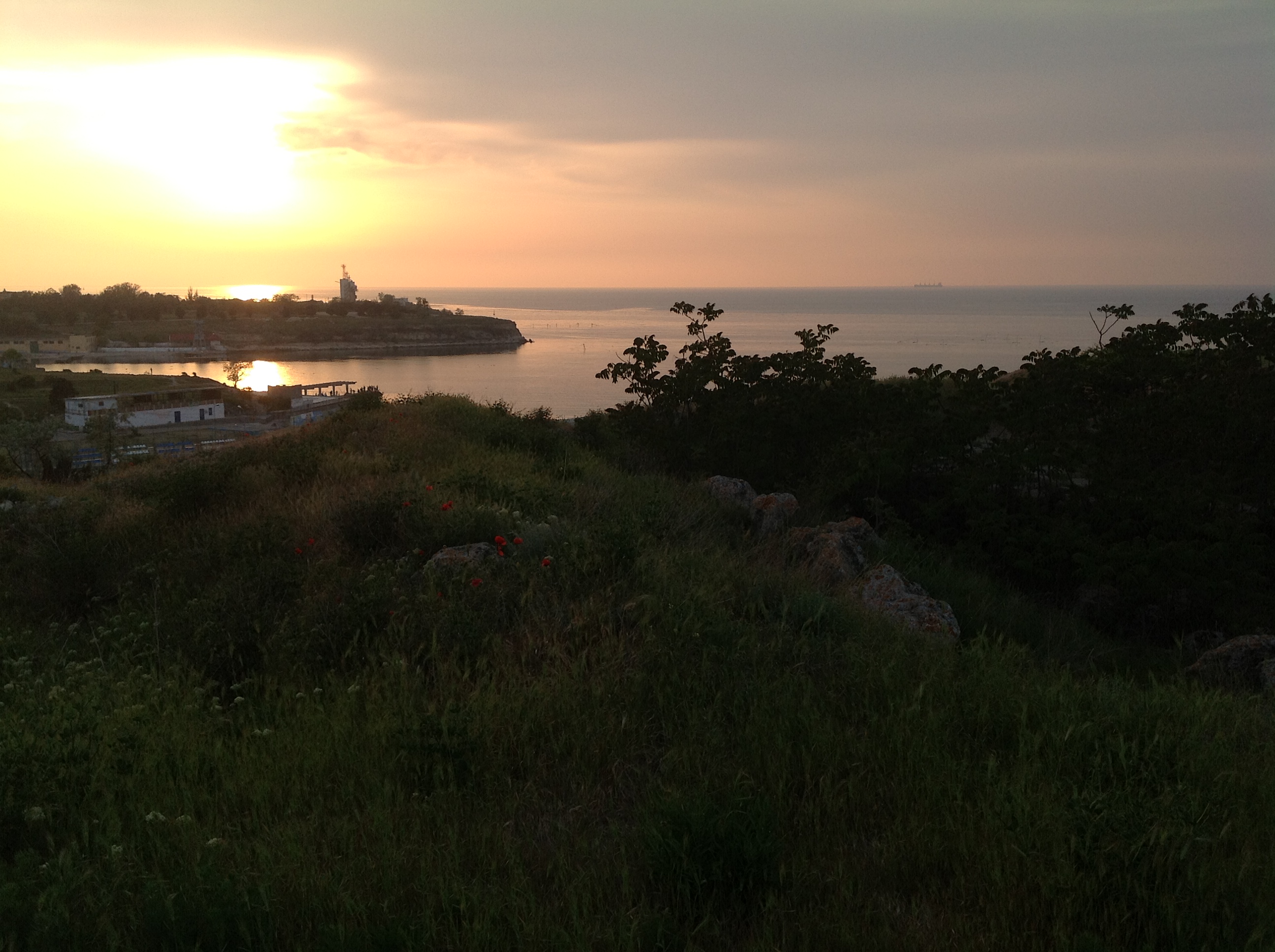 видно что берег обрывистый и не очень пригоден для купания как пляж. Пока в воду зайдёшь все ноги в синяках будут. Но "в сезон" здесь не протолкнёшься. Точнее до прихода России было не протолкнуться. С прошлого года купаться на территории городища запретили ... Поэтому берег теперь выглядит вот так Если хватит терпения пройти от стены до стены, то уткнёшься в пляжи "Песочный" и "Солнечный" за которыми видно Севастопольское Нахимовское Училище В апреле-мае, степь покрывающая руины, не хрустит под ногами пересохшей травой, не царапает колючками, не звенит цикадами и нагретым воздухом, и совсем короткое время непривычно зелена И если смотреть на неё издали, то косогоры повёрнутые к солнцу становятся красными от цветущих маков |