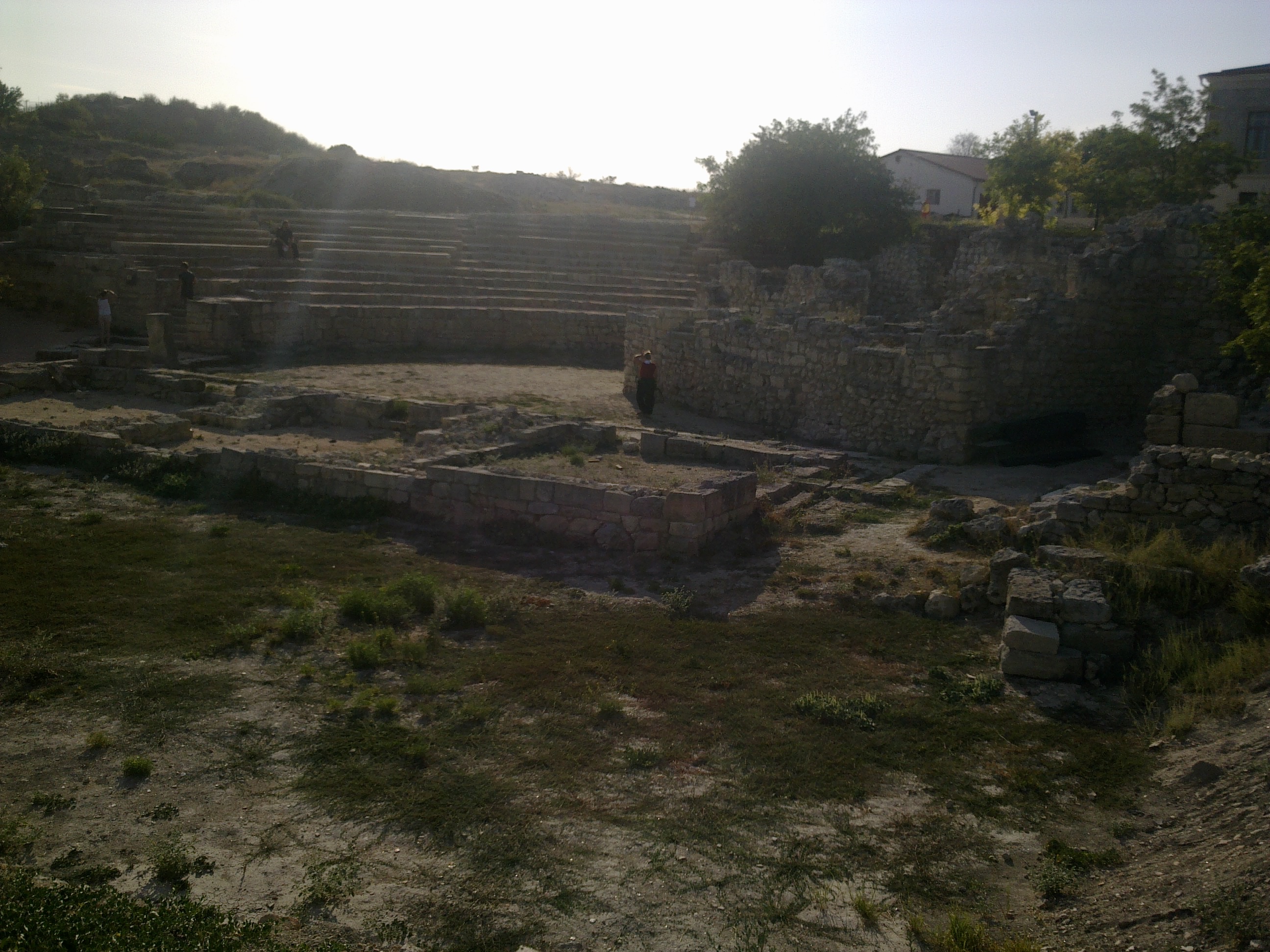 То пройдя сквозь эти домики в которых живут археологи и пройдя похожие в которых размещаются музеи то выйдем к древнему театру В прочем древнему ли? В нём до сих пор ставят пьесы и проводят концерты. Зрителей валом, несмотря на высокую цену на билеты. А если пройти мимо ворот и спуститься в раскопанный город за городской стеной То между двумя городскими стенами Можно наткнуться на остатки древней канализации |