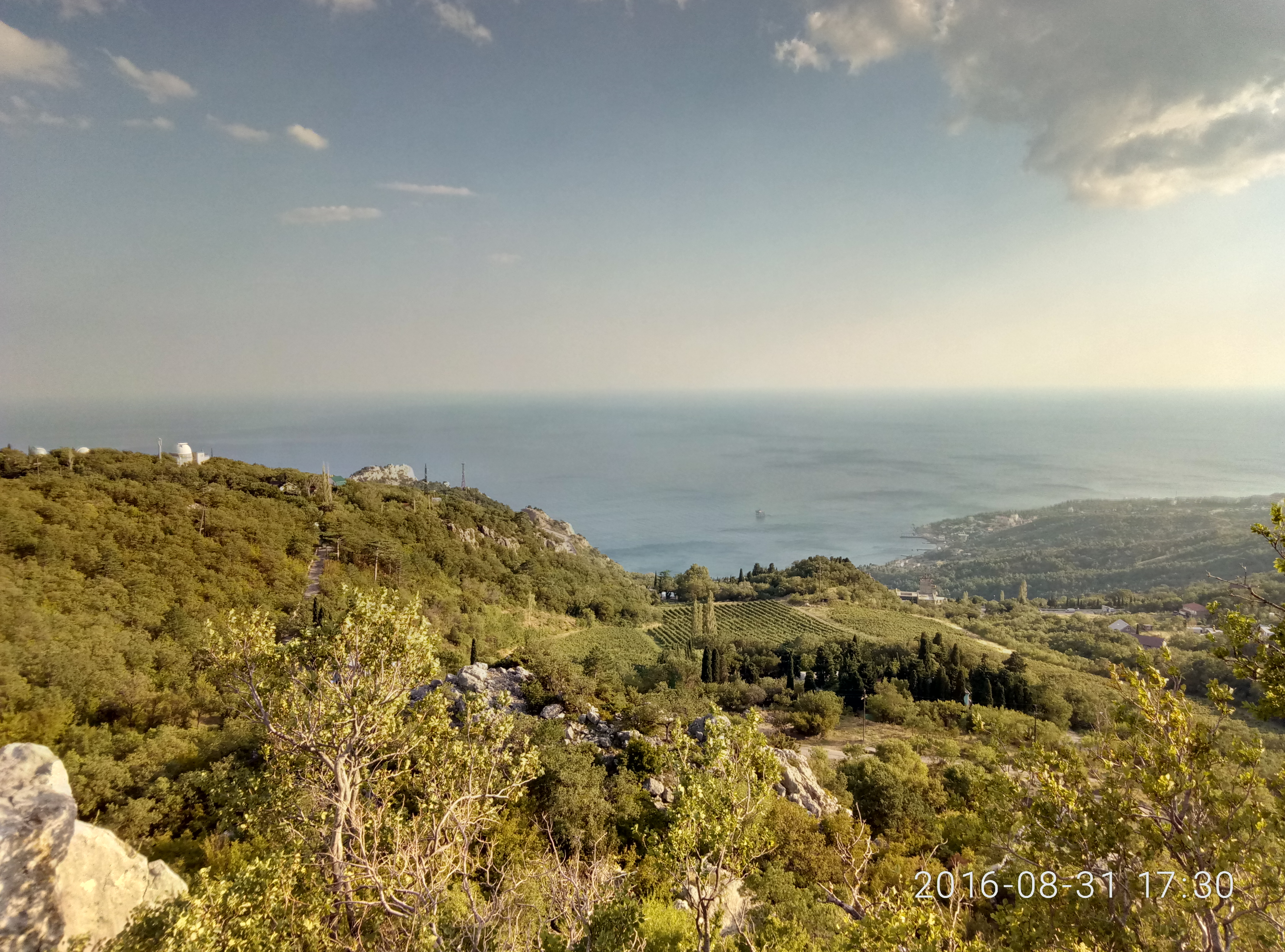 Сворачиваем с трассы Ползем вверх. Здесь за поворотом должна открыться Симеизская обсерватория Фигвам получился. Заросли обочины кустами и деревьями - не видно ни вокруг ничего, ни отсутствующей обочины, когда казалось, что сразу за полотном дороги начинается обрыв. Особенно с высоты автобуса было страшно. Вот издалека вид: слева купола обсерватории, по центру Симеиз внизу. Правее центра видна нынешняя трасса. А вот полный вид на гору Кошка с противоположного края долины Хорошо видно, что она кончается утесом, который называется "Дива" Вечером продолжу ... уехали в Ласпи |