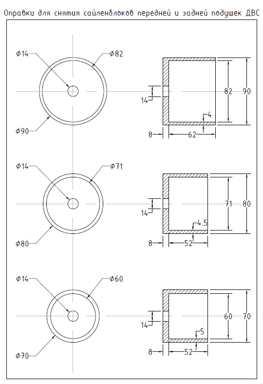Чертеж оправок для замены сайлентблоков передней и задней подушек ДВС: