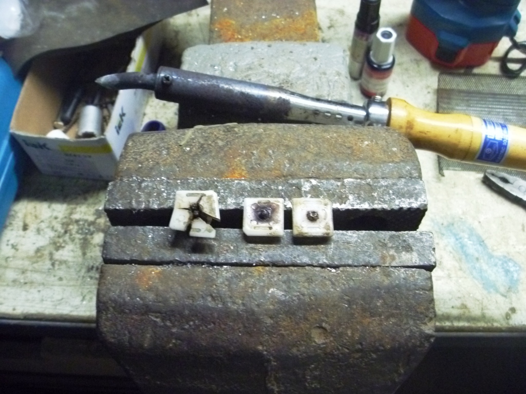 На фото не подставка под паяльник , а материал (декоративная защита динамиков) для армирования спаянных швов . Паять лучше на природе или с вентилятором , вонь - не приятная . Получилось так : Много времени у меня отнял демонтаж нижних креплений порога . Из пяти винтов , выкрутить удалось только один , три высверливал , последний просто сгнил . Огрызки винтов прогрел паяльником и когда они стали "плавать" в пластмассе , выкрутил их пассатижами . Разломленную клипсу тоже поремонтировал , таким же образом , как и порог : Все боковые клипсы удалось без повреждений выдернуть из кузова столярными клещами . Такой вот вид порога с неснятой плёнкой 3М скотча перед установкой : |