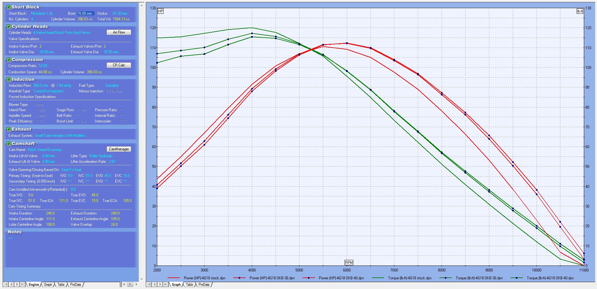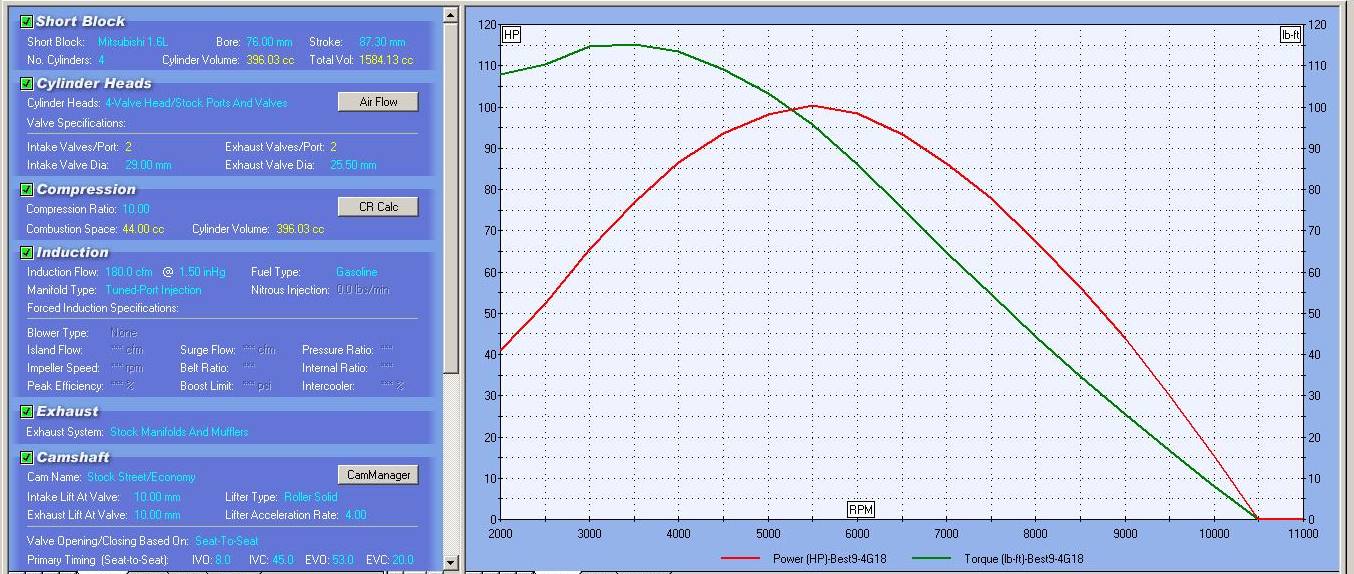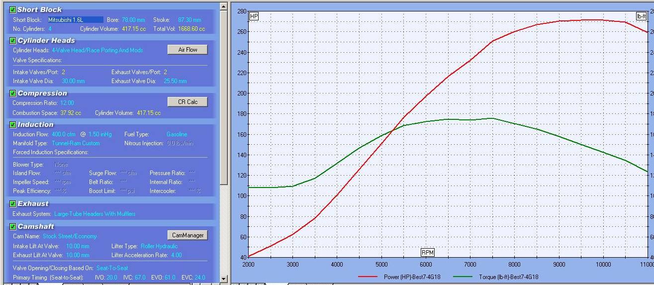 по углам для вала при стоковом впуске - выпуске. Пиковые Л.С. Впуск 12-51 Выпуск 61-20 Прирост мизерный. Пиковая полка момента. Впуск 8-45 Выпуск 53-20. Расчет делался от 2000 до 8000 rpm. (хотя наш предел 7000) Как видно это два разных вала. ВАЖНО !!! Расчеты вала (поиск лучших углов) лучше делать после изменения впуска -выпуска, замена ресивера, портинга и т.д. Это будут совершенно другие значения по углам. По сравнению с поиском от стока. Даже небольшие изменения (например замена ресивера) уже меняют углы в программе при поиске. Самый большой прирост дает 1) Установка 4х дроссельного настроенного впуска. 2) Прямоточный настроенный выхлоп. 3) Портинг ГБС с увеличением клапанов и их подъема. 4) Расточка блока. (увеличение объема) Это при стоковом распредвале будет - А теперь расчитаем лучшие углы для вала. Со всем этим фаршем. Впуск 20-67 Выпуск 61-24. Ого ниче так ! прирост. Причем вернув в программе все показатели к стоку, но вал Впуск 20-67 Выпуск 61-24 оставляем. Мы получаем опять свои стоковые 98 л.с. !!! P.S. Вал без остальных доработок - погоды не сделает !!! |