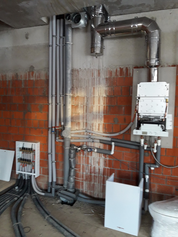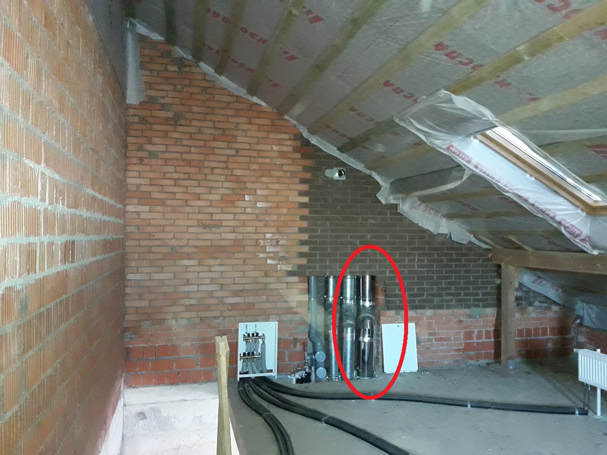 Только-что глянул проект... (очень быстро пролистал) и не нашел в нем упоминания о готовых смесительных узлах для ТП или отдельных их компонентов. Есть упоминание о коллекторах ТП, но это не все - должны быть циркуляционные насосы и термостатические краны. В зависимости от выбранной модели котла, может потребоваться перепускной клапан (если он не встроен в котел). Также в проекте не встретил упоминания о терморегулировании теплых полов (электронные термостаты в комнатах и краны с электроприводами на гребенке или греем каждый этаж целиком). Упоминание о приточной вентиляции должно быть в проекте газификации помещения, но диаметры приточной и вытяжной вентиляции рассчитываются из объема помещения и типа котла (закрытая/открытая камера сгорания) Застройщик все трубы подвел под крышу и не выводил сквозь нее? или это так получилось после надстройки и укладки новой металлочерепицы? Дмитрий, приветствую! (IMG:style_emoticons/default/drinks.gif) Смесительные узлы теплого пола, насосы будут располагаться в котельной, по ней будет отдельный проект. Вот про терморегулирование - хороший вопрос, не подумал об этом. Уже задал его проектировщику, он сказал, что предполагал делать его погодозависимым. В общем остановились на том, что я попросил его добавить в проект комнатные термостаты для регулировки каждого помещения отдельно. Про котел и дымоход - от застройщика у меня был двухконтурный котел с открытой камерой сгорания, утепленный дымоход из нержавейки поднимается на кровлю, но выведен он не через саму кровлю, а третьем этаже вместе с трубами вентиляции и канализации как-бы уходит в стену и выходит в отдельной кирпичной трубе на крышу. На фото ниже все должно быть понятно. Вообще мне очень нравится идея замены котла на котел с закрытой камерой сгорания. Но коаксиальный дымоход, как я понял из-за высокого сопротивления, имеет ограничение по своей длине, в которое я не вписываюсь, если выводить его на крышу, т.к. от котла до кровли около 10 метров. Есть вариант сделать забор и выброс воздуха двумя раздельными трубами, причем как вариант забор можно не с кровли, а с фасада. Вот только пока не нашел информации по ограничению длины дымохода при таком варианте. |