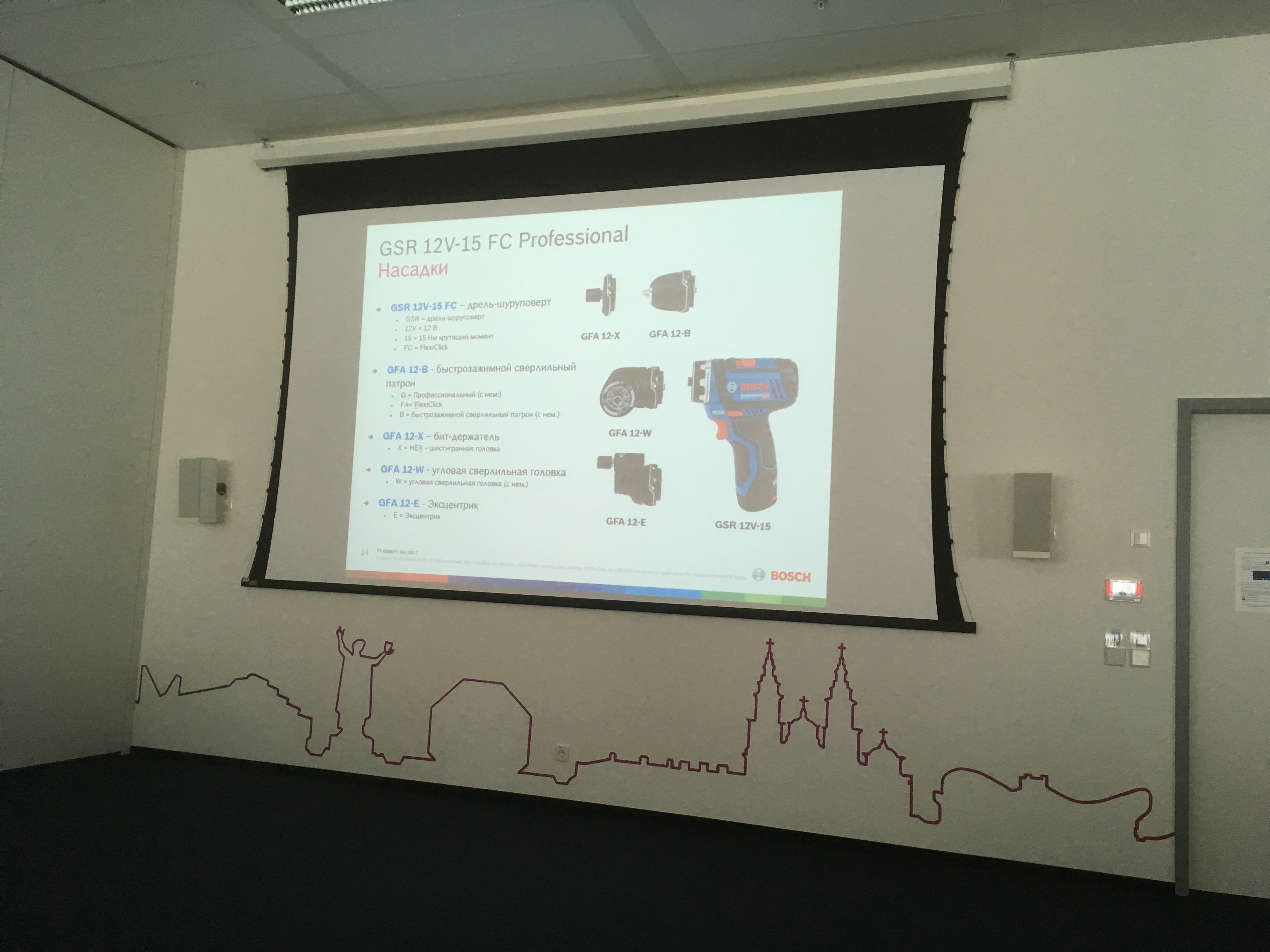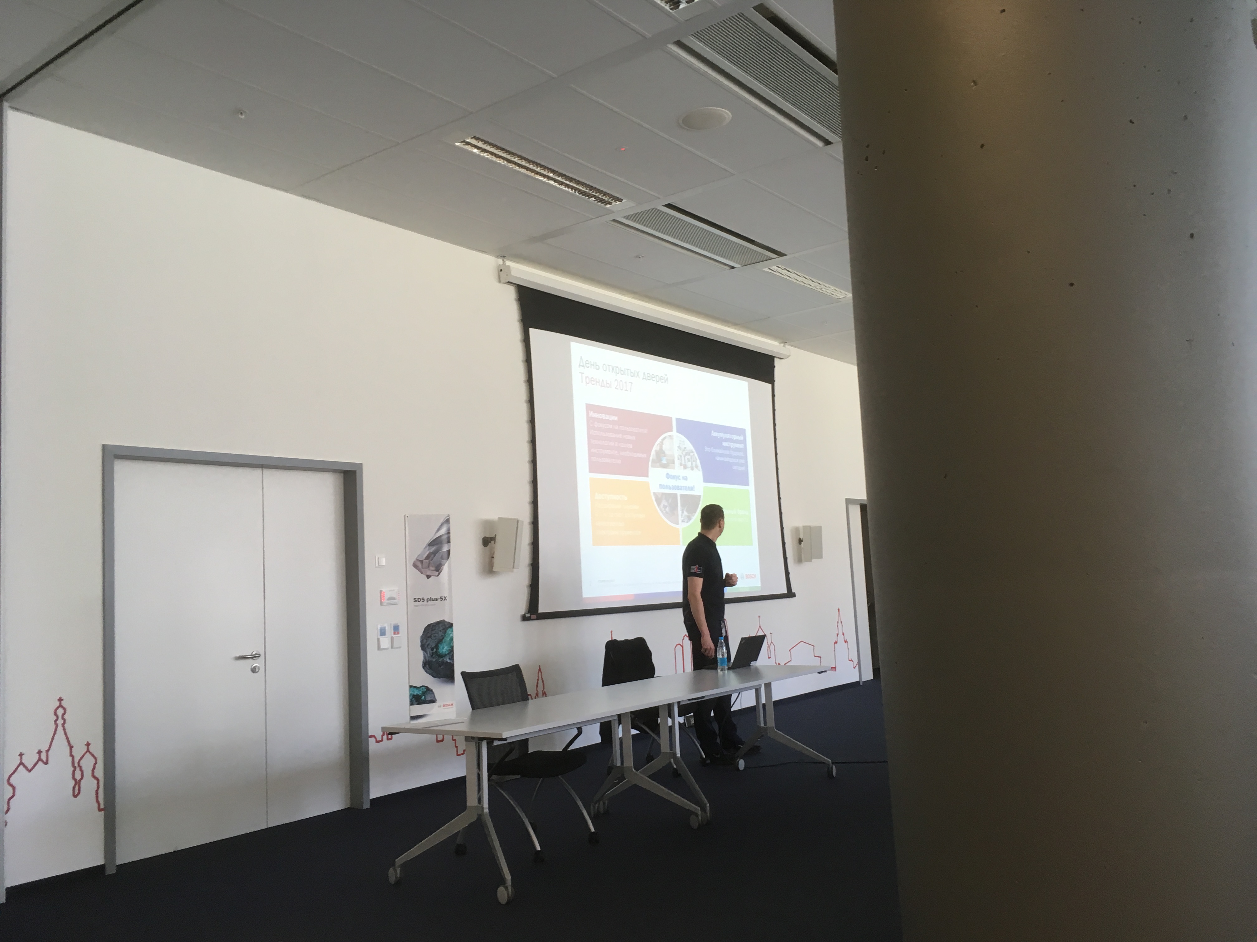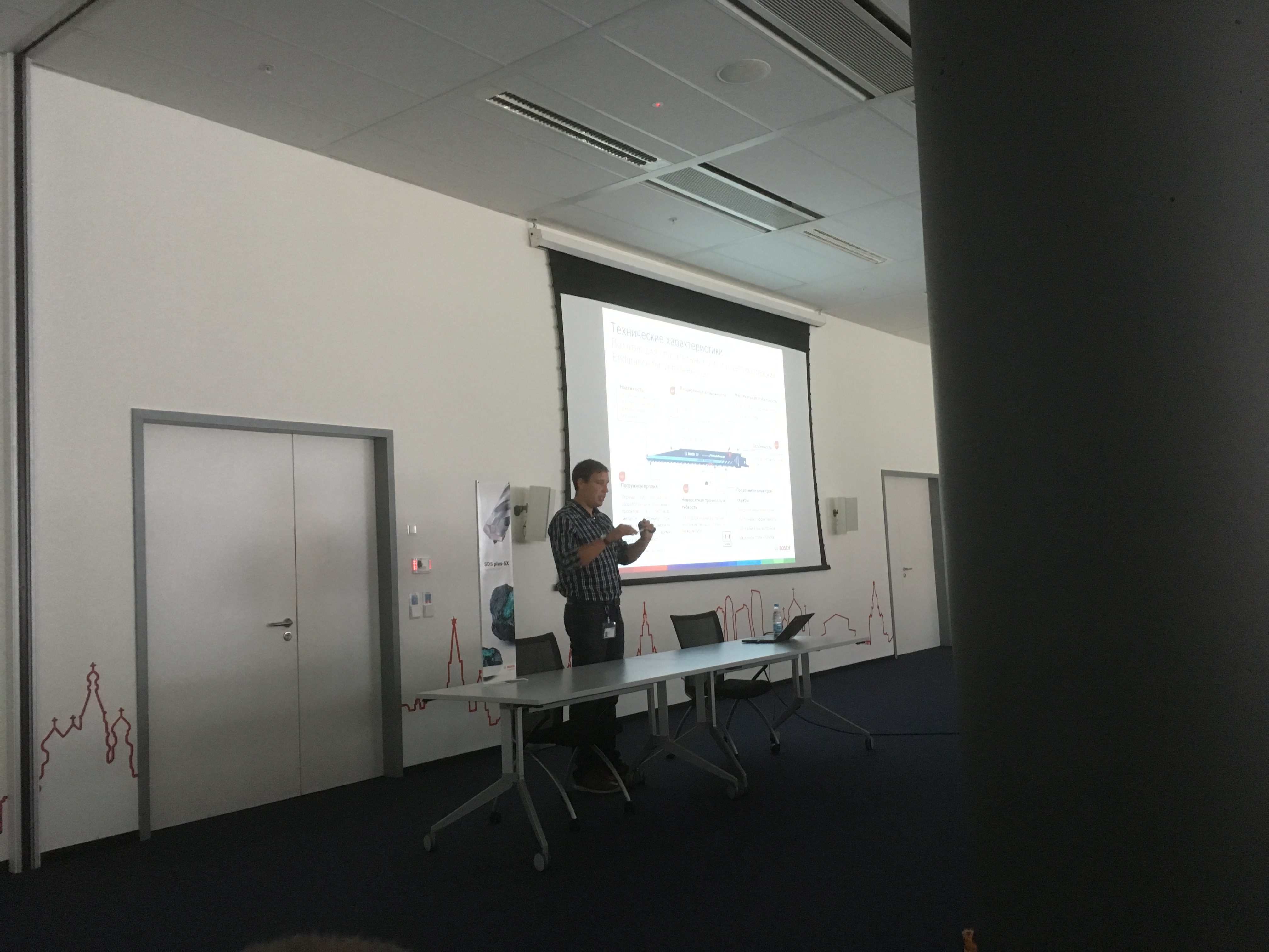 После регистрации , инструктажа под роспись о технике безопасности и небольшой кофе-паузы , состоялась теоретическая часть, на которой представители компании BOSCH презентовали новинки проф. инструмента, прочие достижения. Проинформировали о изменениях в маркировке синей линейки инструмента, переходе на