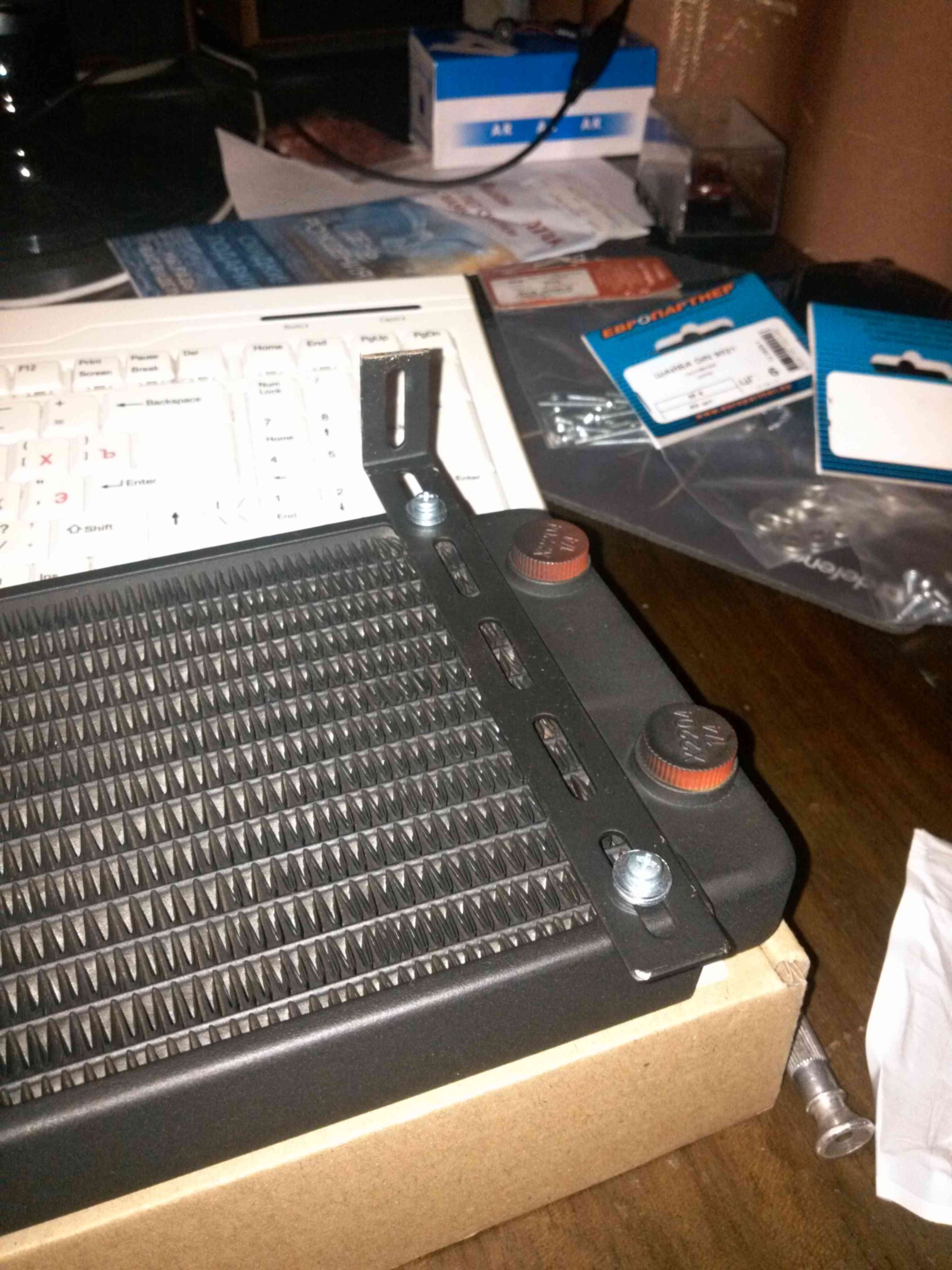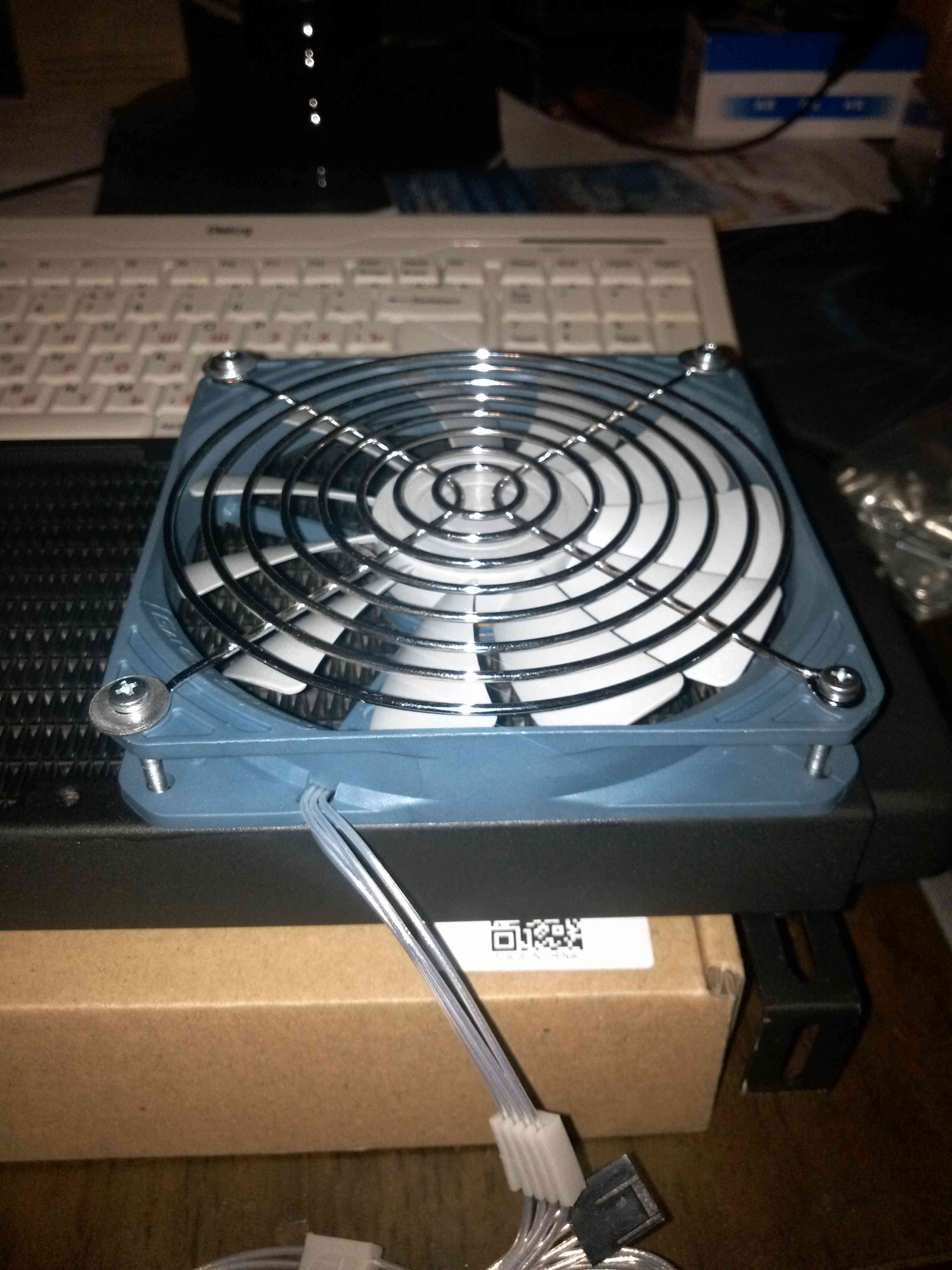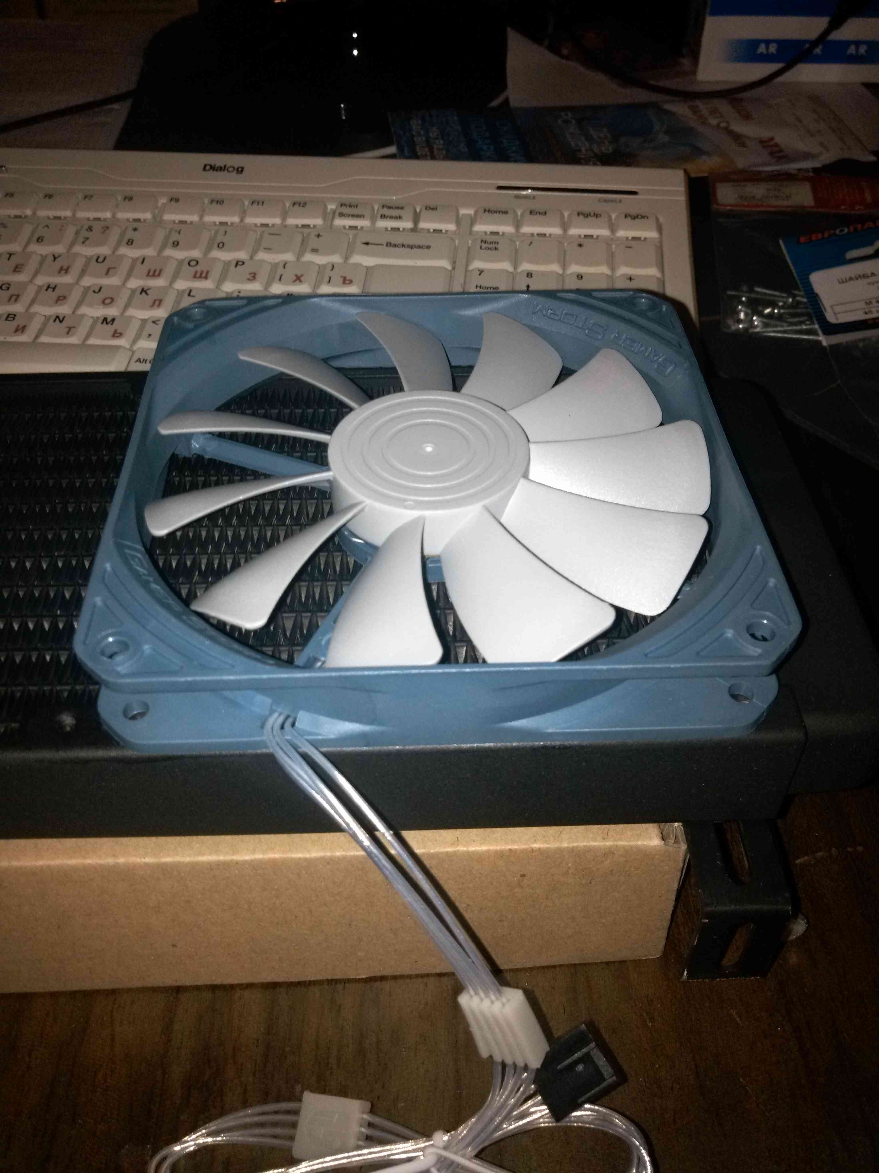 Вентиляторов стояло 5 шт. 80*80*25. На проце 90*90*25 с тепловыми трубками. Корпус использую Chiftec. Первая замена была - 1 вентилятор 200*200 в боковую стенку. Второй 120*120 в корзину дисков. (все 80*80 убрал) Стало тихо. Но процессор Core i5 2500 в пике показывал 70-72 градуса. Видеокарта Asus GTX760 в пике 80-82 градуса. (на видюхе 2 куллера 70*70 в стоке) При этом шум поднимался от куллеров проца и видюхи (выходили на 70-100% оборотов). Решил понизить общую температуру путем установки водяного охлаждения. Купил 2 радиатора R360. Позволяет установить 3 куллера 120*120. Общий теплоотвод 300вт с одного радиатора. Один на видюху и один на процессор. Крепеж к ПК придумал через кронштейны. Вентиляторы 120*120*20 с PWM управлением 4pin купил 7 шт. |