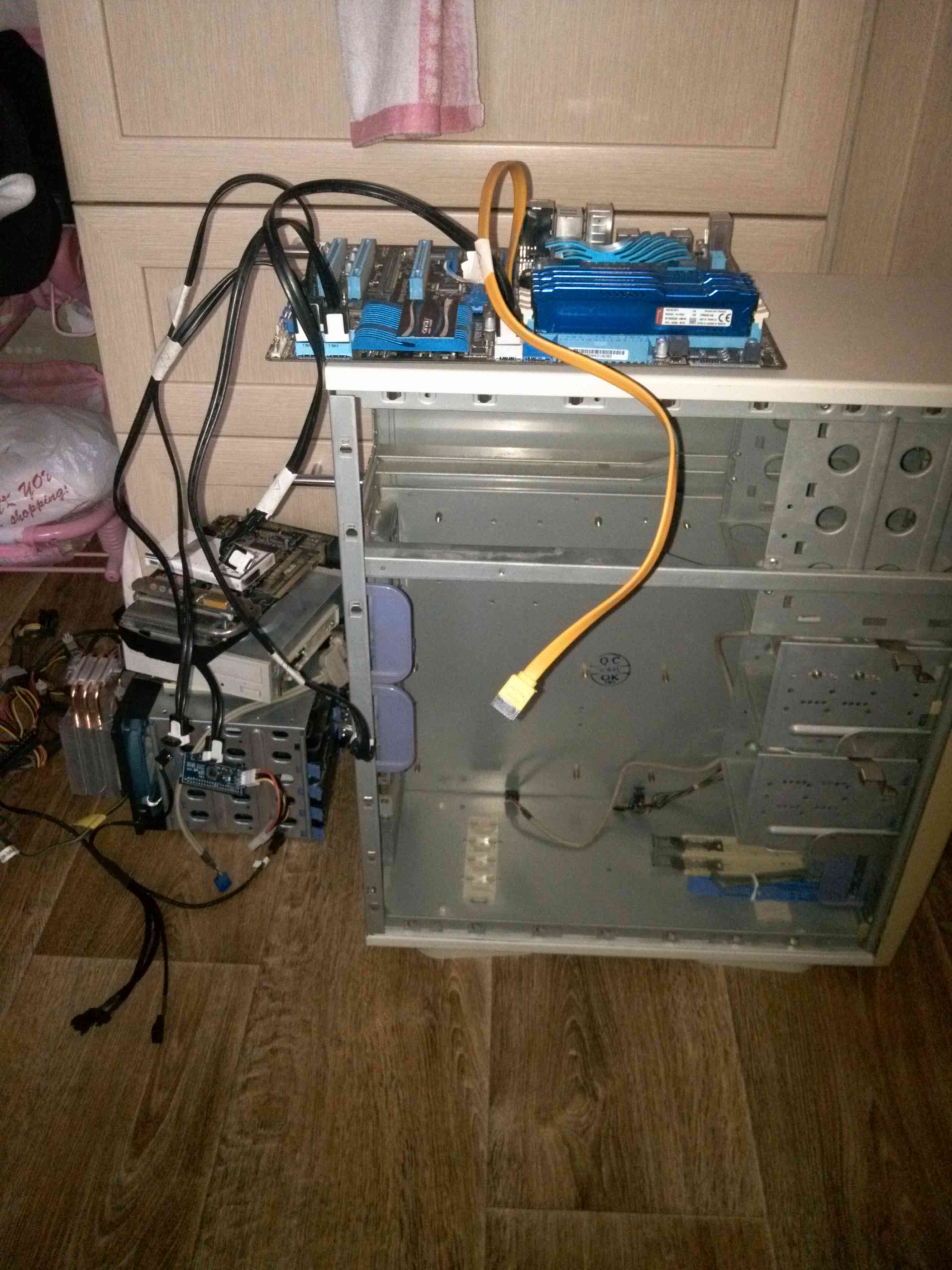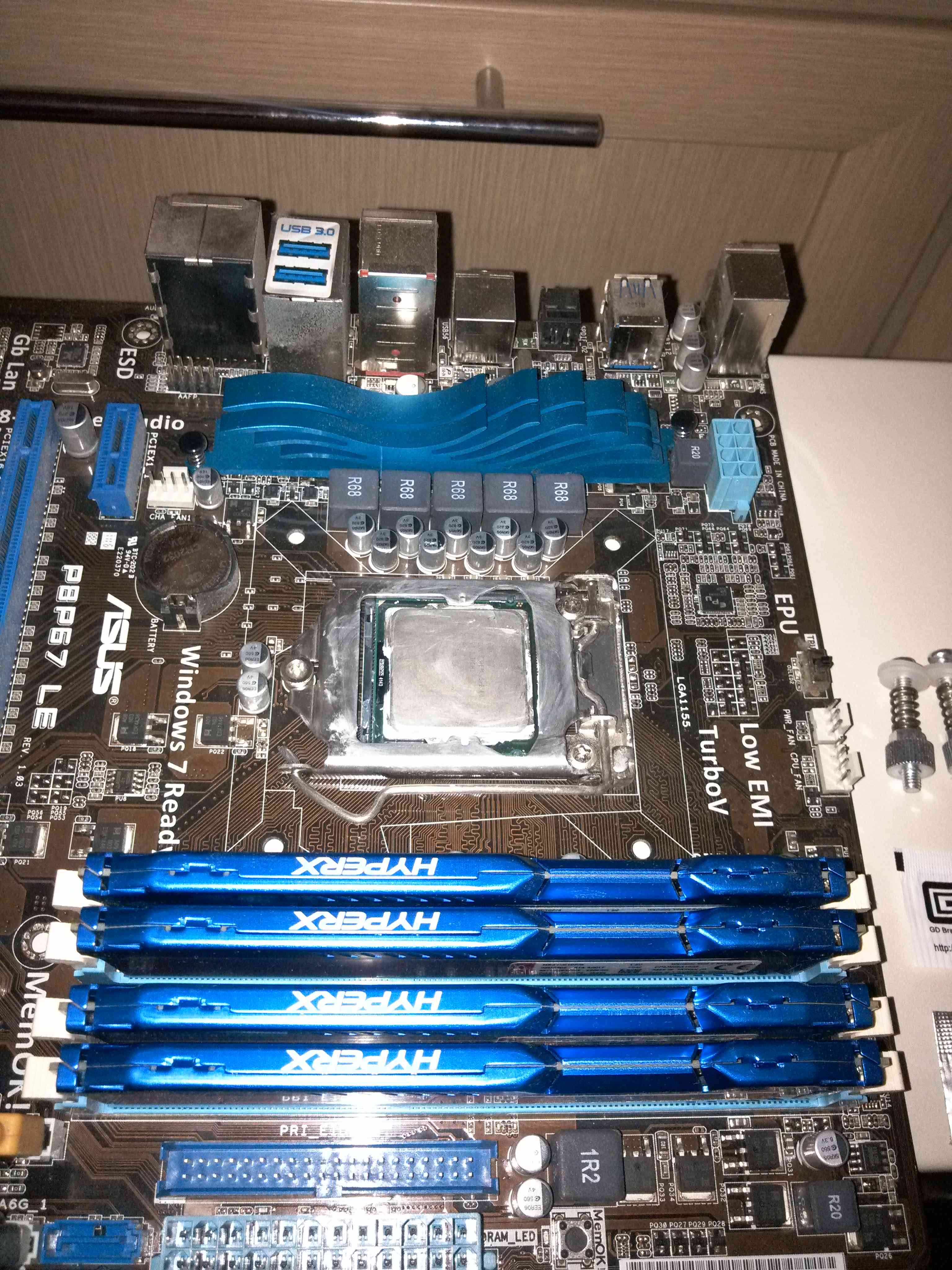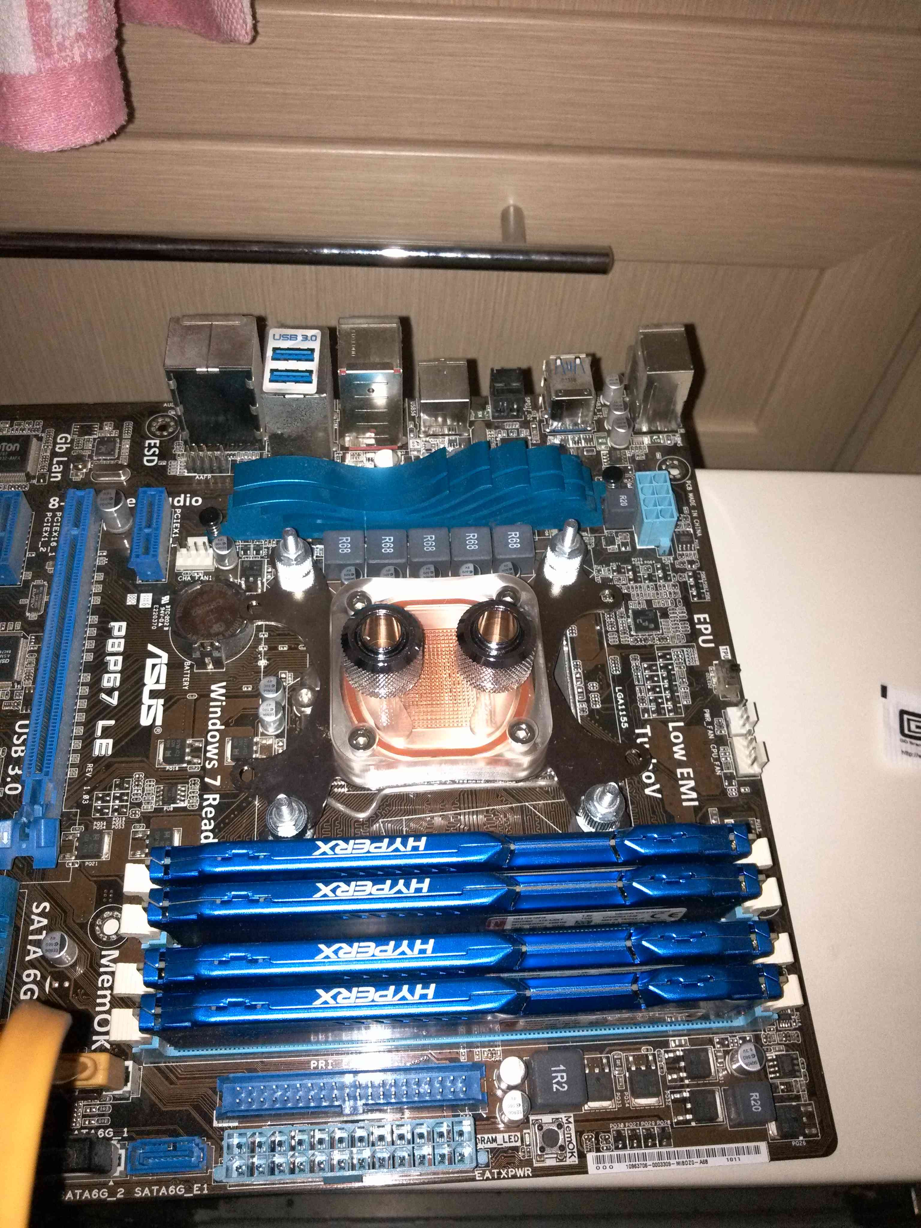 Один теплообменник собран. Второй собрал аналогично. Разкурочил корпус. Пришлось на задней стенке сверлить 5 отверстий для шлангов и проводов. Максимум осилил 18мм. Больше не было сверла. Водоблок на процессор. Плата ASUS P67 LE с процом I5 2500 и памятью 4*4Gb Kigston теперь с водоблоком и фитингами. |