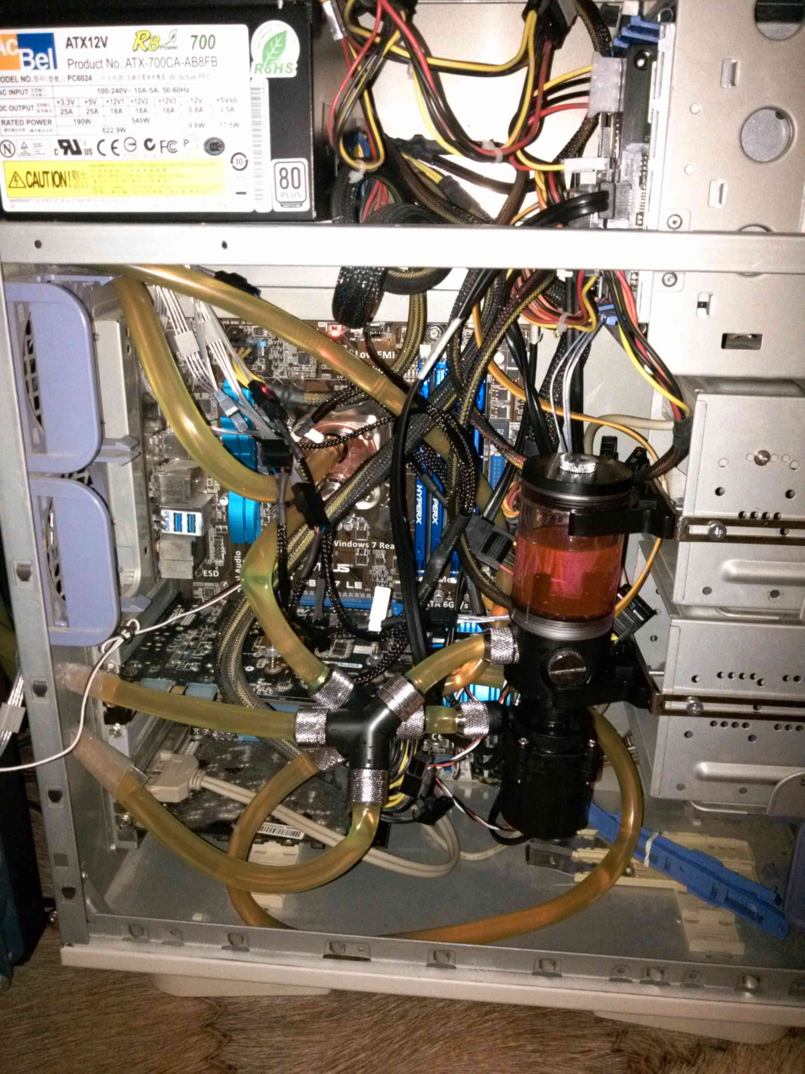 прикрутил радиаторы, вкрутил плату, видеокарту, диски, БП, провел все кабели. Прикрутил помпу с расширительным бачком на 100мл. И потом стал прокладывать шланги. Получилось примерно так. Вода с помпы через тройник идет на процессор и видеокарту. Далее нагретые потоки идут каждые на свой радиатор. После радиатора через тройник в бачок расширения помпы. Для управления куллерами PWM использовал хитрые кабели 4-1 с питанием от БП. прикупил 2 шт. Один подключил управлением на CPU FAN и вентиляторы от радиатора проца. Второй подключил на видеокарту, куда подключались стоковые куллеры, и вентиляторы радиатора видюхи. Т.е. у меня оба радиатора управляются отдельно. Долго мучался, что использовать под теплоноситель. Спирт, вода, антифриз. Решил для себя, что первые два не подходят, плохая теплопроводность и коррозия элементов алюминий-медь, медь-сталь и т.д. Выбрал антифриз. А он оказывается токсичный. В итоге нашел не токсичный вариант VW G13. Развел его 2/3 антифриза +1/3 дистилированной воды. Прокачал систему. И тут появились микропротечки с фитингов на помпе. Пришлось все фитинги прокручивать до упора. Неделю корпус не закручивал и гонял систему. Искал утечки. Но вроде все нормально. Процессор теперь выше 55-60 градусов не кочегарится. Видеокарта 54-57градусов в пике. Температура набирается оочень медленно. А при снятии нагрузки падает практически сразу - проц 35 градусов, видеокарта 28 градусов. И главное помпы и куллеров практически не слышно. |
