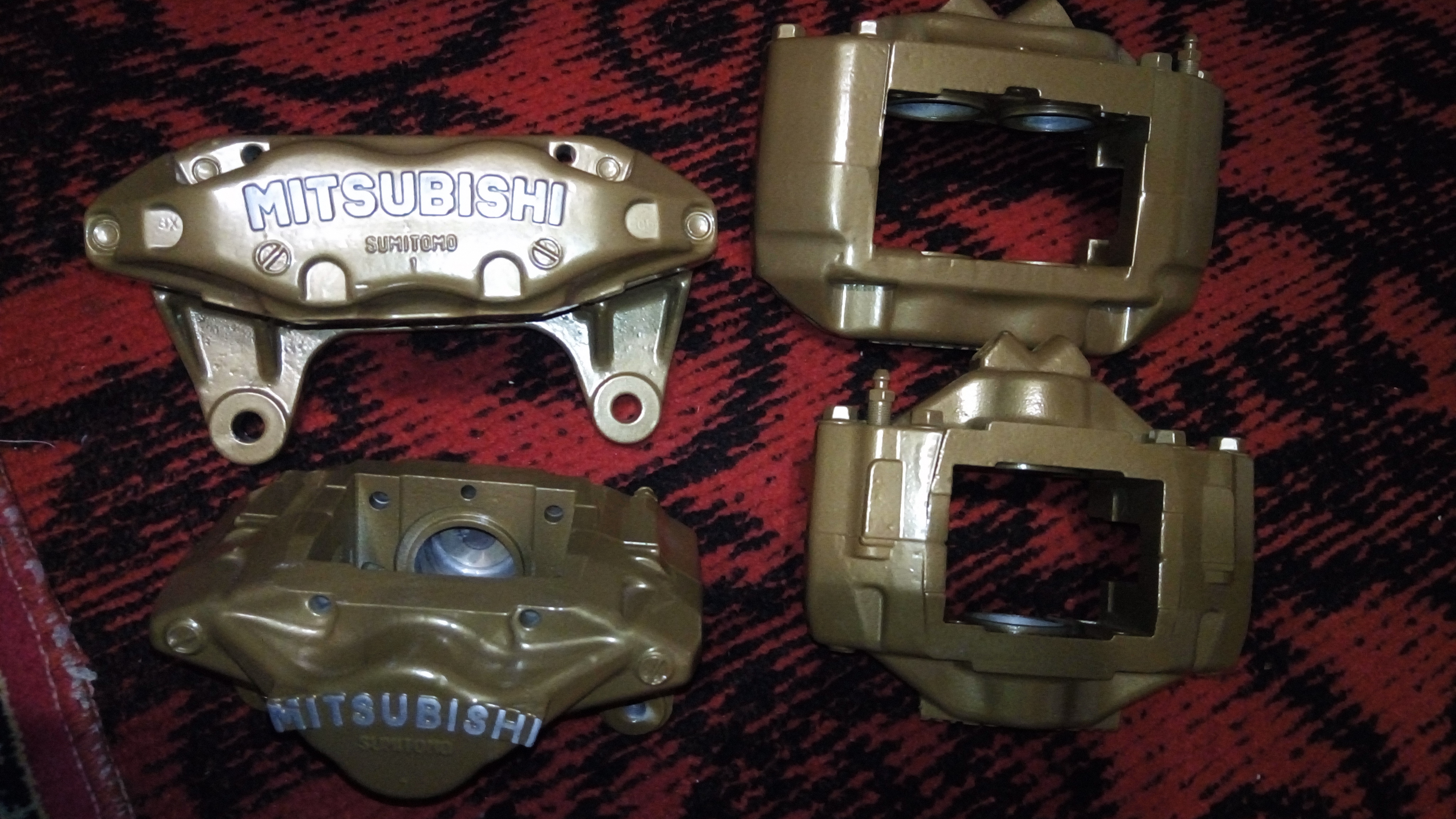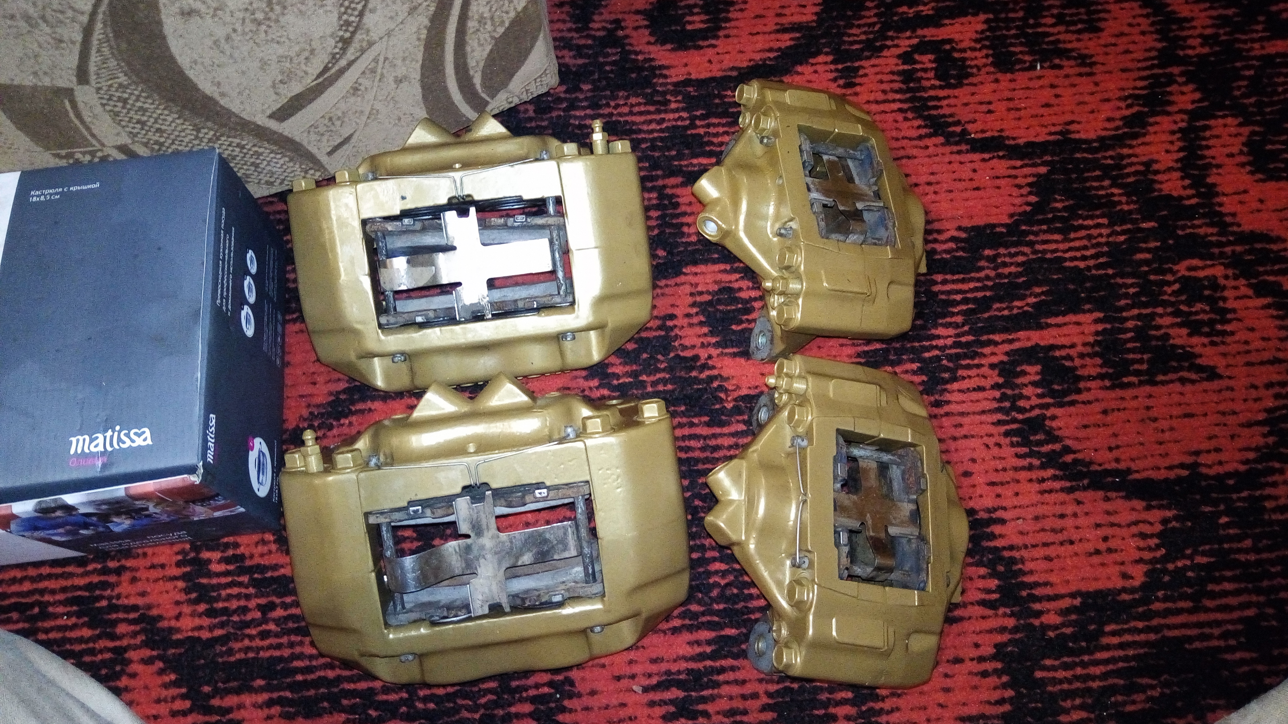 6) Комплект тормозных суппортов от ГТО рестайла. Перед 4пот с проставками в комплекте, зад 2 пот, покрашены в золото порошком — 22000 Привет. Суппорта влезут в 16"? |