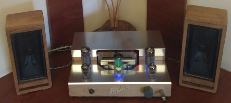 Готово (IMG:style_emoticons/default/smile.gif) От разъема типа СГ отказался ввиду его отн. больших габаритов, все остальное как было задумано - дерево, алюминий, тумблер, ручка регулятора, динамики, etc., ничего современного... (IMG:style_emoticons/default/smile.gif) Деревянные планки - вишня, покрытая легким слоем льяного масла, так, чтоб ничего не блестело, но текстура подчеркивалась. С динамиками еще окончательно не определился, желательно-бы помощнее, чем те, что на фото, но таковых пока нет в наличии. Надо прошвырнуться по барахолкам, поискать старые советские, т.к. современные опять-же не хочу использовать.
