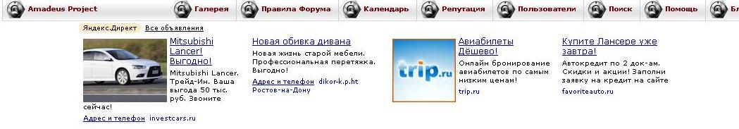 Витя, убери пожалуйста рекламу вверху форума! Я не знаю что она тебе даёт - деньги за каждый клик по ней, или тебя заставили для продвижения твоего сайта эту бредятину повешать. Или ещё как то вынудили.. Но смотрится, ужас как инородно и плохо. На кой ччорд, на сайте технических маньяков, реклама магазина немецких шмоток ЛАМОДА, реклама Шкода Октавия. Ну и Рено Логан, меня тоже никак не возбуждает. Дело конечно твоё. Ты босс, и сайт твой. Тебе решать. Йо, как меня может кто-то вынудить? (IMG:style_emoticons/default/smile.gif) Я уже говорил - веду эсперименты, если обращал внимание, каждую неделю идет чуть другой формат. Что показывает в рекламе - это контекст, зависит обычно от предпочтений пользователя - что он искал в интернете до этого (IMG:style_emoticons/default/wink.gif) Я так думаю, что в конечном итоге, после окончания экспериментов (мне нужно много статистики) - оставим рекламу видимой только незарегистрированным на форуме, как-то так (IMG:style_emoticons/default/smile.gif) А пока что - сорри за неудобства.. (IMG:style_emoticons/default/smile.gif) |