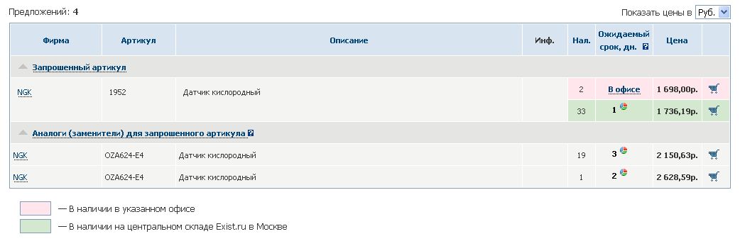 Faraon-9, проще на разборке или у кого может валяется с дохлой лямбдой.. (IMG:style_emoticons/default/smile.gif) RN6LEA - оно же, на фото в первом посте темы видно - на коробке написано NTK OZA624-E4 и 1952 - по любому коду должно пробиваться. Главное - смотреть что внутри, чтобы четко фоткам соответствовало (количество и форма отверстий на конце "носика" лямбды) - подделок море сейчас ходит.. Да Вить только глянул по экзисту действительно дешевле на 37 копеек, чего ты раньше не сказал. (IMG:style_emoticons/default/pardon.gif) Да меня этот магазин с каждым разом удивляет. |
