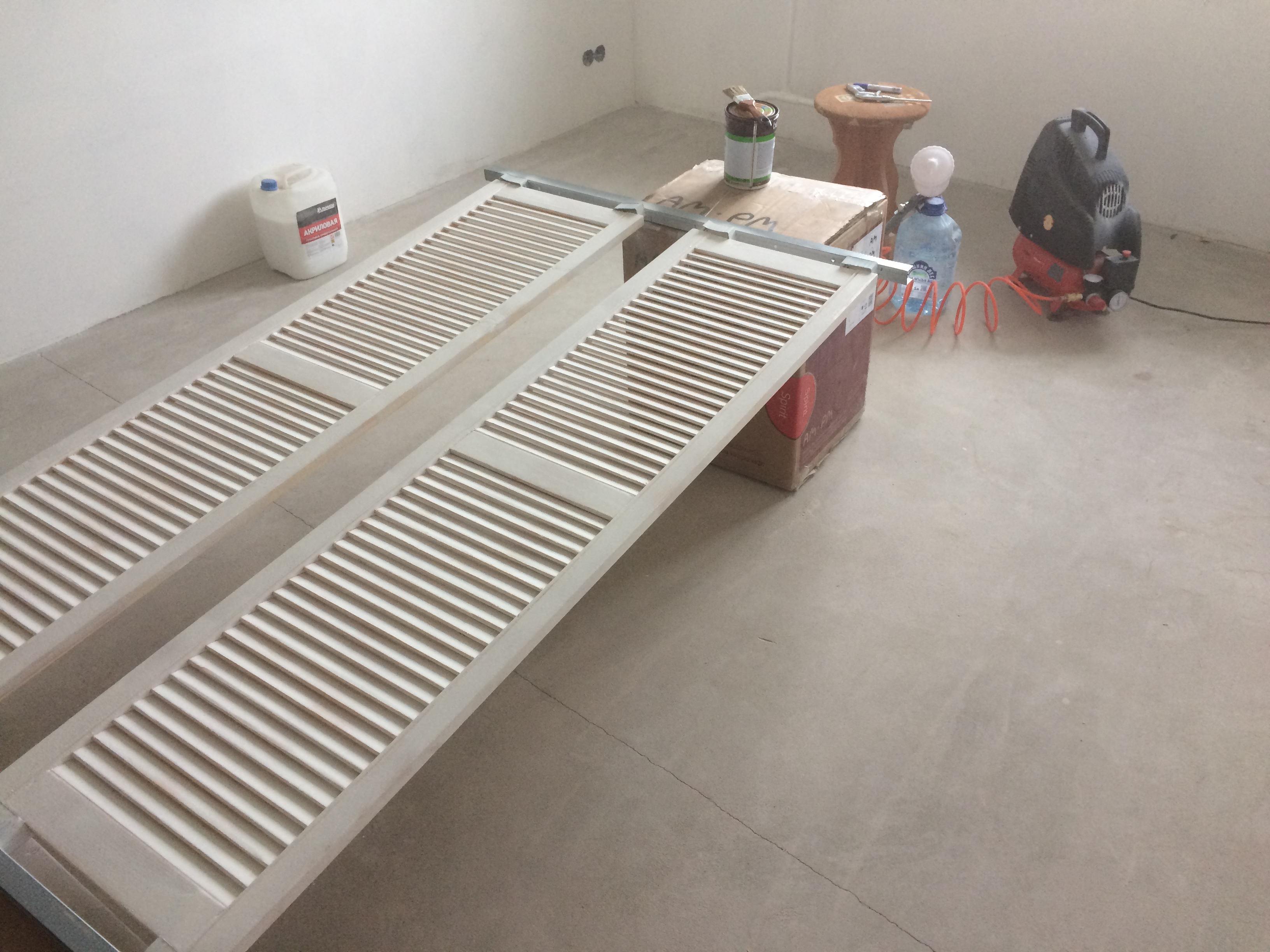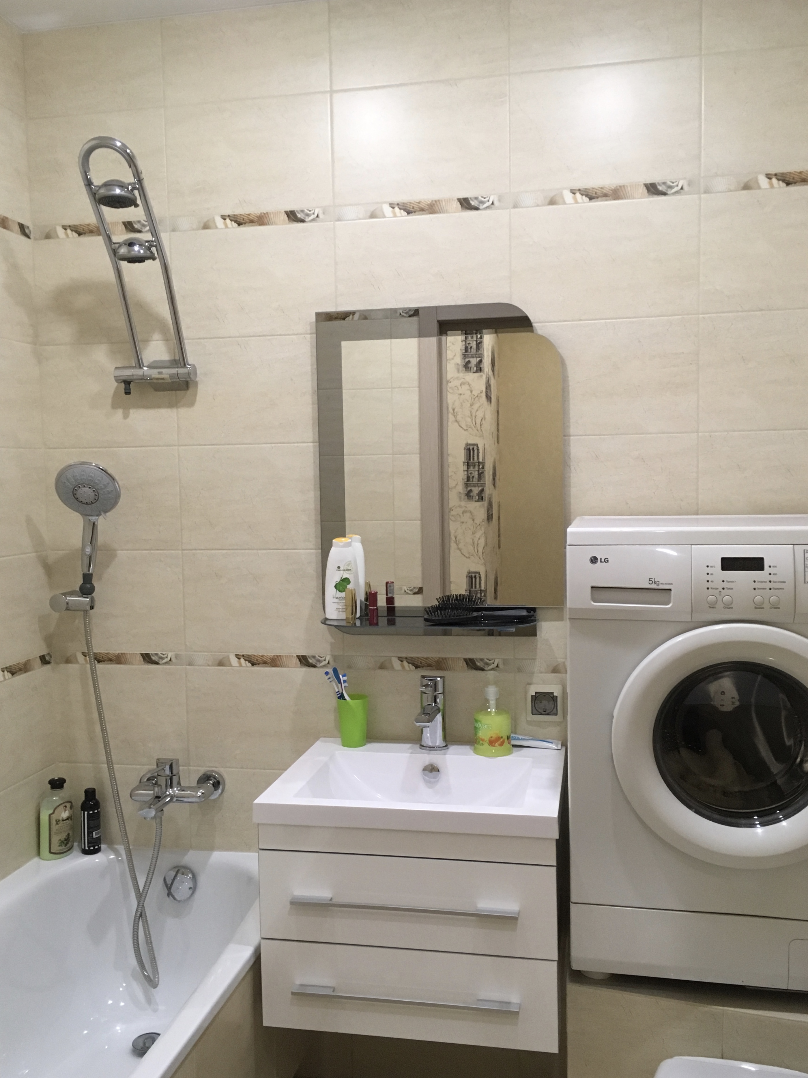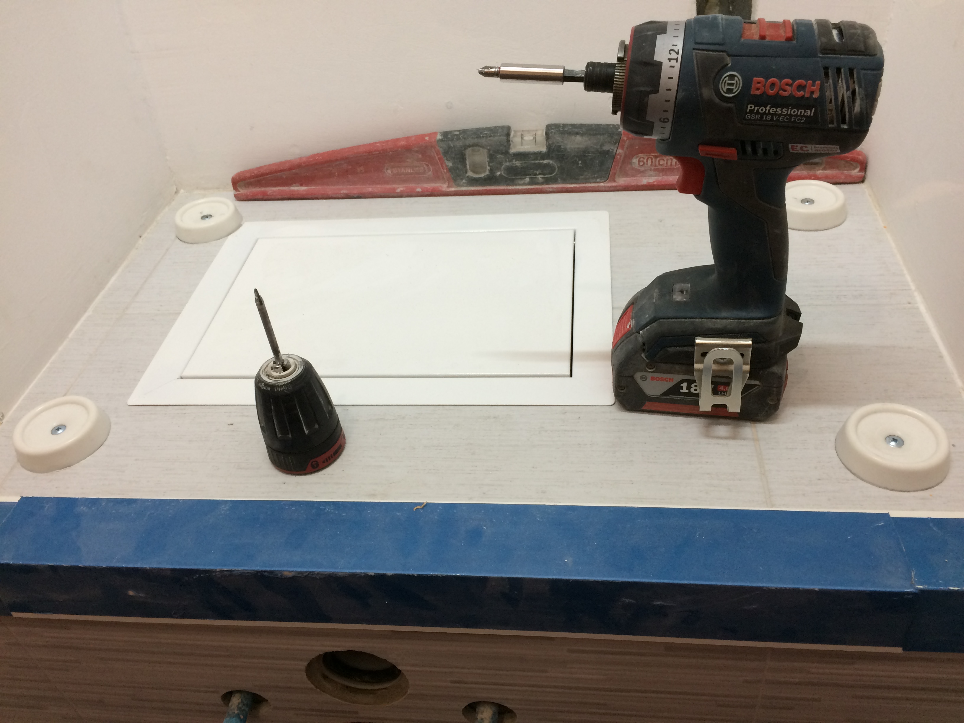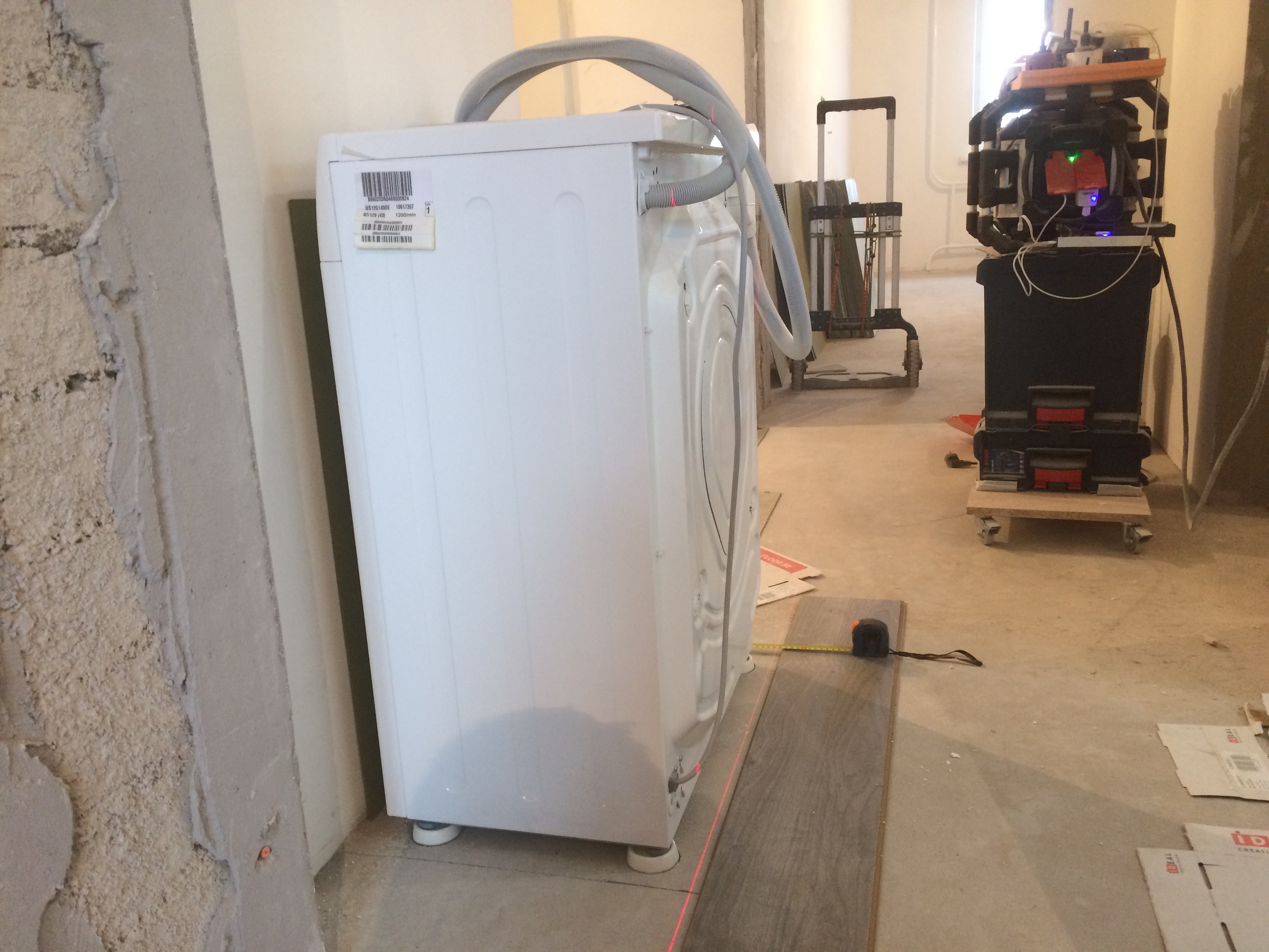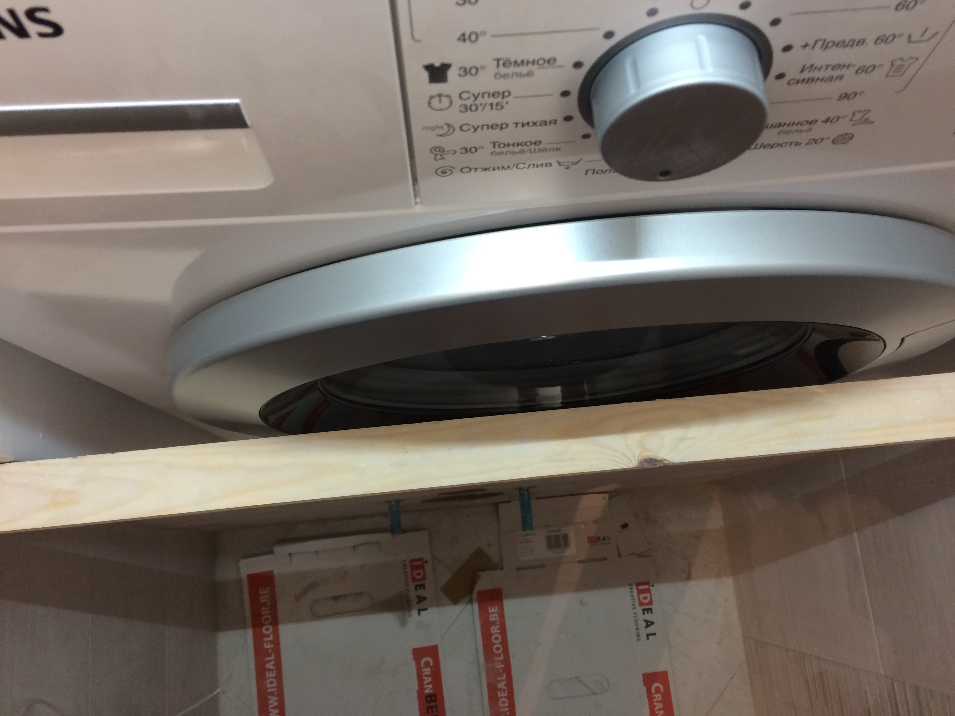 Продолжение следует! (IMG:style_emoticons/default/drinks.gif) Продолжаю!! (IMG:style_emoticons/default/smile.gif) Для покраски створок было куплено вот такое покрытие Краскопульт толком не понадобился, всё замечательно наносится кисточкой! Было нанесено три слоя с подшкуриванием выступающей ворсы, по слою в сутки.Вот здесь два слоя: Пока створки окончательно подсыхают, готовим машинку к установке на подиум. Снимаем транспортные стопорные болты, при необходимости удлиняем сливной шланг. Размечаем места для ножек машинки. В вариантах, когда габариты ниши не сильно "зажимают" машинку, разметить посадочные места проще простого! Достаточно положить в нишу родной пенопластовый упаковочный поддон , и просверлить отверстия по центрам выемок для ножек в поддоне! Габариты поддонов по периметру всегда шире машинки на 1,5-2 см на каждую сторону , чего с лихвой хватает работающей машинке на "виброзазор" (IMG:style_emoticons/default/smile.gif) В данном случае машинке в нише очень тесно, пришлось "моделировать" нишу на полу, ставить машинку на шайбы , проецировать и центровать СТМ по габаритам ниши : При помощи тележки машинка "снята" с шайб, центра просверлены сквозь шайбы: Точки центров перенесены на подиум , просверлены , шайбы закреплены: Алгоритм подъема СТМ отработан. вдвоем как правило места недостаточно, так что всё самостоятельно! (IMG:style_emoticons/default/smile.gif) Если унитаз уже установлен, из поддонных досок делаю защитный короб, и через него перекантовываю. Сдесь же под край машинки, наклоненной на тележке подставляется шитроковское ведро, машинка выравнивается уже на ведре : ![]() Ну а дальше перекантовать уже не так и сложно ! (IMG:style_emoticons/default/smile.gif) : Машинка встала идеально! Зазоры по периметру на вибрацию достаточные!: Подключаем, наполняем, сливаем. Полоскаем/отжимаем сначала с одной вещью , затем с полной загрузкой проверяем поведение машинки при вибрации на полных оборотах. Осматриваем на отсутствие протечек. Чтобы при дальнейшей эксплуатации не пришлось вытаскивать из-за машинки завалившиеся предметы, примерно на этой высоте (по линии луча) будет полка: ![]() Запечатываем на время проведения работ по монтажу натяжного потолка: