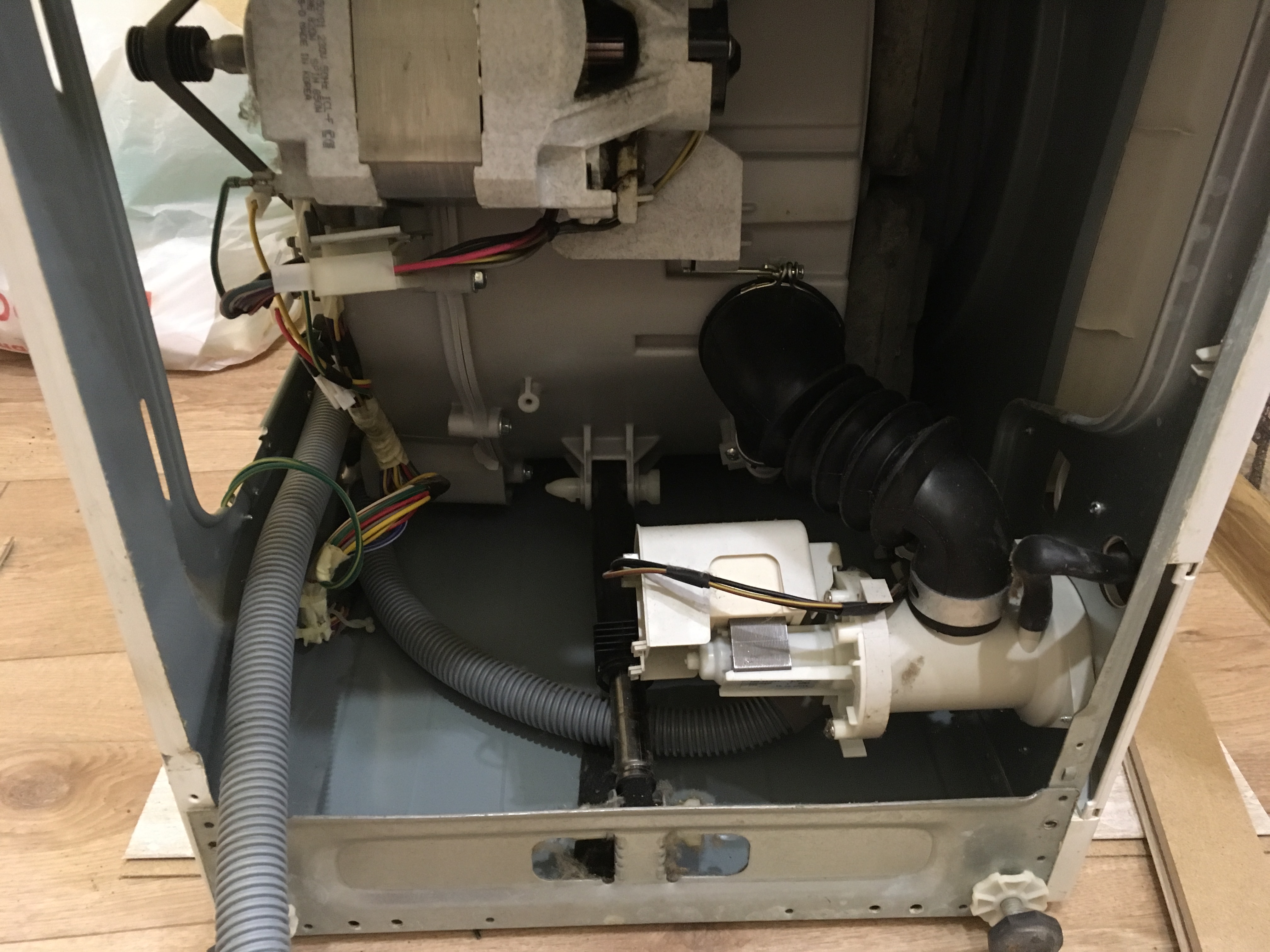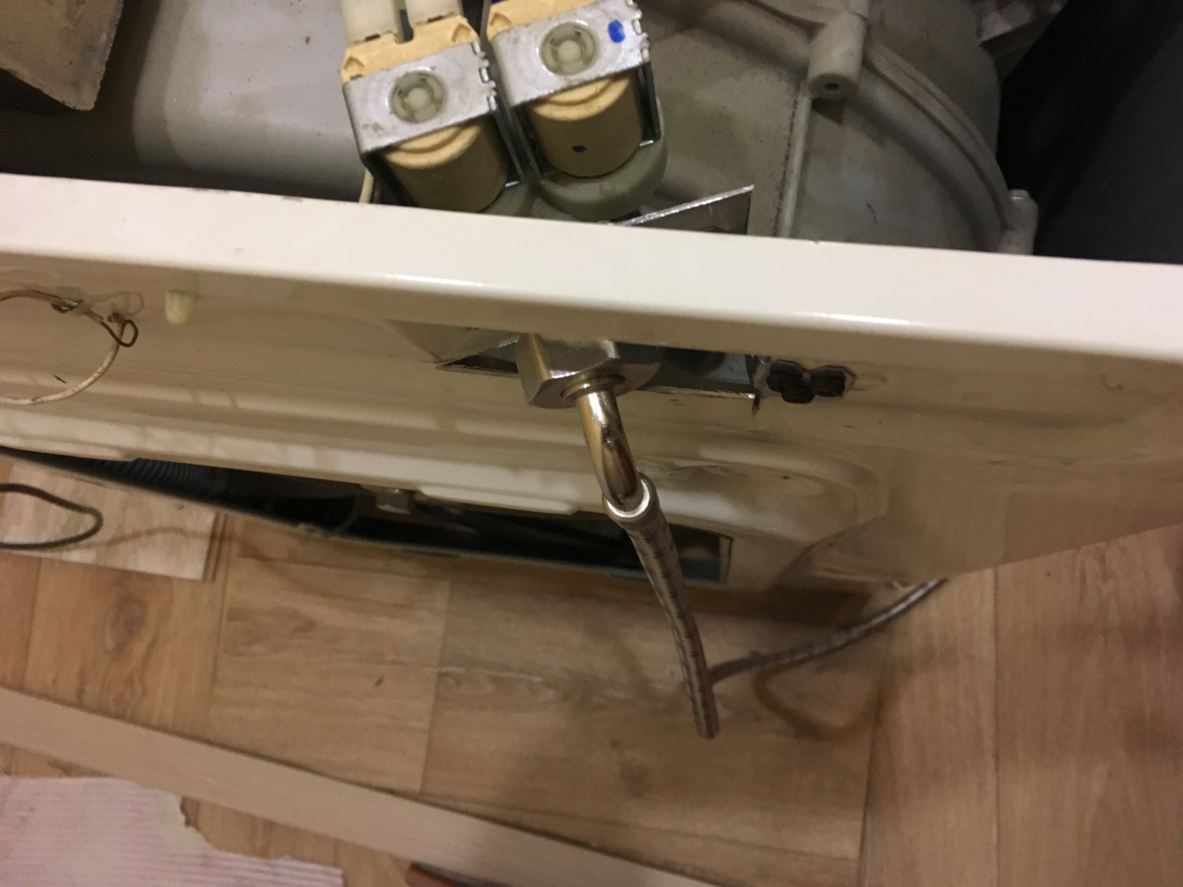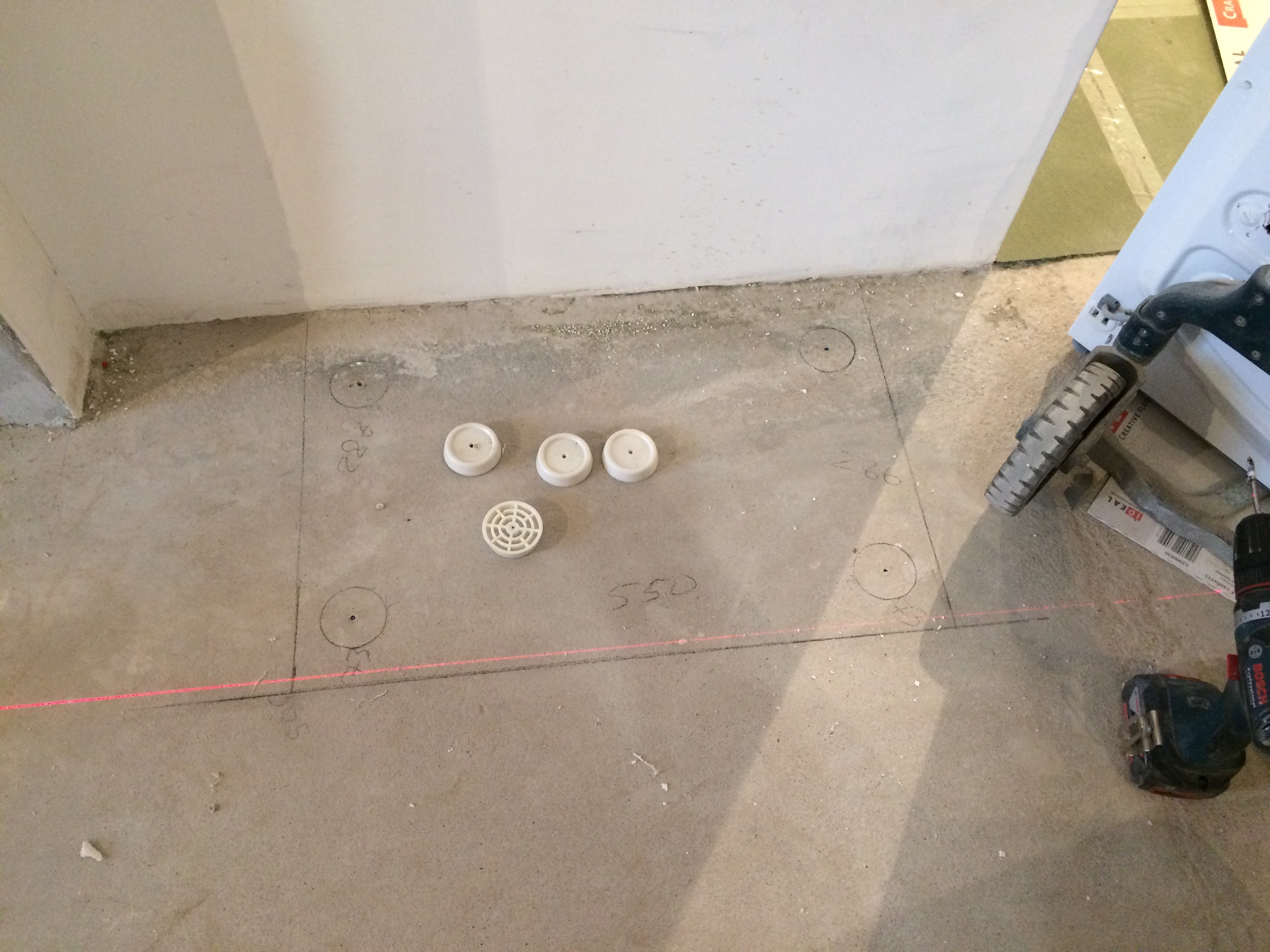 Т.к. к концу ремонта дата покупки новой СТМ пока за горизонтом, заказчиком было принято решение всеми силами временно взгромоздить старую! ( хоть она и больше той под которую строился подиум, а передняя левая нога сваливалась с подиума (IMG:style_emoticons/default/sad.gif) ). Габариты выступающих шлангов сведены до минимума, а именно: Сливной шланг уведен внутрь машинки с выходом из "дна" (IMG:style_emoticons/default/smile.gif) ( с обязательной петлёй чуть выше центра барабана, иначе наполнение бака может быть весьма проблематичным) : Наливной , увидев хоть и маленькую, но очень таки шуструю жену болгарина, любезно согласился чуть подвинуться вовнутрь : Ножка благополучно нашла новое посадочное место: .Методом переноса габаритов машинки на лист линолеума (можно картон и т.д.) с учетом допуска на зазор по периметру ( + 10-15 мм на каждую сторону) и " обрисовав " шайбы под ножками , был изготовлен установочный шаблон, по которому с последовательной фиксацией от смещения , как минимум по первым двум, сверлим отверстия : Просверлив центра сквозь шайбы с шаблоном, исключаем шаблон, дюбелим/прикручиваем шайбы; сверлим отверстие под сливной шланг: С помощью угло- и унитазозащитных приспособлений, а так-же некоторого количества волшебных слов, проговариваемых сливному шлангу при попытке договориться с ним войти таки в отверстие люка, нежно направляем машинку ножками в шайбы! : Подсоединяем, запускаем, проверяем, радуемся: