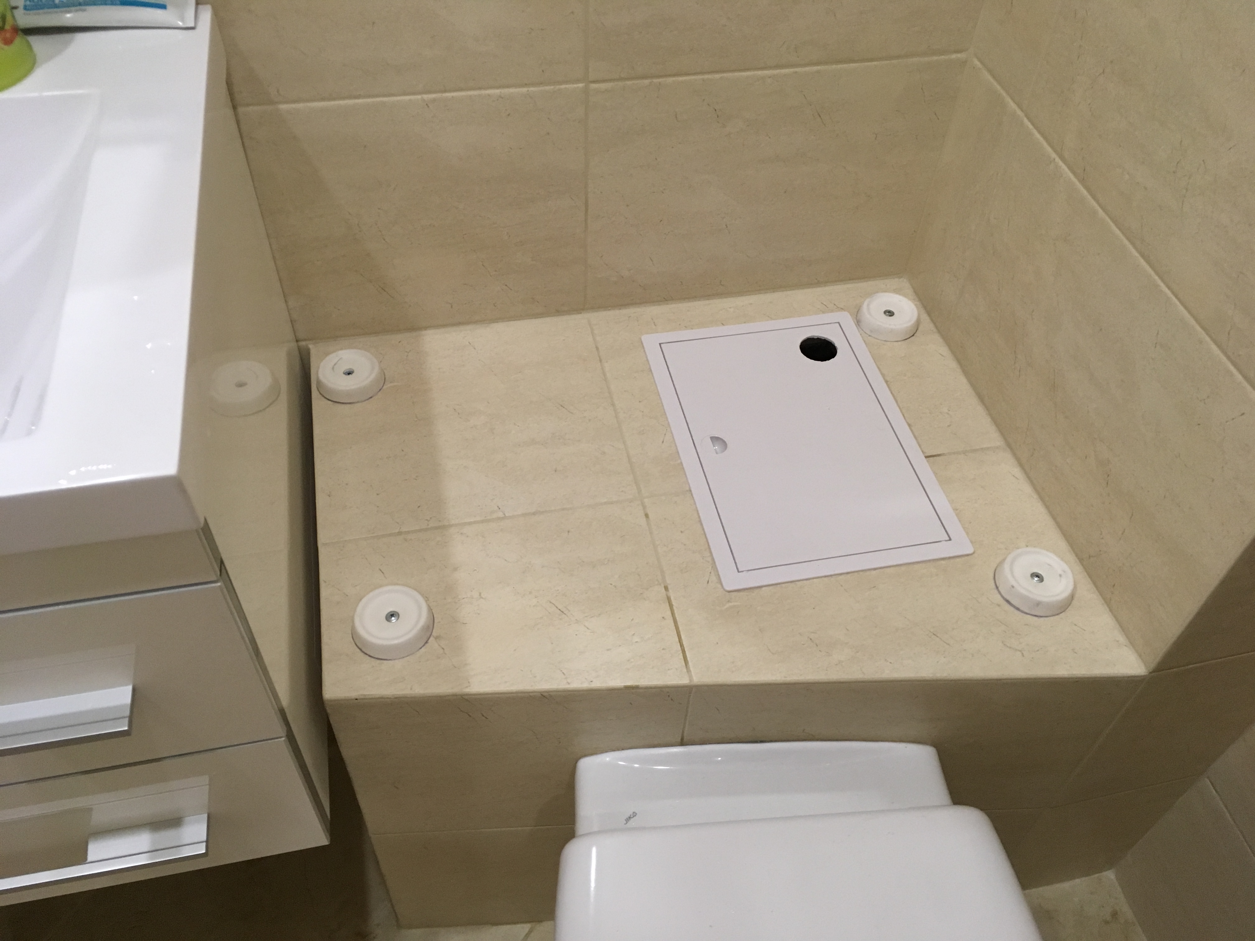 В данном случае такая возможность исключена, т.к. плита перекрытия заканчивается у вент.труб, верхний щит смонтирован с наклоном к трубам, вертикальные листы прикреплены к щиту. В случае возможного потопа сверху, вода найдет кучу щелей к соседям снизу, не намочив ни водонагреватель , ни стиралку! .
