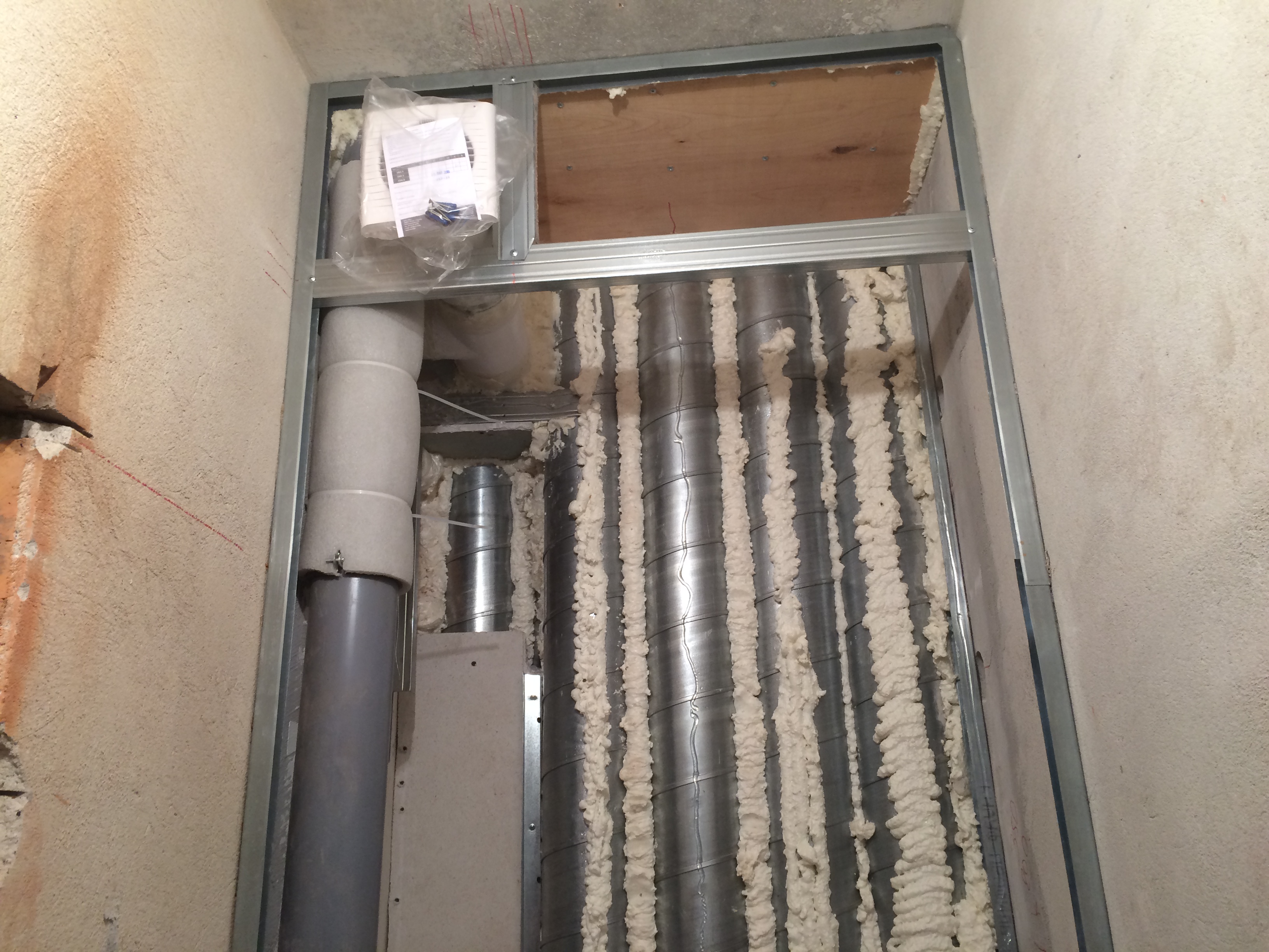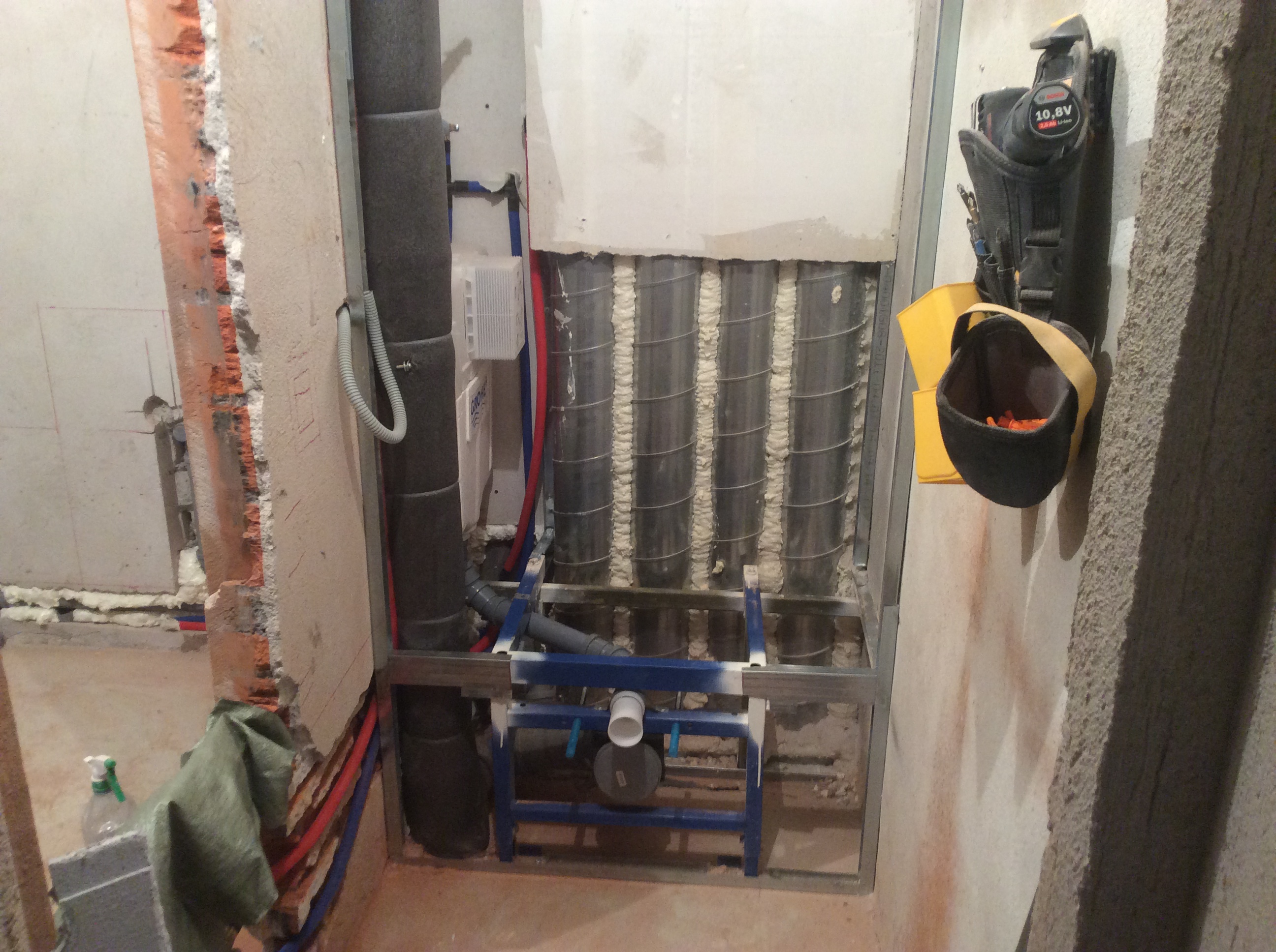 ( Написано-же , в готовом виде, - завтра ) ! (IMG:style_emoticons/default/smile.gif) (IMG:style_emoticons/default/drinks.gif) Олег, т.к. в борьбе за каждый миллиметр нагреватель закреплен через лист гвлв вплотную к вент.коробам (обрешеткой и собственно жесткостью для гвлв являются оц. трубы с притопленными в плоскость направляющими, технологического зазора меж ними нет) : И для того, чтобы сделать красивый выход труб из стены с отражателями , пришлось бы прорезать их (рискуя заиметь пробой трубы случайно не редко падающими кирпичами в вент.каналах!! ). ( С хозяйкой было обговорено, сказала что за порошками и при закрытых дверках подводку видно не будет! ) |