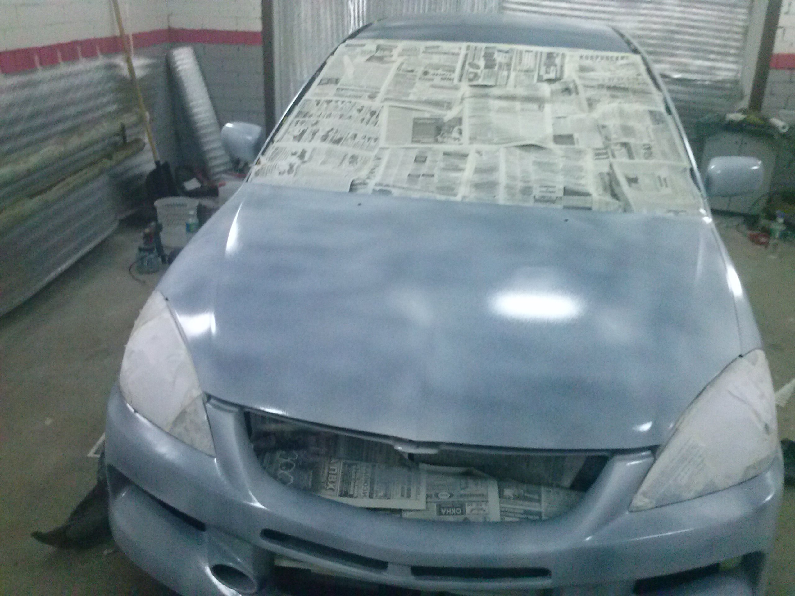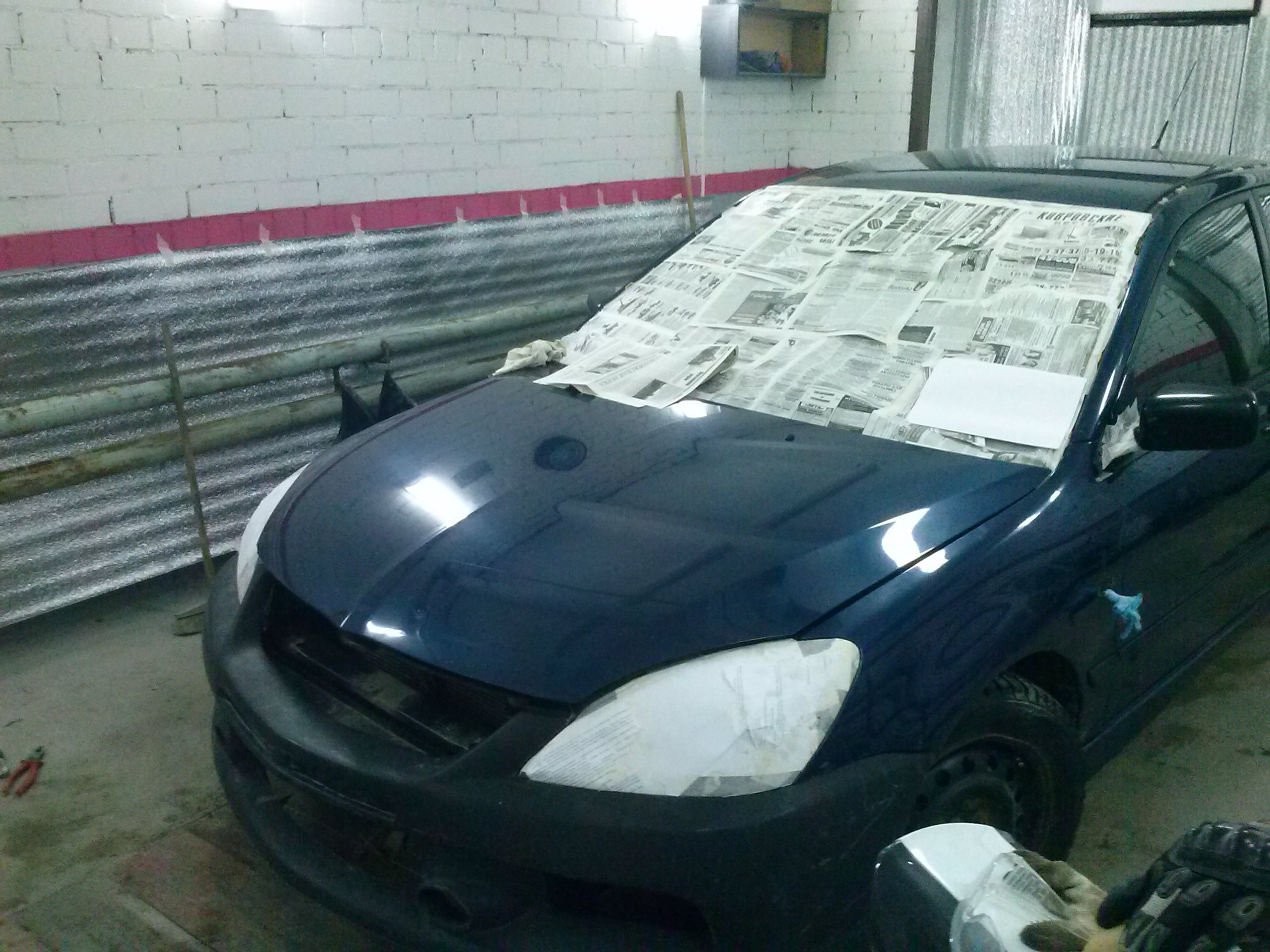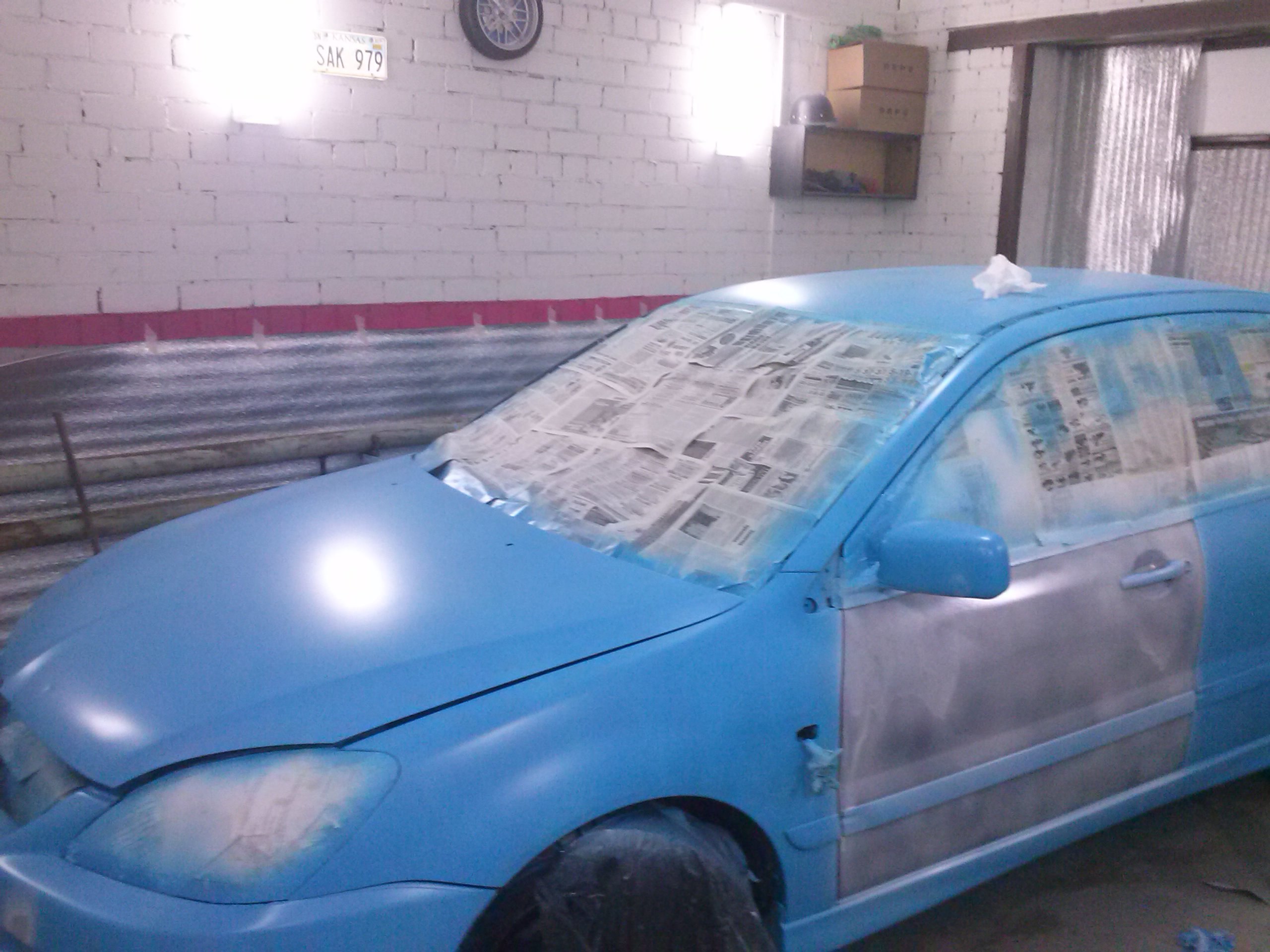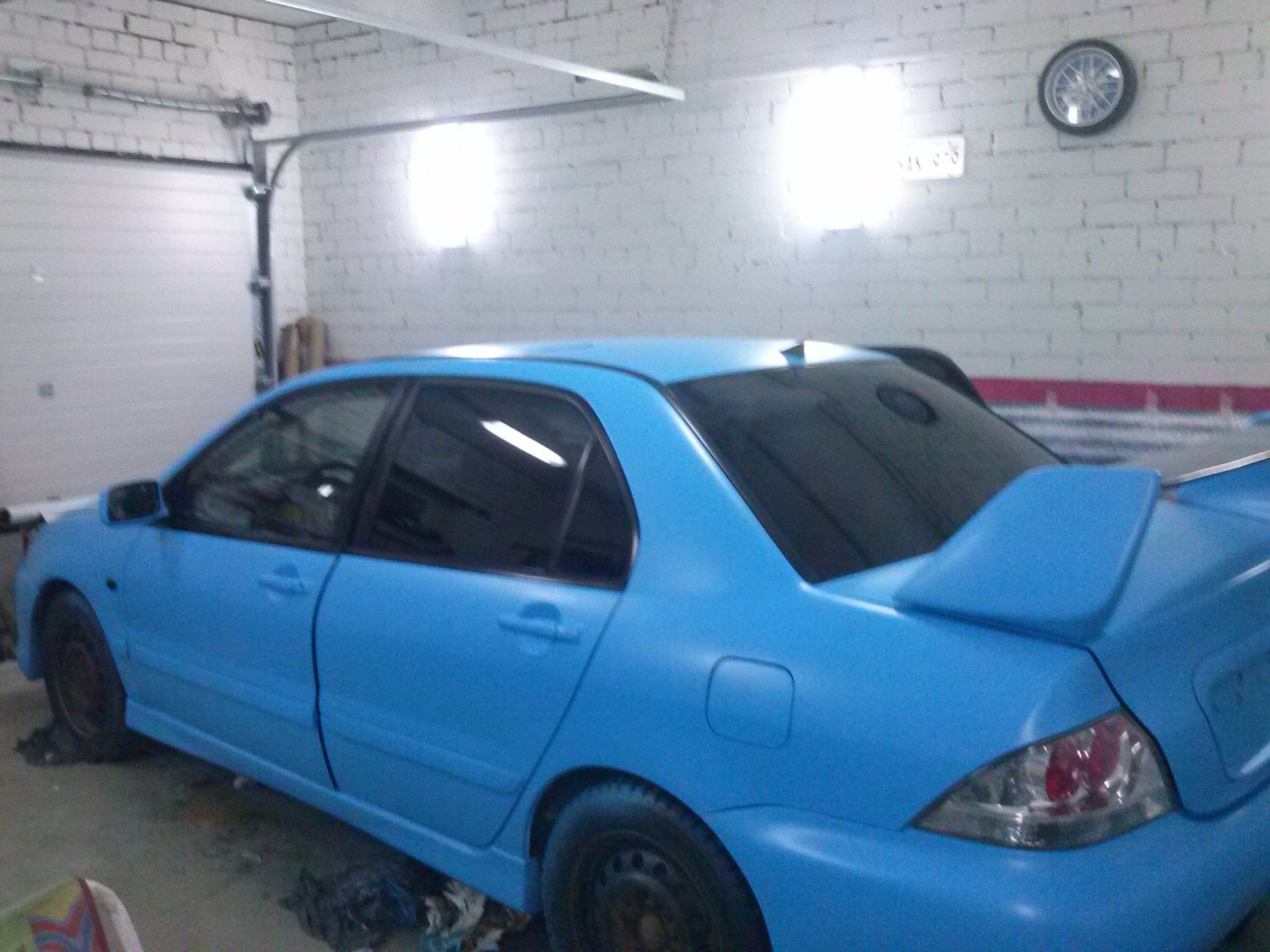 На Лансер ушло литра 4 краски. Наносилась сначала белая база в 3 слоя, потом столько же слоев голубой. Общая толщина ок. 0.2 мм. Наощупь - шершавая поверхность, похожа на мягкую пластмассу))) |