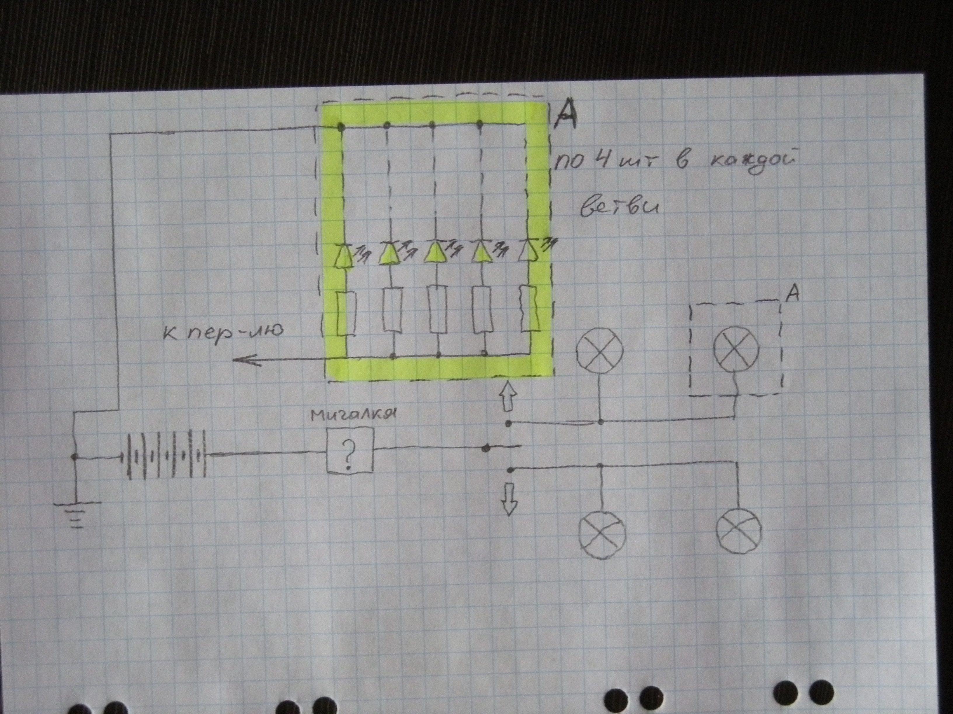 Серег, как продвигается восстановление? А то, смотрю уже тюнинг пошел (IMG:style_emoticons/default/biggrin.gif) Ну тема то изначально называеться модернизация и восстановление. (IMG:style_emoticons/default/wink.gif) Продвигаеться медленно но верно. Вот статья по теме. Только вместо лампочек надо подключить светодиодные цепочки. В этом случае и транзистор послабее можно поставить и без теплоотвода. Плюс бонус - режим аварийки (IMG:style_emoticons/default/smile.gif) Сергей спасибо! Значит паяю схему как в теме и цепляю светодиоды как я нарисовал? |