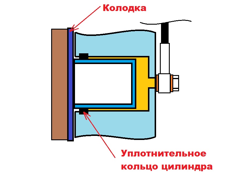 Поршень своей плоскостью точно центруется об поверхность колодки, поэтому стенками своими цилиндра не касается. Т.е. контакта метал/метал там физического нет. Желтым цветом изобразил тормозную жидкость. Короче собирать и пробовать сильно жать на педаль, от души. Если не начнет сразу течь, все будет ходить долго. |