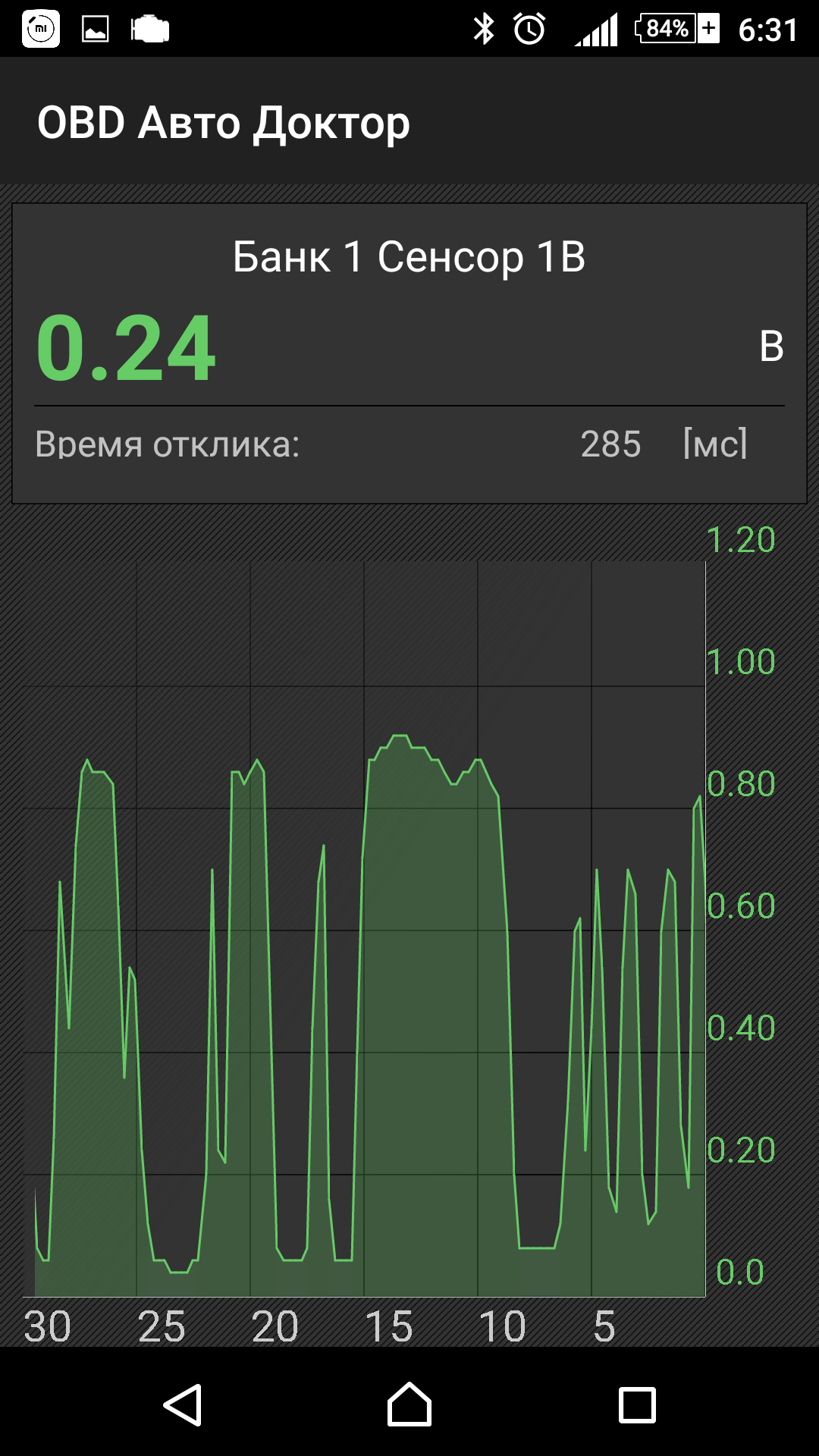 Вторая лямбда на ХХ (катализатор работает) выдает почти ровную линию где-то между минимумом и максимумом (на тех машинах, что через меня проходили обычно в районе 0.6-0.7 вольта)