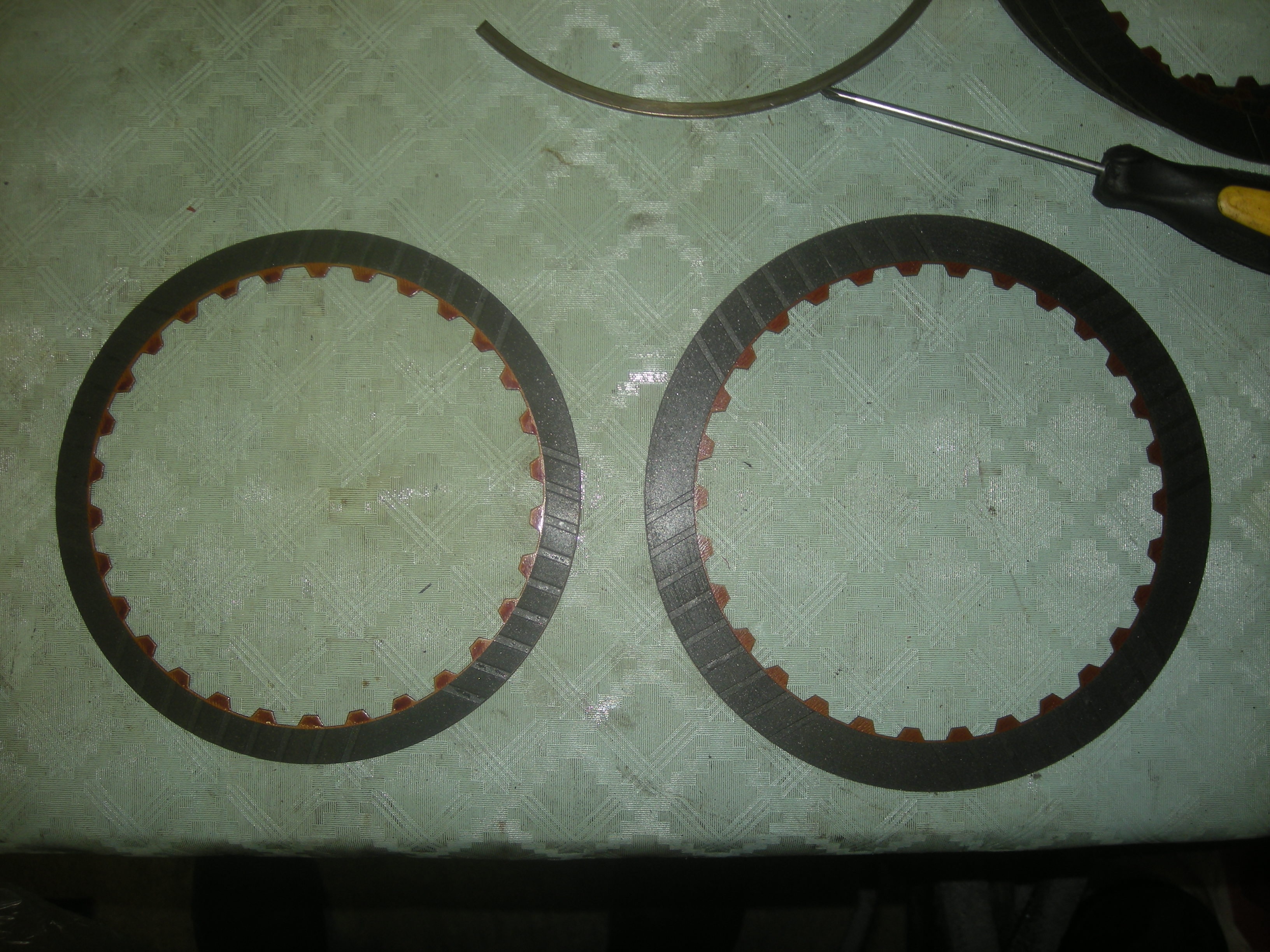 Фрикционы заднего хода. по краям видно выкрашивание. По толщине с 1.73мм до 1.35мм стерты. Чтобы понять насколько мощьнее 51 коробка - фотка фрикцыона Андердрайв слева 42 коробка, справа 51. Проведите аналогию со сцеплением от машины с МТ. И так все фрикционы в разы больше. Окончание работ запланировано на конец августа. Будут внедрятся новшества. (IMG:style_emoticons/default/wink.gif) |